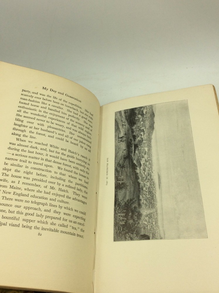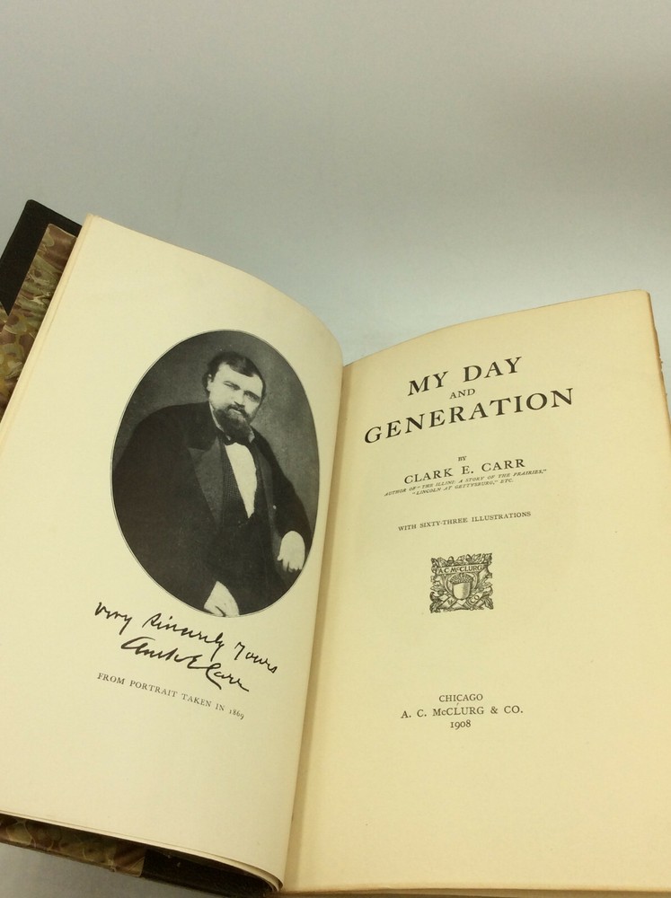 Clark E. Carr MY DAY AND GENERATION Chicago: A.C. McClurg & Co., 1908. 1st Edition. Leather. 452p. REBOUND. A hardcover book that has been rebound in 3/4 brown leather with marbled boards. Top corners crinkled throughout, affecting both the boards and pages. The back cover is visibly creased. Dime-sized scuff on front cover. Text unmarked and binding tight. Very good condition overall. Item #175188 The author's memoirs of his experiences with numerous important figures of American history, including Abraham Lincoln and other presidents, General Sherman, Henrry Ward Beecher, and many more. Illustrated with black and white plates.