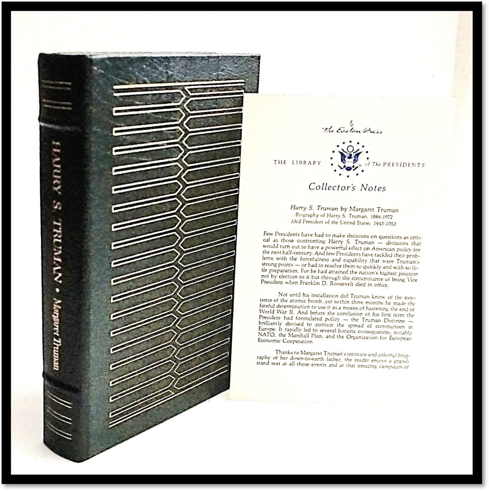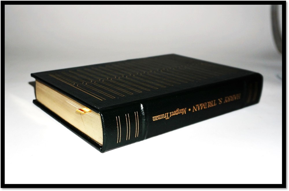 Building Your Great Collection; One Fine Book at a Time Harry S. Truman Truman, Margaret Norwalk: Easton Press, 1977 Publisher's dark-green leather with gilt decorations and titles; Five spine bands; all edges gilt. No Flaws or Blemishes but minimal shelf handling; Still Gift Quality. Appear unread. 602 pages with an index. Includes collector notes Fine / No Dust Jacket As Issued. Full Gilt Decorated Leather. The definitive biography of one of the most enduring political figures of the 20th century. Margaret Truman writes with unequaled insight and understanding about her father's extraordinary life and offers rare glimpses at the personalities and politics behind the world events of his time. A New York Times bestseller. Background Information: Mary Margaret Truman Daniel was an American classical soprano, actress, journalist, radio and television personality, writer, and New York socialite. She was the only child of President Harry S. Truman and First Lady Bess Truman. And Check out our other items ! Member of ABAA [American Booksellers Antiquarian Association] FABA [Florida Antiquarian Booksellers Association] IOBA [International Online Booksellers Association] The Ephemera Society of America Terms Guarantee We tend to be conservative in our grading, but even the best booksellers make an occasional mistake. Our books, and ephemera are described using AB Bookman standards. Our Guarantee: All items will be received as advertised and in the condition described. Any item is returnable for any reason within 30 days of receipt (prior notice appreciated). If you have questions regarding our description of any item, we encourage you to contact us prior to buying. We are members of the ABAA (Antiquarian Booksellers Association of America) and the Independent Online Booksellers Association (IOBA), and we adhere to these associations' strict ethical guidelines and conditions of sale. Shipping Standard shipping is by USPS Media Mail. Delivery typically takes 4 - 8 days (and sometimes longer) depending upon destination. We are happy to upgrade shipping to Priority Mail or to arrange overseas shipping to most foreign countries. Please choose that at checkout. Feedback We leave feedback for buyers once they have posted feedback for us. If you are unhappy with any aspect of a transaction with us, please contact us immediately. Our priority is to make customers happy and to resolve problems as promptly as possible. This listing was created by Bibliopolis.