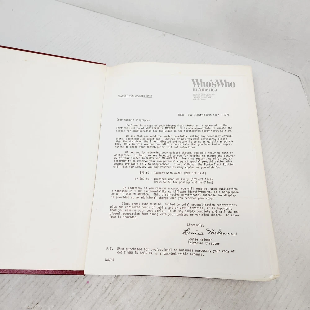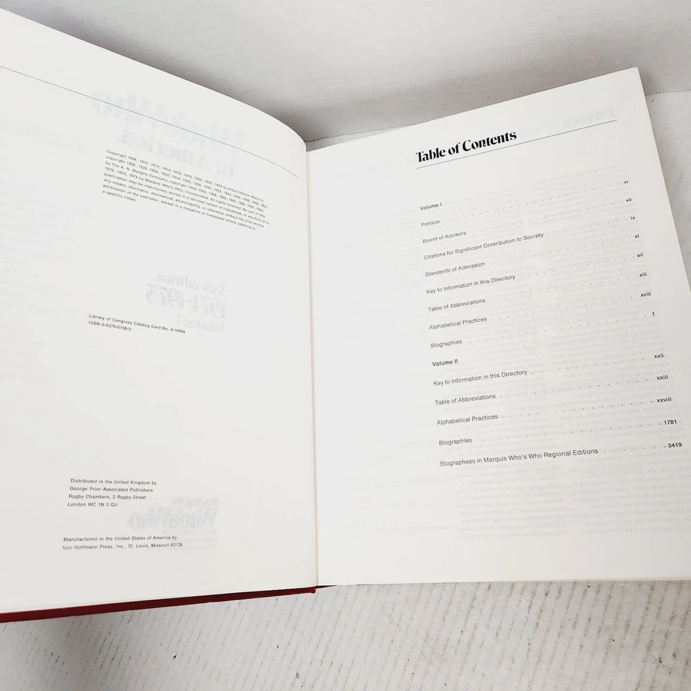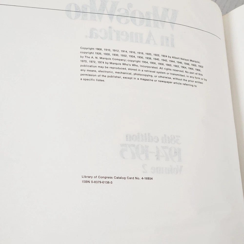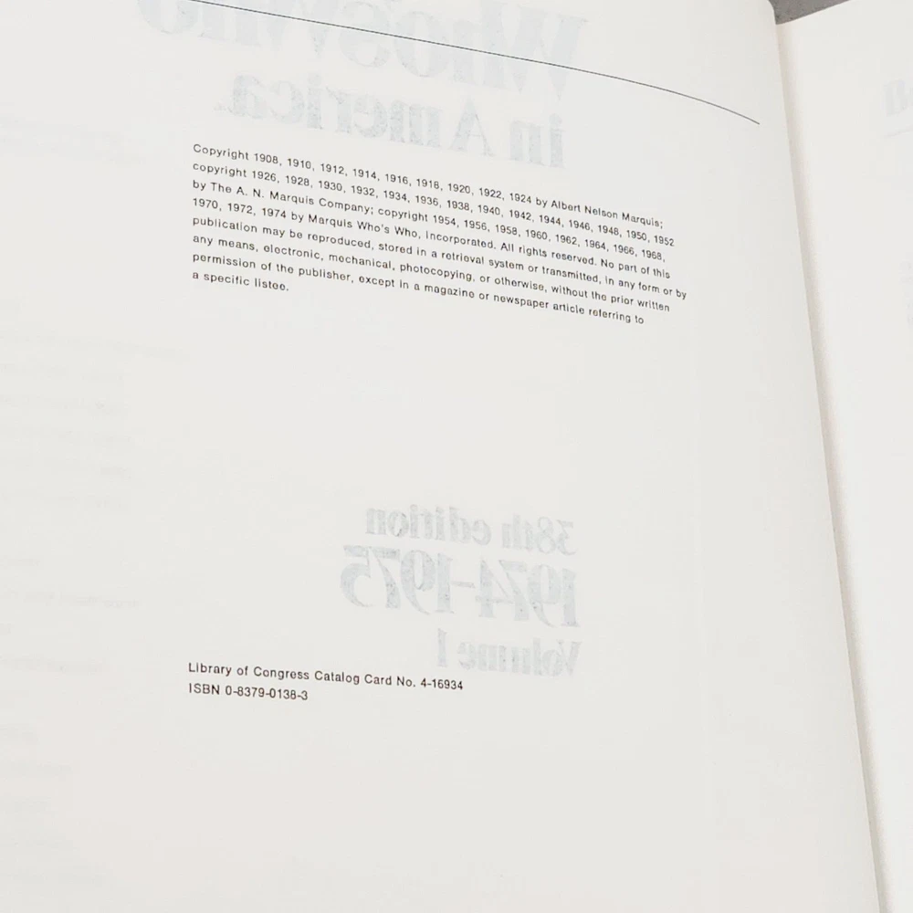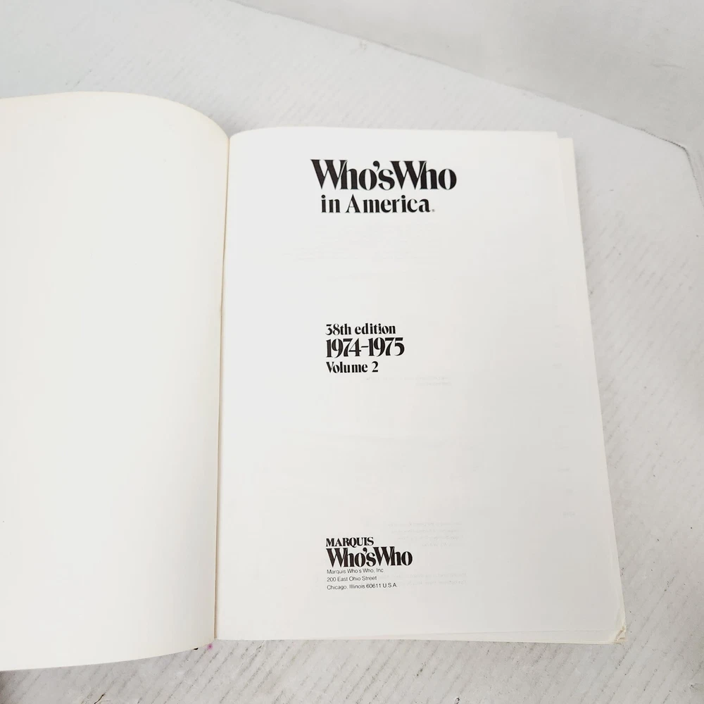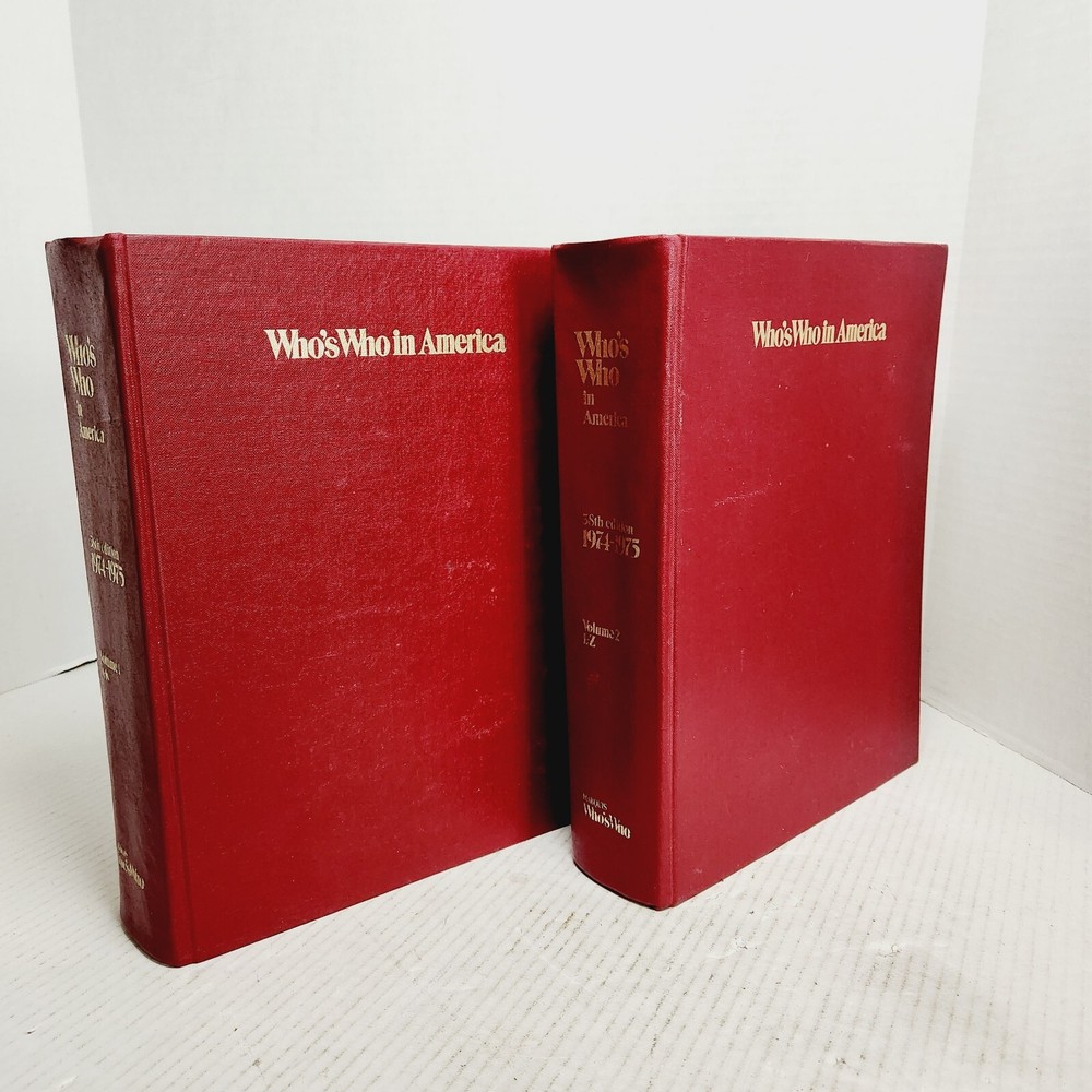 📚 Marquis "WHO'S WHO IN AMERICA" 38th Edition Volumes 1 & 2 - 1974-1975 VTG HC 📚 Description This listing includes a set of Marquis "WHO'S WHO IN AMERICA" 38th Edition Volumes 1 & 2 covering the years 1974-1975. These vintage hardcover editions are a comprehensive reference of notable individuals in America during that period. Condition Good used condition Signs of use and age consistent with normal wear and tear Gapping at the top between the backstrap and binding Wear to all covers Rippling to the text block All pages appear intact with little to no writing inside Features Historical Reference : A valuable resource for research and collectors Vintage Appeal : A piece of history from the mid-1970s See pictures for detailed item condition information. A classic addition to any library or collection! 📖✨ I will gladly provide additional photos upon request. Please make any requests PRIOR to purchase. We guarantee that all items we sell are as described and pictured in the listing. Any and all included parts or accessories will be described and pictured. If a part or accessory is not pictured and described, it is not included. For any parts being sold, buyer is to verify compatibility with their model. Returns will not be accepted for part incompatibility where the compatible models were clearly and accurately identified. All clothing, blankets and textiles have been laundered to eBay's sanitation standards. Pictures should be used for detailed item condition information. By purchasing or bidding, buyer acknowledges and accepts condition as represented in the listing photos.Buyer assumes any and all inherit risks that may arise from the possession and/or use of this item and agrees to hold the seller harmless. Buyer accepts the condition of this vintage lot in it's entirety and acknowledges that a purchase constitutes their acceptance of these facts. Please note that any unpaid items will have a unpaid item case opened with eBay four days after an item has been purchased. Please do reach out with any additional questions prior to purchasing or bidding! We appreciate your taking the time to fully read the description and consider this item prior to purchase! Happy shopping!