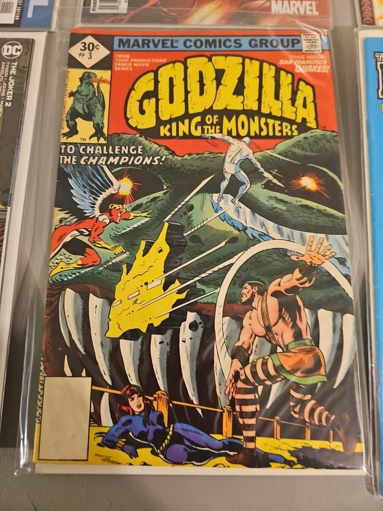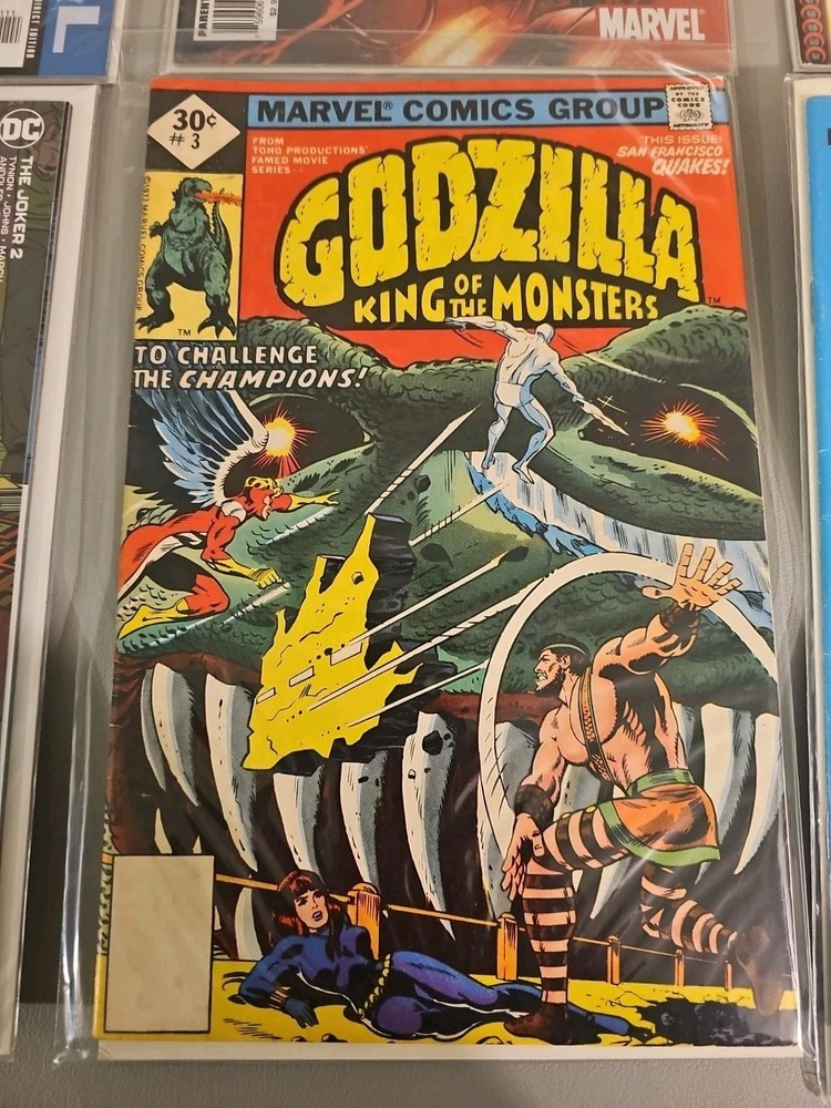 A vintage Marvel Comics single issue from 1977 featuring Godzilla and the Champions superheroes team facing off against S.H.I.E.L.D. It is a Whitman Variant with a color style and first printing. The comic is part of the Godzilla series within the Marvel Universe and includes artwork by Tony DeZuniga, Herb Trimpe, and Doug Moench. The cover art is also done by DeZuniga and Trimpe, making it a valuable addition to any comic book collection.