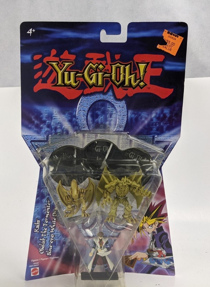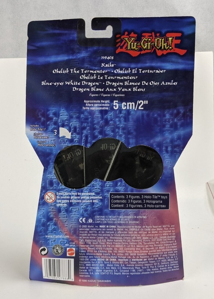 Mattel Yu-Gi-Oh! 2" 3-Pack Kaiba Obelisk Tormentor Blue-Eyes Dragon Packaged. The figure is fully sealed. But there's a bubble crack at the bottom of the stem.