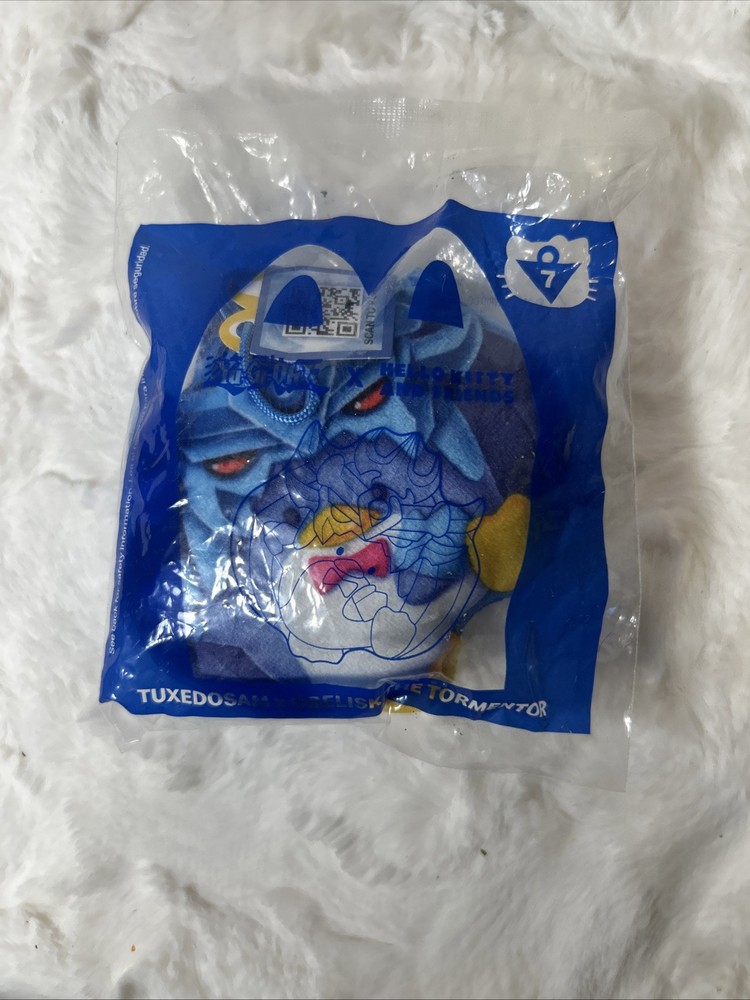 The product is a McDonald's Happy Meal toy featuring a collaboration between Yu-Gi-Oh! and Hello Kitty. It includes figures of Tuxedo Sam from Hello Kitty and Obelisk The Tormentor from Yu-Gi-Oh! This exclusive toy appeals to fans of both franchises and is likely to be a sought-after collectible among enthusiasts of animation art and merchandise.