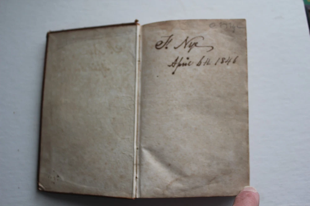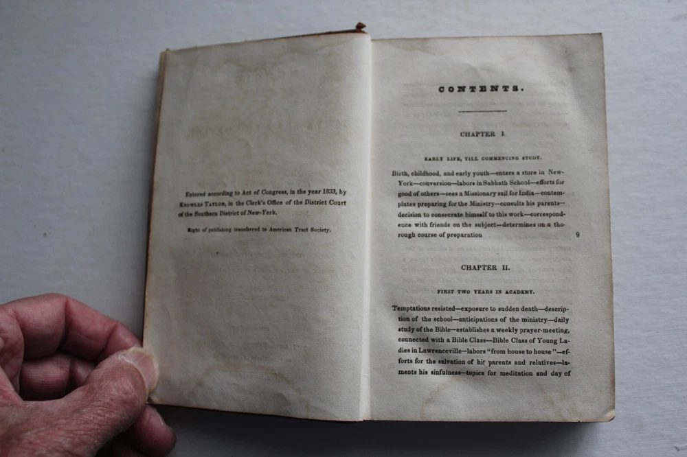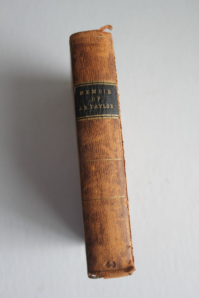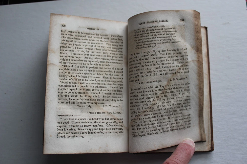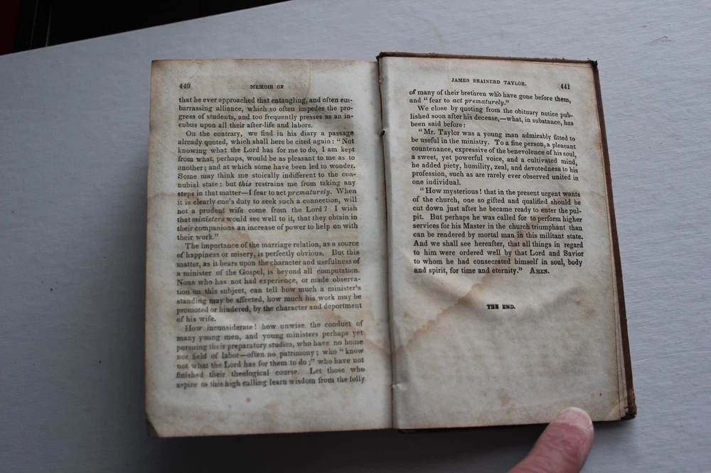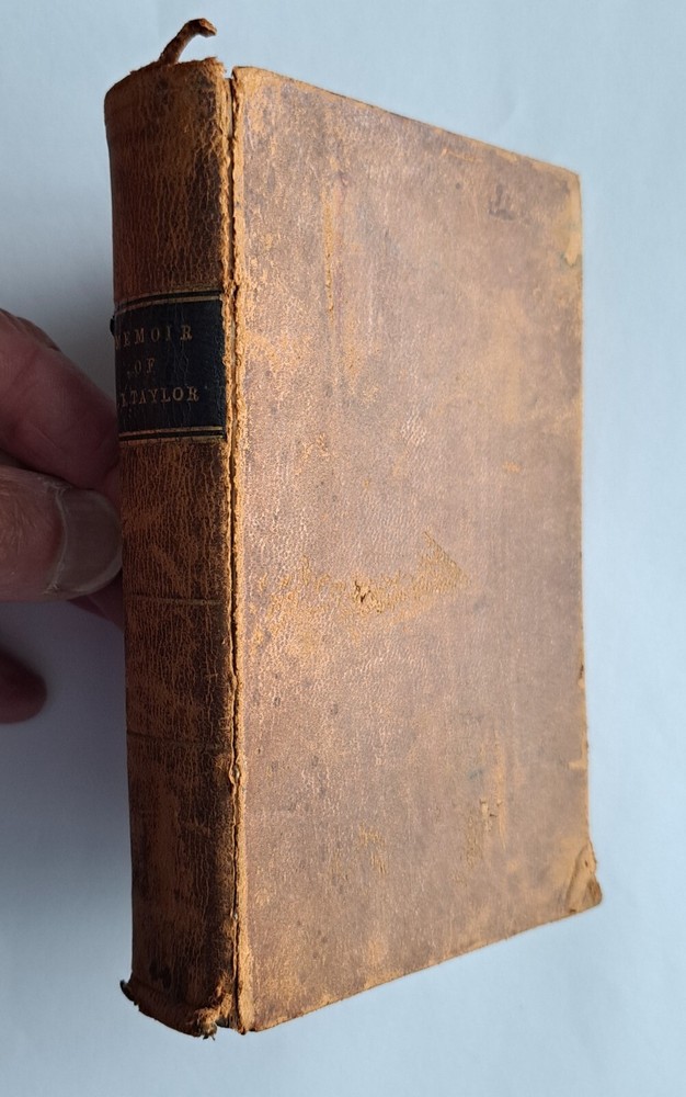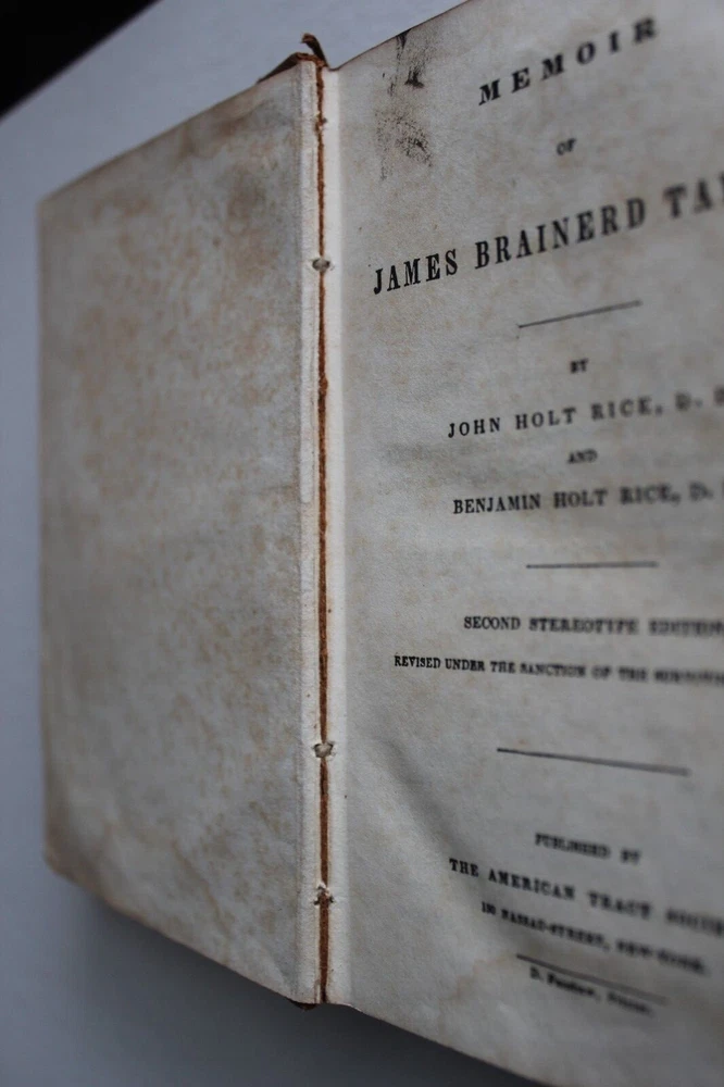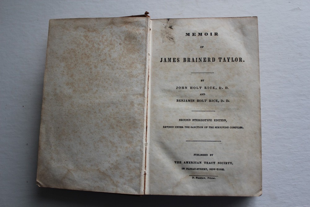Memoir of James Brainerd Taylor, Second Stereotype Edition, Revised Under The Sanction Of The Surviving Compilers. By: John Holt Rice, D.D. and Benjamin Holt Rice, D.D. Published by The American Tract Society, New York (1833). "Entered according to Act of Congress, in the year 1833, by Knowles Taylor, in the Clerk's Office of the District Court of the Southern District of New York." Not a reprint, but the original book from 1833. 441 pages, 6" x 4" x 1.25". In good condition, with firm binding. Slight separation of front cover from spine but the binding remains firm (see photo). No writing in the book except for the attractive signature of an early owner, "Nye, April 6th 1846" on the first page, which lightly bled to the blank second page preceding the title page. Foxing throughout the book, with pages 240- 441 being darker than 1- 239. See photos. Please message me if you have any questions or would like to see additional photographs before bidding. Thank you.