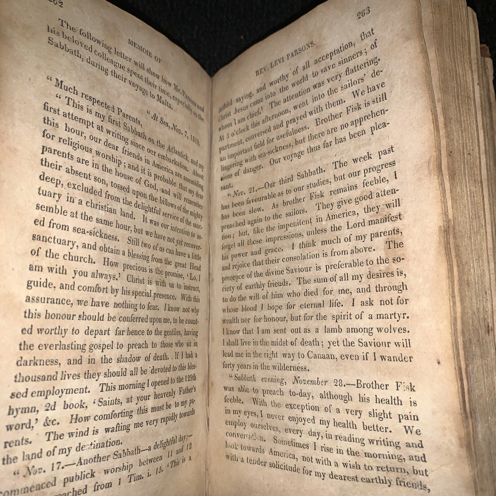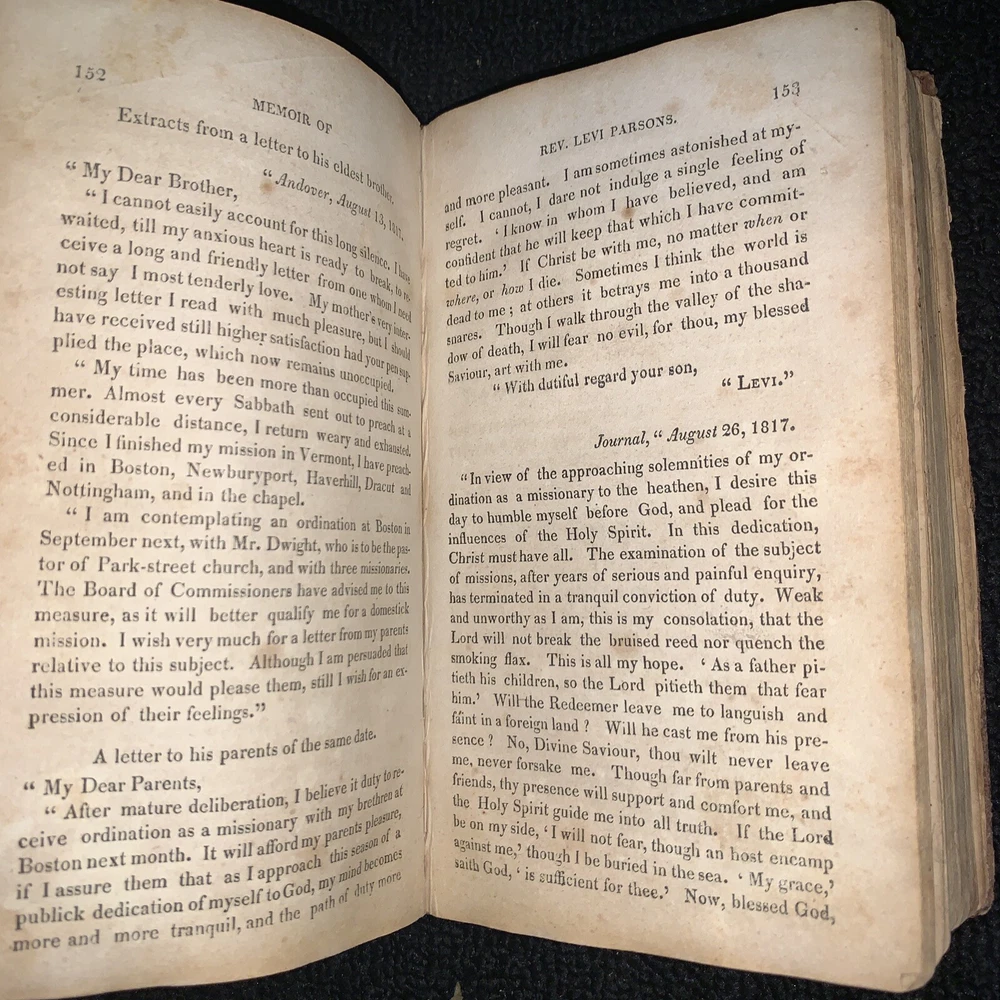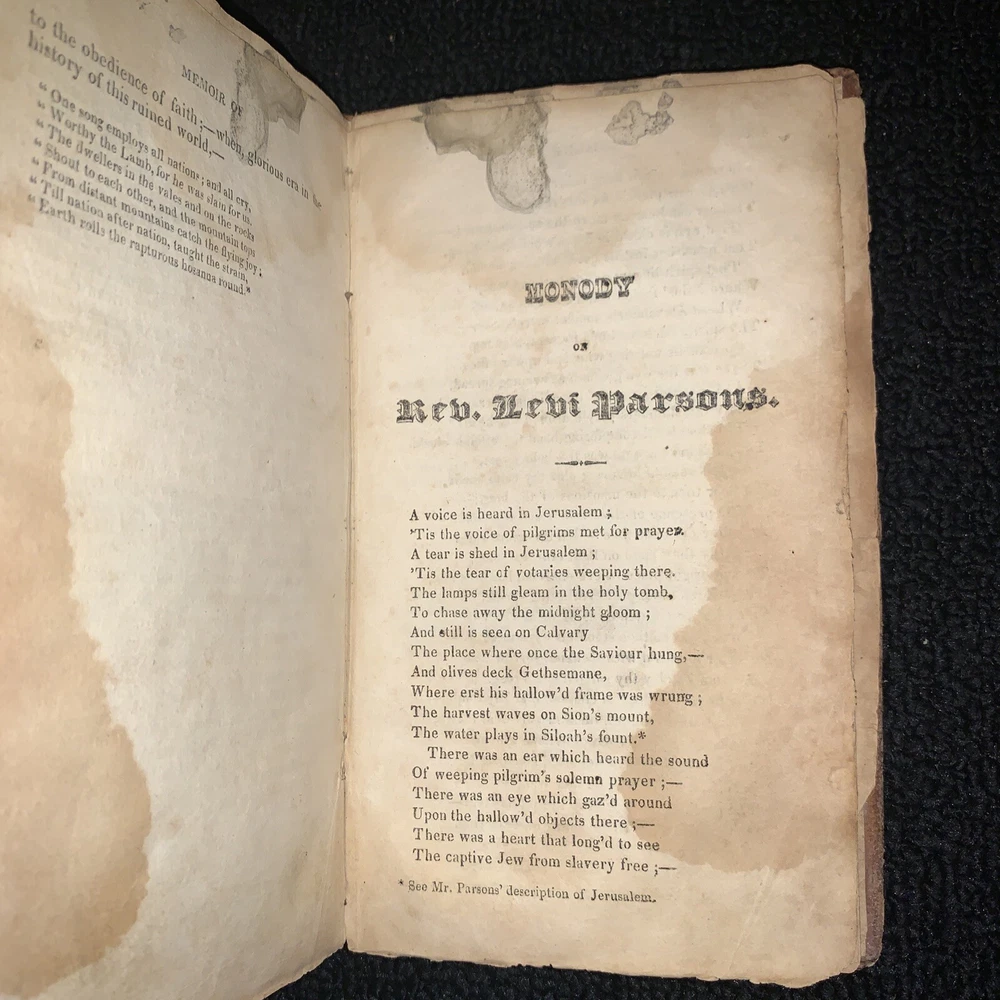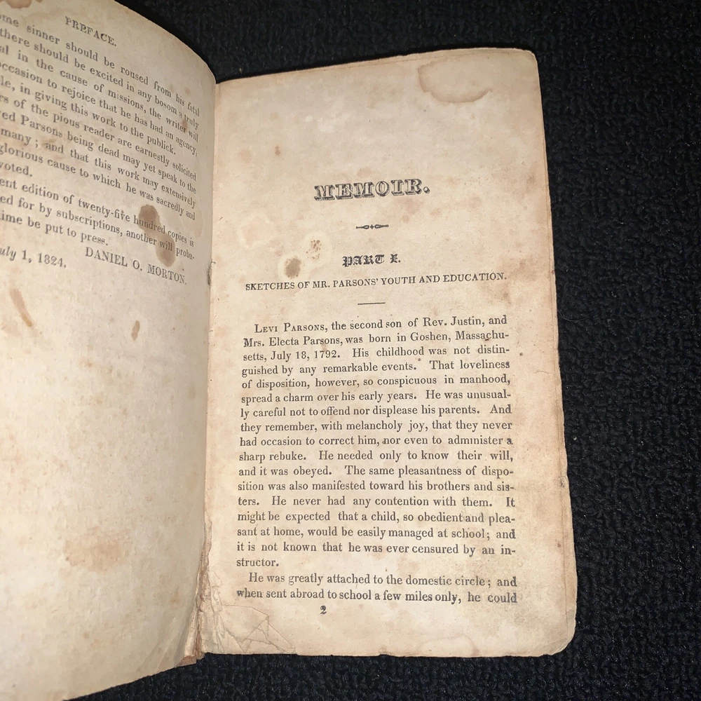 Memoir of Rev. Levi Parsons Missionary to Palestine. Loose covers, missing title page, date at end of preface 1824. 431 pages with foxing and staining present. 7x4 1/4x 1 1/4”. Please look at all pictures and ask any questions before purchasing. I do my best to show and describe all flaws so you know exactly what you are buying. I combine shipping on most orders. Follow my store for many more great books and deals. Thanks for looking and supporting my business! Inventory#1171b