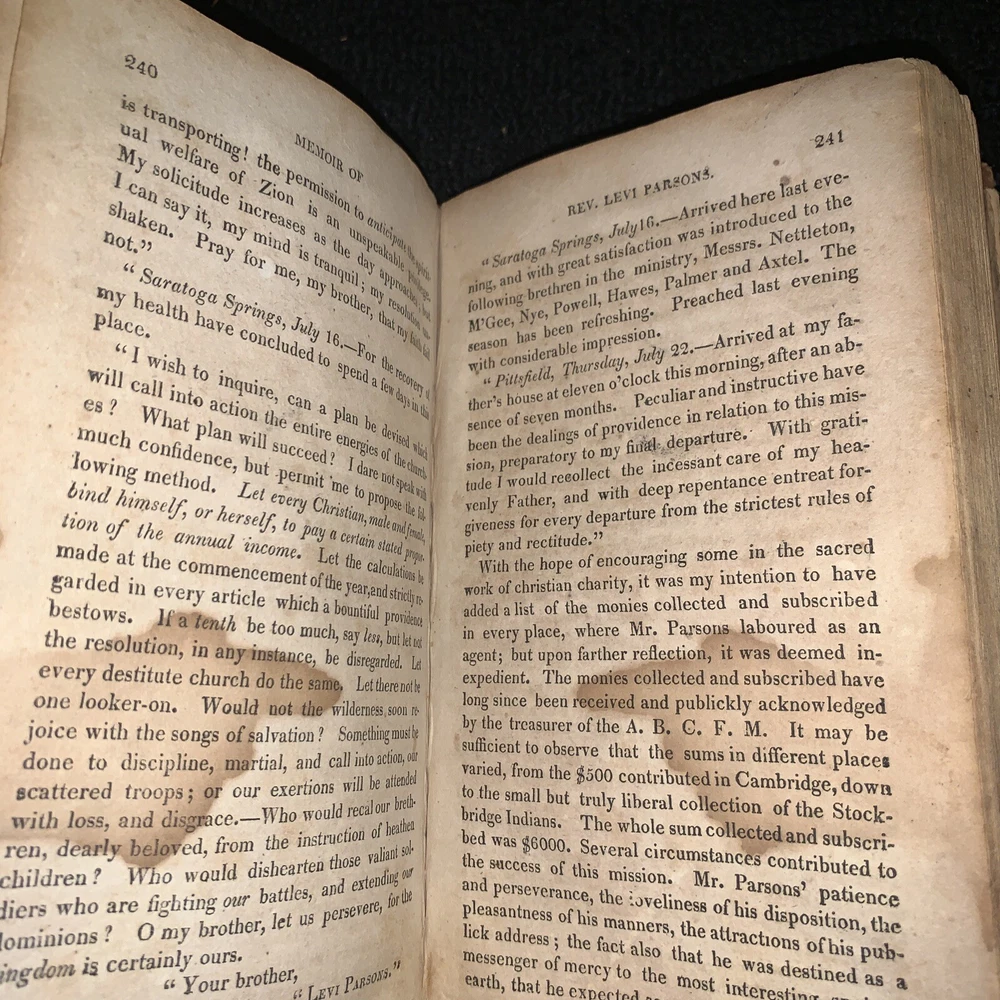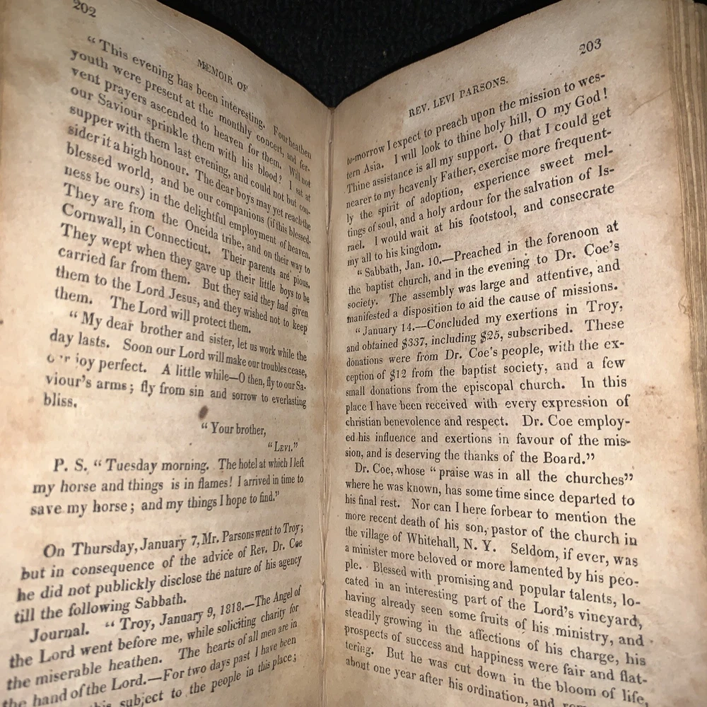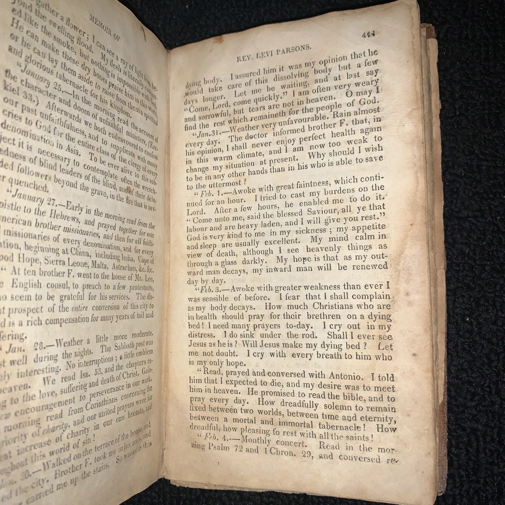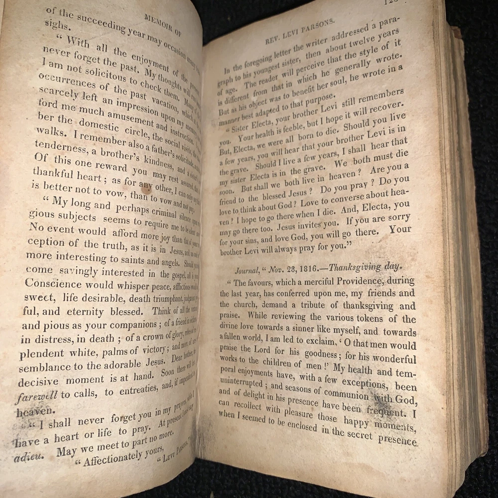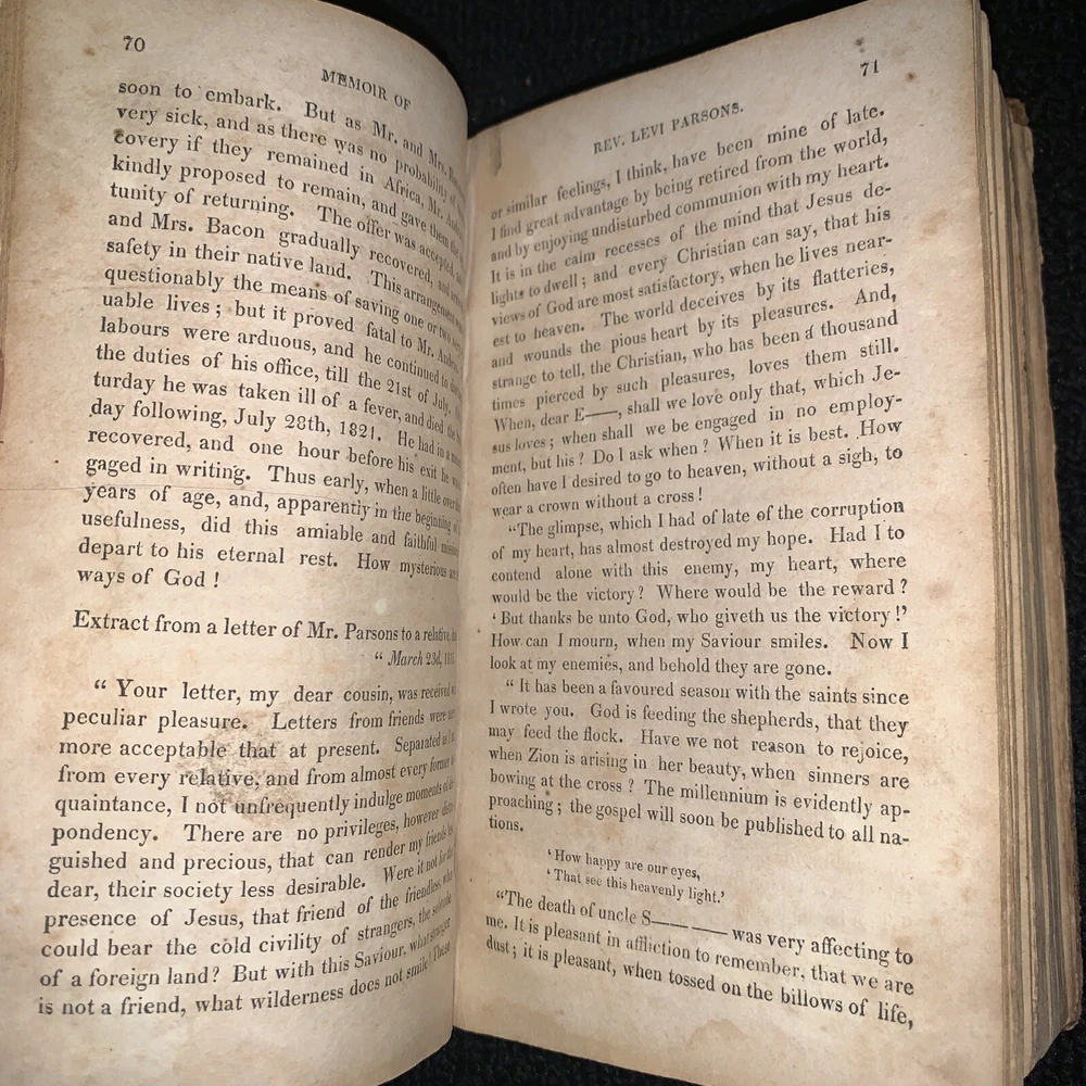 Memoir of Rev. Levi Parsons Missionary to Palestine. Loose covers, missing title page, date at end of preface 1824. 431 pages with foxing and staining present. 7x4 1/4x 1 1/4”. Please look at all pictures and ask any questions before purchasing. I do my best to show and describe all flaws so you know exactly what you are buying. I combine shipping on most orders. Follow my store for many more great books and deals. Thanks for looking and supporting my business! Inventory#1171b