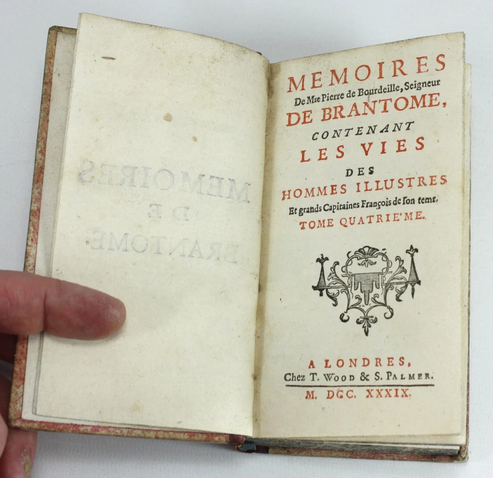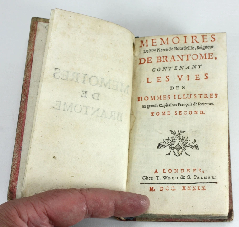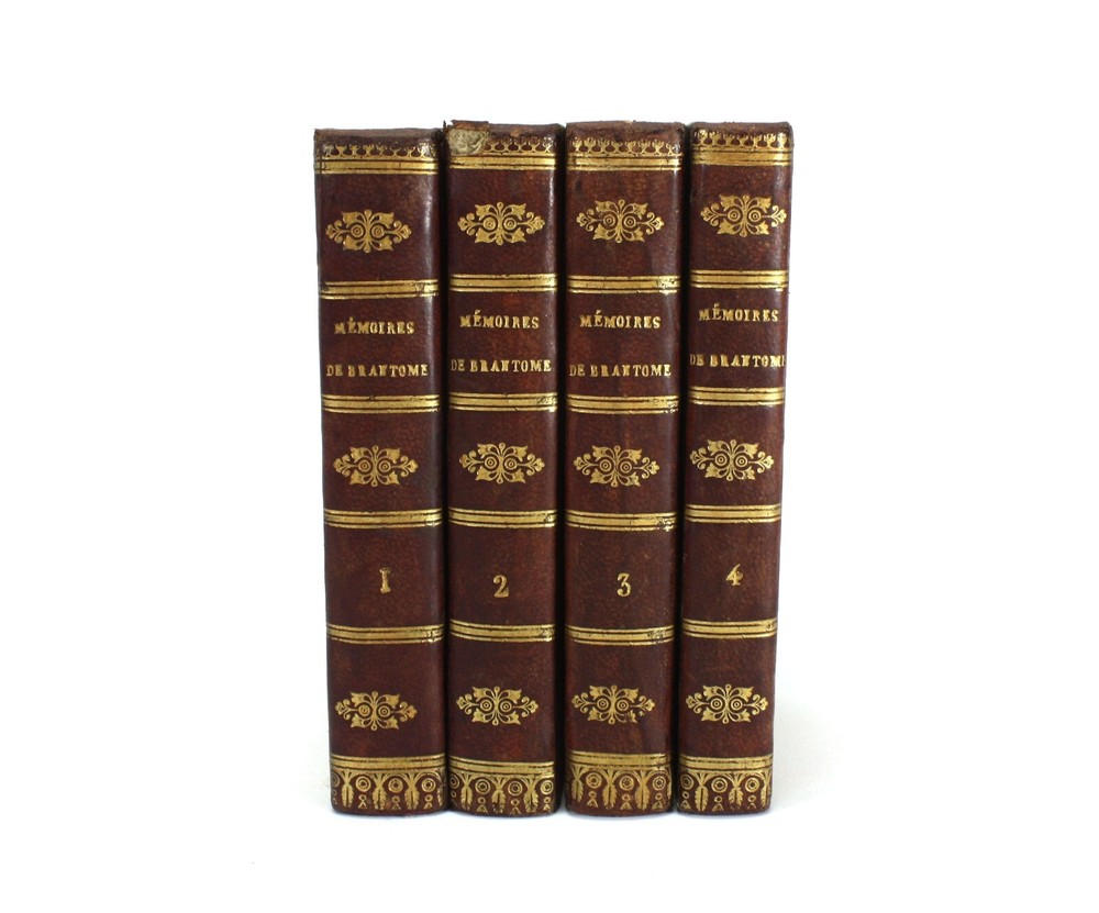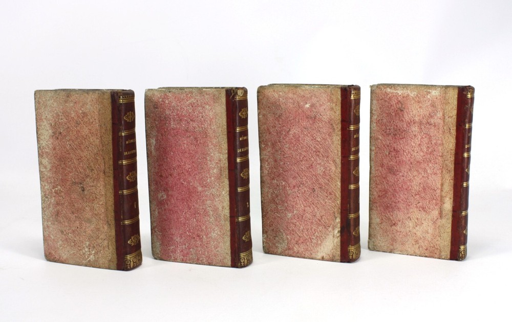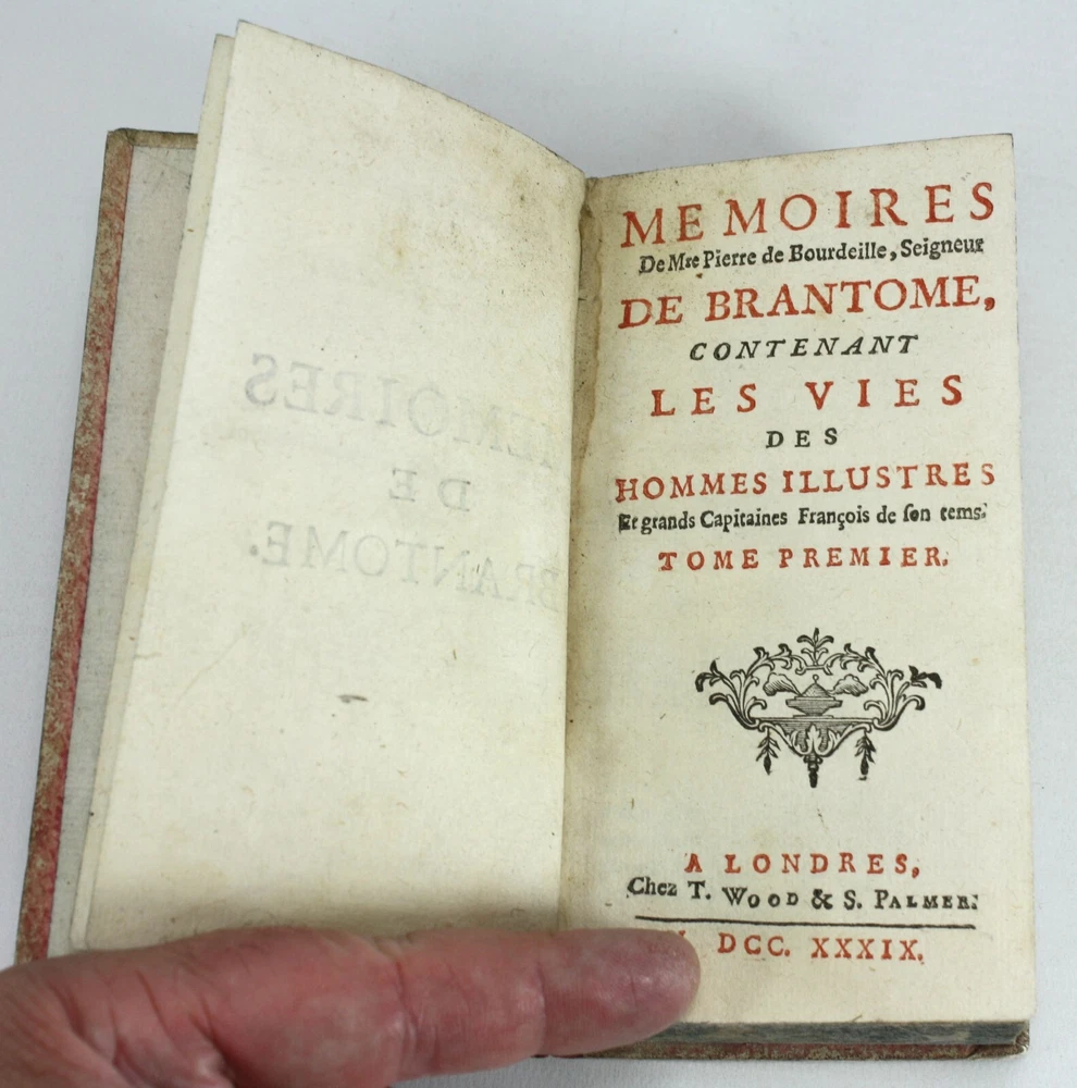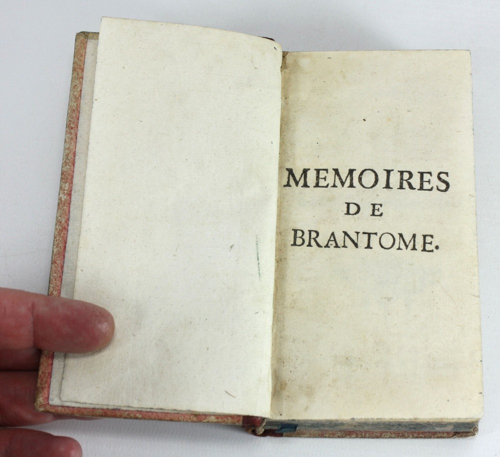 Memoires de Messire Pierre de Bourdeille, Signeur De Brantome, Contenant Les Vies Des Hommes Illustres, Et Grands Capitaines Francois de son temps. 4 Volumes Complete (Other aspects of the memoirs were also published in London in groups of volumes such as these). Also known as Memoires de Brantome . The memoirs of Pierre de Bourdeille, 1540-1614, French historian, biographer and soldier. This section of the memoirs celebrated illustrious Frenchman and Captains of the author's time. Published by T. Wood & S. Palmer, London, 1739. A good set of 4 volumes with red leather spines with gilt titles and red paper over boards -worn, faed and bumped. Marbled edges to text block. Text is firmly bound and is generally nice and bright throughout, with faults as below; Volume 1: Prelims + 388pp. 2 title pages detached from spine for around 5.5cm at the top, but still bound in below. Some light staining to some of the text. Volume 2: Prelims + 368pp + 1pp: Some light staining to some of the text, particularly at the rear. 1 cm nibble missing on edge of p. 359. Volume 3: Prelims + 402pp + 1pp: Some light staining to some of the text and a couple of worm holes running through to p225. Volume 4: Prelims + 323pp + 1pp. Some light staining to some of the text A good example of a scarce set. Language: French. Dimensions: each volume approximately 140mm high x 80mm wide x 18-25mm deep. Unpacked weight approximately 656g for the set. Memoires de Messire Pierre de Bourdeille, Signeur De Brantome, Contenant Les Vies Des Hommes Illustres, Et Grands Capitaines Francois de son temps. 4 Volumes Complete (Other aspects of the memoirs were also published in London in groups of volumes such as these). Also known as Memoires de Brantome. The memoirs of Pierre de Bourdeille, 1540-1614, French historian, biographer and soldier. This section of the memoirs celebrated illustrious Frenchman and Captains of the author's time. A good set of 4 volumes with red leather spines with gilt titles and red paper over boards -worn, faed and bumped. Marbled edges to text block. Volume 1: Prelims + 388pp. 2 title pages detached from spine for around 5.5cm at the top, but still bound in below. Some light staining to some of the text. Volume 2: Pre