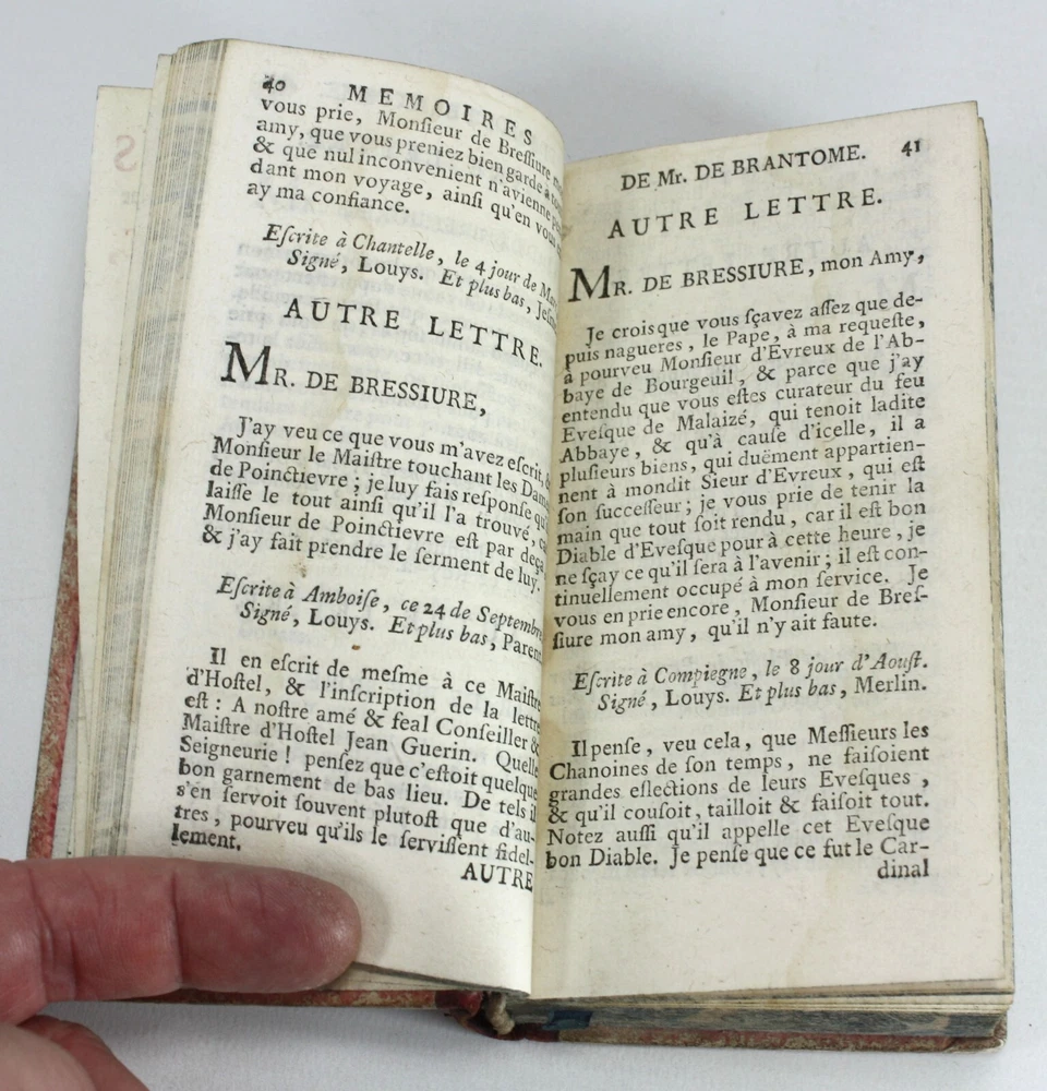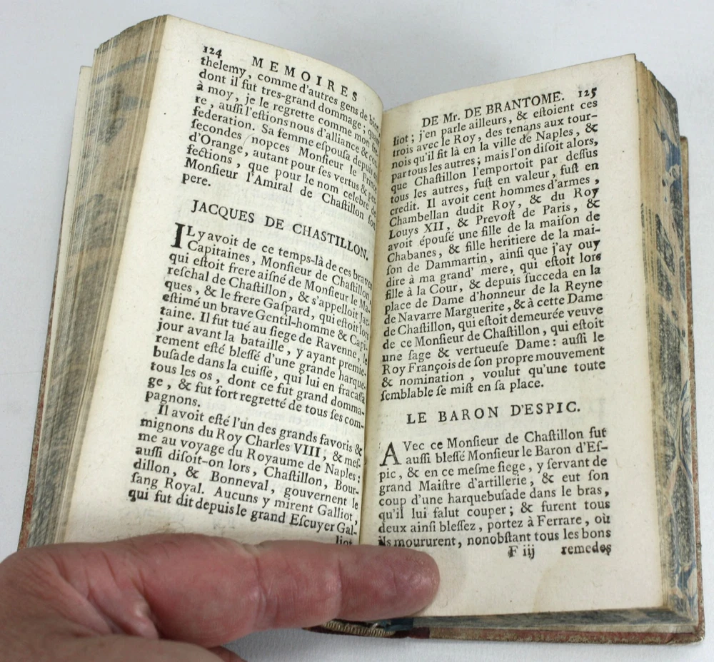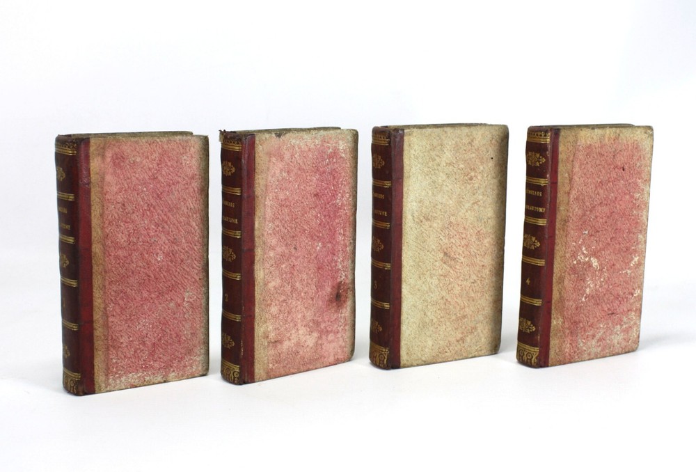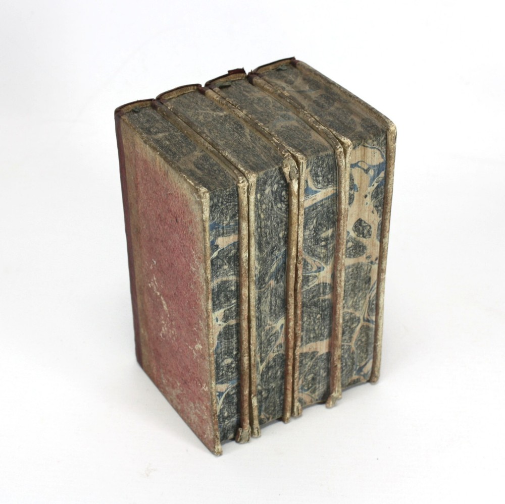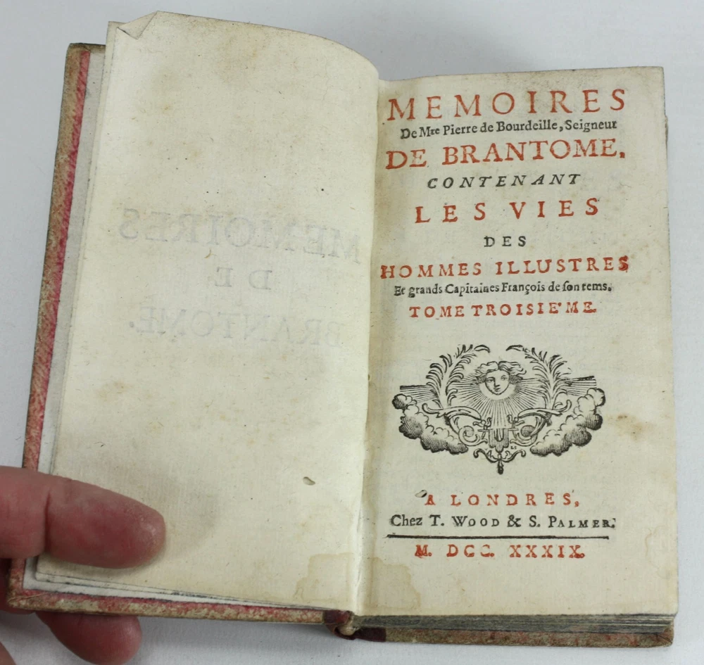 Memoires de Messire Pierre de Bourdeille, Signeur De Brantome, Contenant Les Vies Des Hommes Illustres, Et Grands Capitaines Francois de son temps. 4 Volumes Complete (Other aspects of the memoirs were also published in London in groups of volumes such as these). Also known as Memoires de Brantome . The memoirs of Pierre de Bourdeille, 1540-1614, French historian, biographer and soldier. This section of the memoirs celebrated illustrious Frenchman and Captains of the author's time. Published by T. Wood & S. Palmer, London, 1739. A good set of 4 volumes with red leather spines with gilt titles and red paper over boards -worn, faed and bumped. Marbled edges to text block. Text is firmly bound and is generally nice and bright throughout, with faults as below; Volume 1: Prelims + 388pp. 2 title pages detached from spine for around 5.5cm at the top, but still bound in below. Some light staining to some of the text. Volume 2: Prelims + 368pp + 1pp: Some light staining to some of the text, particularly at the rear. 1 cm nibble missing on edge of p. 359. Volume 3: Prelims + 402pp + 1pp: Some light staining to some of the text and a couple of worm holes running through to p225. Volume 4: Prelims + 323pp + 1pp. Some light staining to some of the text A good example of a scarce set. Language: French. Dimensions: each volume approximately 140mm high x 80mm wide x 18-25mm deep. Unpacked weight approximately 656g for the set. Memoires de Messire Pierre de Bourdeille, Signeur De Brantome, Contenant Les Vies Des Hommes Illustres, Et Grands Capitaines Francois de son temps. 4 Volumes Complete (Other aspects of the memoirs were also published in London in groups of volumes such as these). Also known as Memoires de Brantome. The memoirs of Pierre de Bourdeille, 1540-1614, French historian, biographer and soldier. This section of the memoirs celebrated illustrious Frenchman and Captains of the author's time. A good set of 4 volumes with red leather spines with gilt titles and red paper over boards -worn, faed and bumped. Marbled edges to text block. Volume 1: Prelims + 388pp. 2 title pages detached from spine for around 5.5cm at the top, but still bound in below. Some light staining to some of the text. Volume 2: Pre