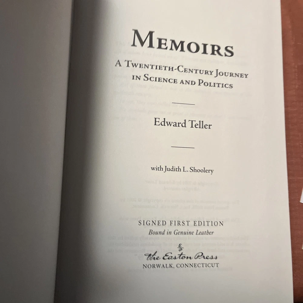 Memoirs, Edward Teller, Easton Press, Signed First Edition, Genuine Leather Bound, Number 1,072 of 1,225, Like New.