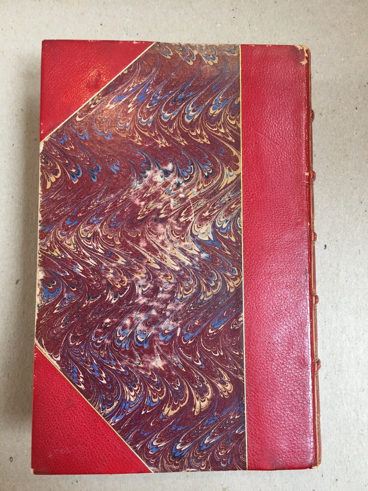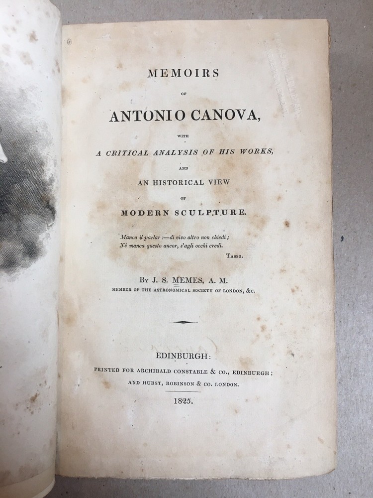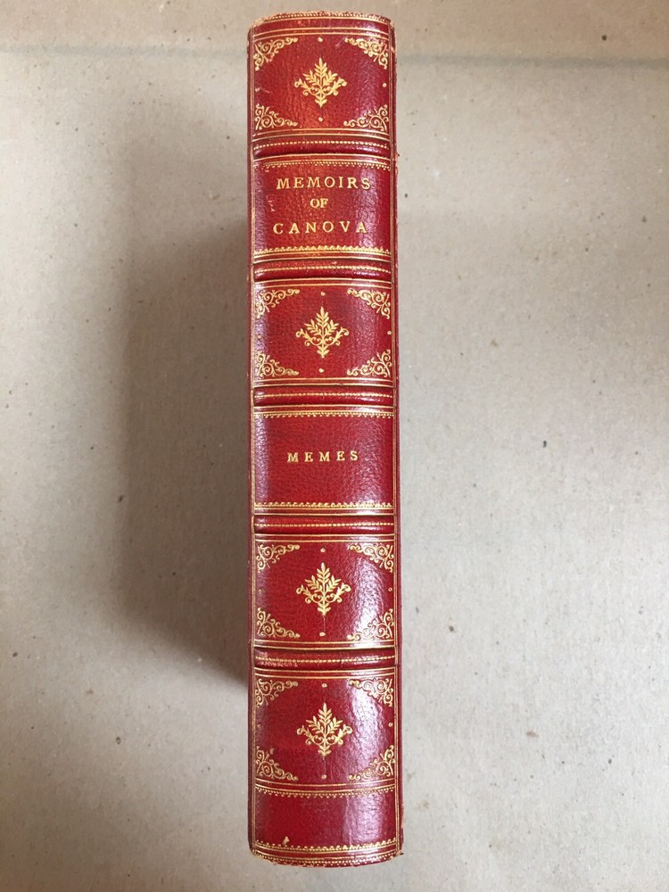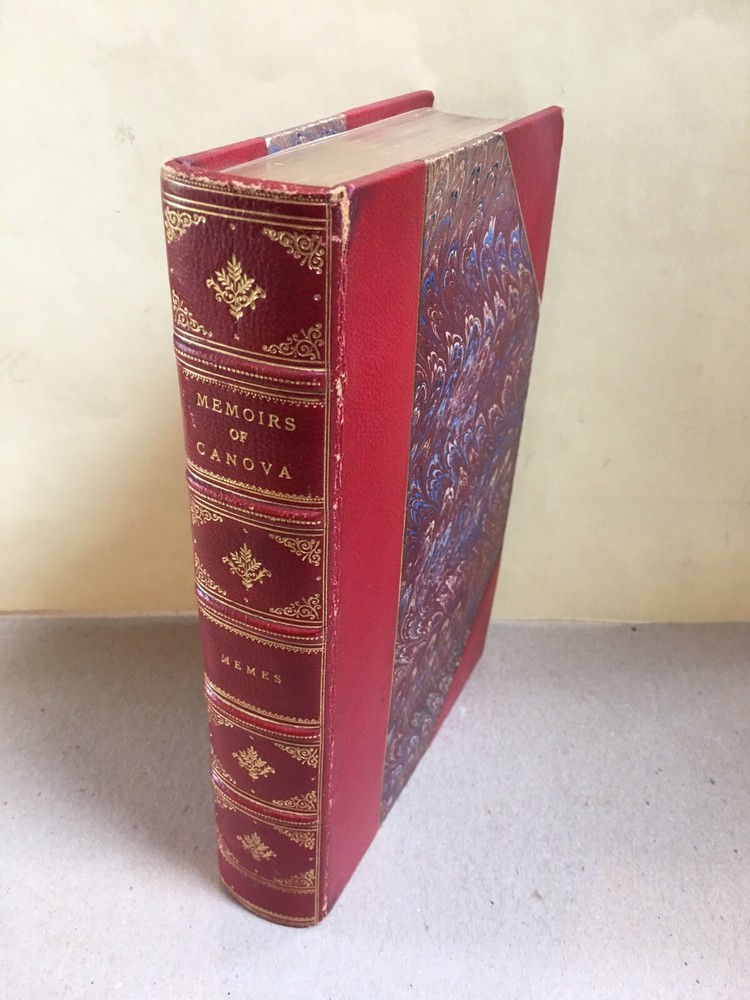 Hardbound in 3/4 red leather over marbled boards, raised bands, gilt titles and decoration to spine, top edge gilt. First Edition . Edinburgh: Printed for Archibald Constable & Co, 1825. "Memoirs of Antonio Canova, with a Critical Analysis of His Works, and An Historical View of Modern Sculpture" by J. S. Memes, A. M. Previous library's embossed stamp to title page and library card pocket affixed to rear pastedown. Light wear to corners and edges of boards, and some light foxing to end pages. Otherwise very good - interior clean of any writing or marks, binding sound. RARE!