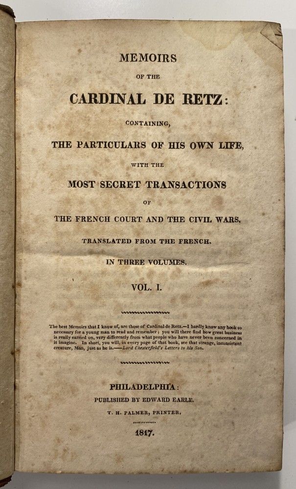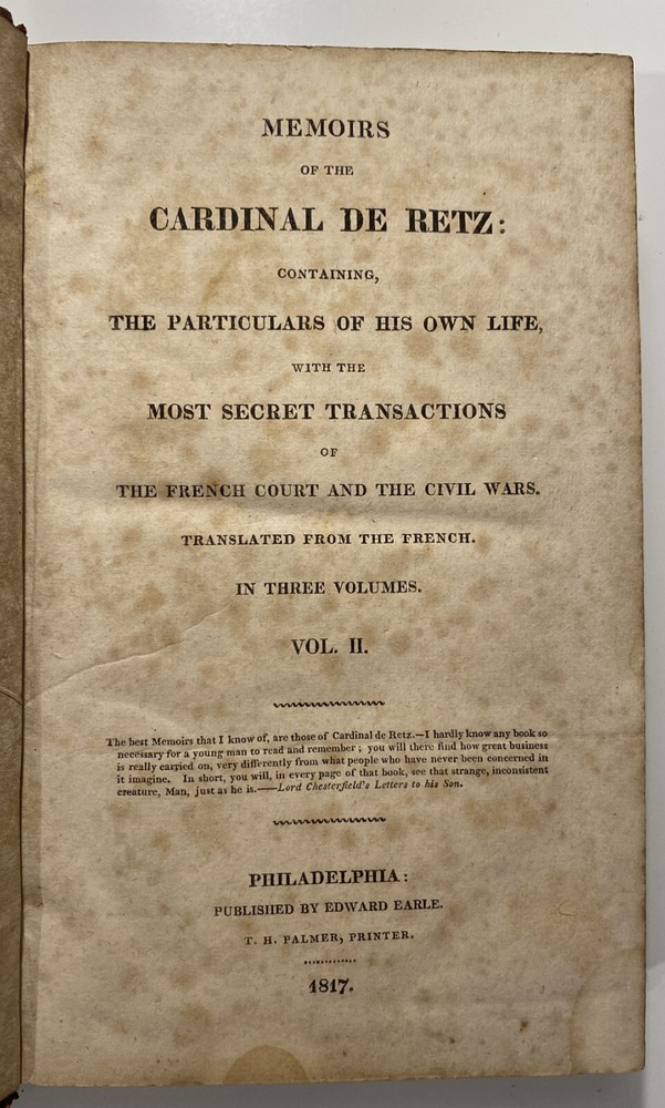 Title: Memoirs of the Cardinal de Retz: Containing, the Particulars of His Own Life, with the Most Secret Transactions of the French Court and the Civil Wars. Translated from the French. Publisher: Edward Earle, Philadelphia Year: 1817 Details: Volume s 1 and 2 only. 9 x 5.5 in.