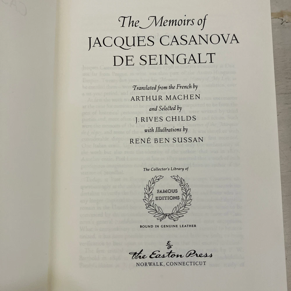 Memoirs of Casanova Easton Press Collector's Library of Famous Editions Leather This is a used book with general edge and shelf wear. Some foxing/spotting on gilded page edges, and some spotting and damage to the gilded design on the cover. Includes insert, which has some stains as well, and clean nameplate. Binding is intact, no writing, no unusual smells. See pictures for overview of condition. We are BrightLight Books. We have sold tens of thousands of items online since 1998. Money Back Guaranteed! For Local Pickup in our Fern Park, FL store, please message us! 35-31 (6051440) 11/12/24 JW