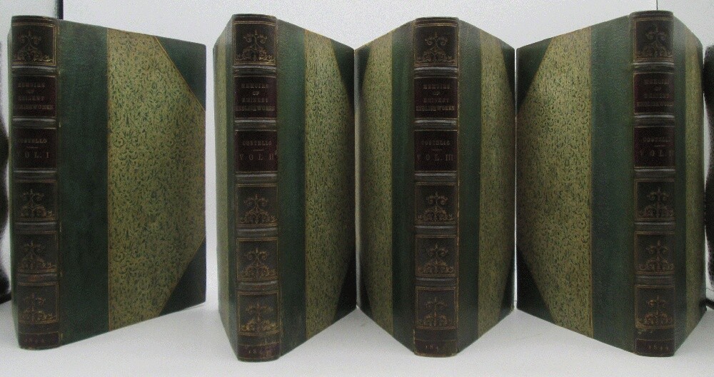 Ivy Ridge Books presents ... Memoirs of Eminent Englishwomen in Four Volumes Author: Louisa Stuart Costello Publisher: Richard Bentley Release Date: 1844 Seller Category: Biography Qty Available: 1 Condition: Collectible: Very Good Sku: 10226 Notes: Four volume, first edition set of the lives of Englishwomen is bound in green patterned paper and green leather on the corners and spines. The paper is darkened with age, leather rubbed at the edges, spines, with red labels, are darkened and rubbed at the head/tail and edges, years at foot are obscured by wear on two volumes, Vol III has a tear in the leather corner. Bookplates inside front covers, bibliographical information pasted to obverse of front endpaper, steel engravings. All orders packed with care, dust jackets protected by Brodart sleeve, independent bookseller since 2011 Don't forget to check out other great deals in our eBay Store!!