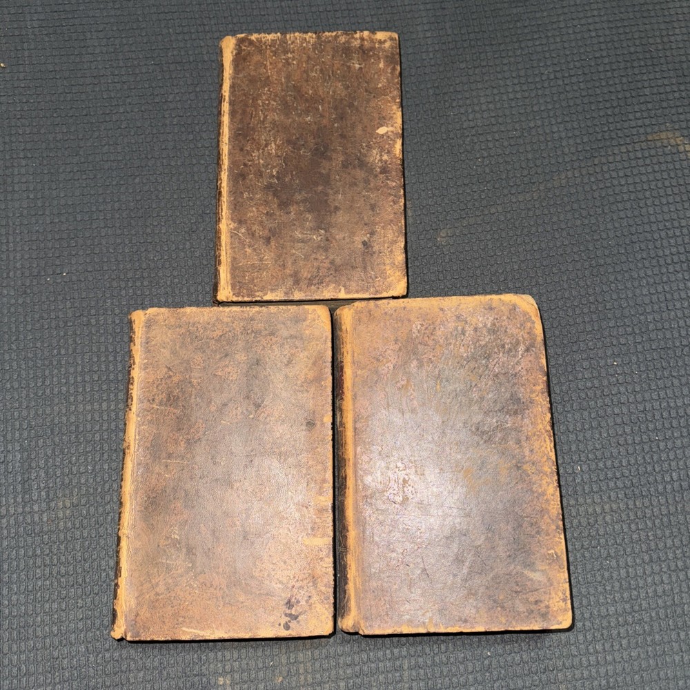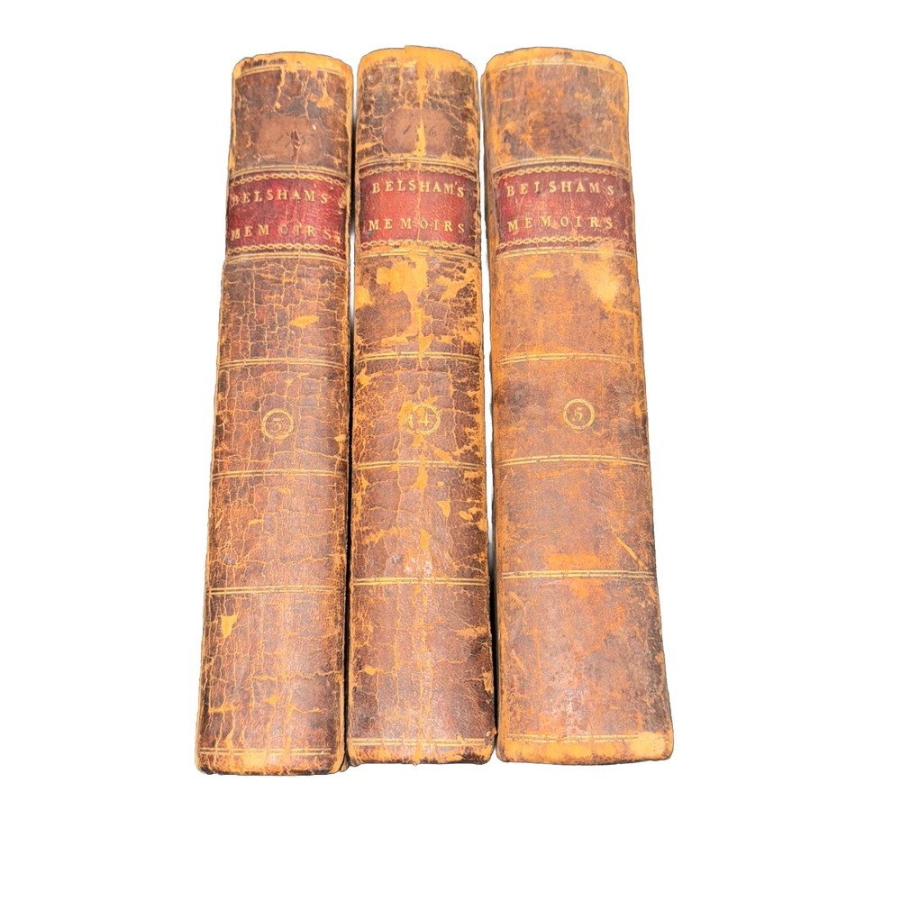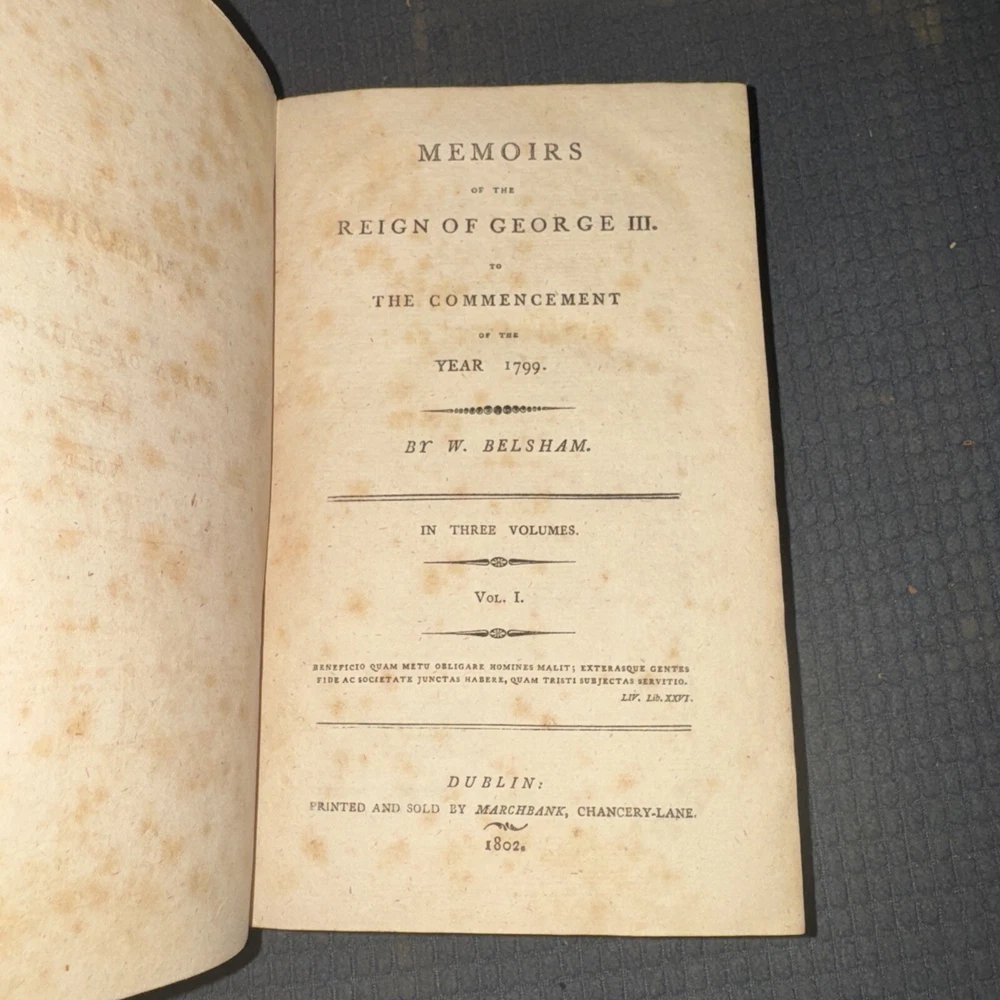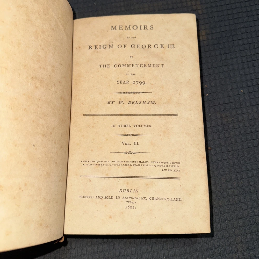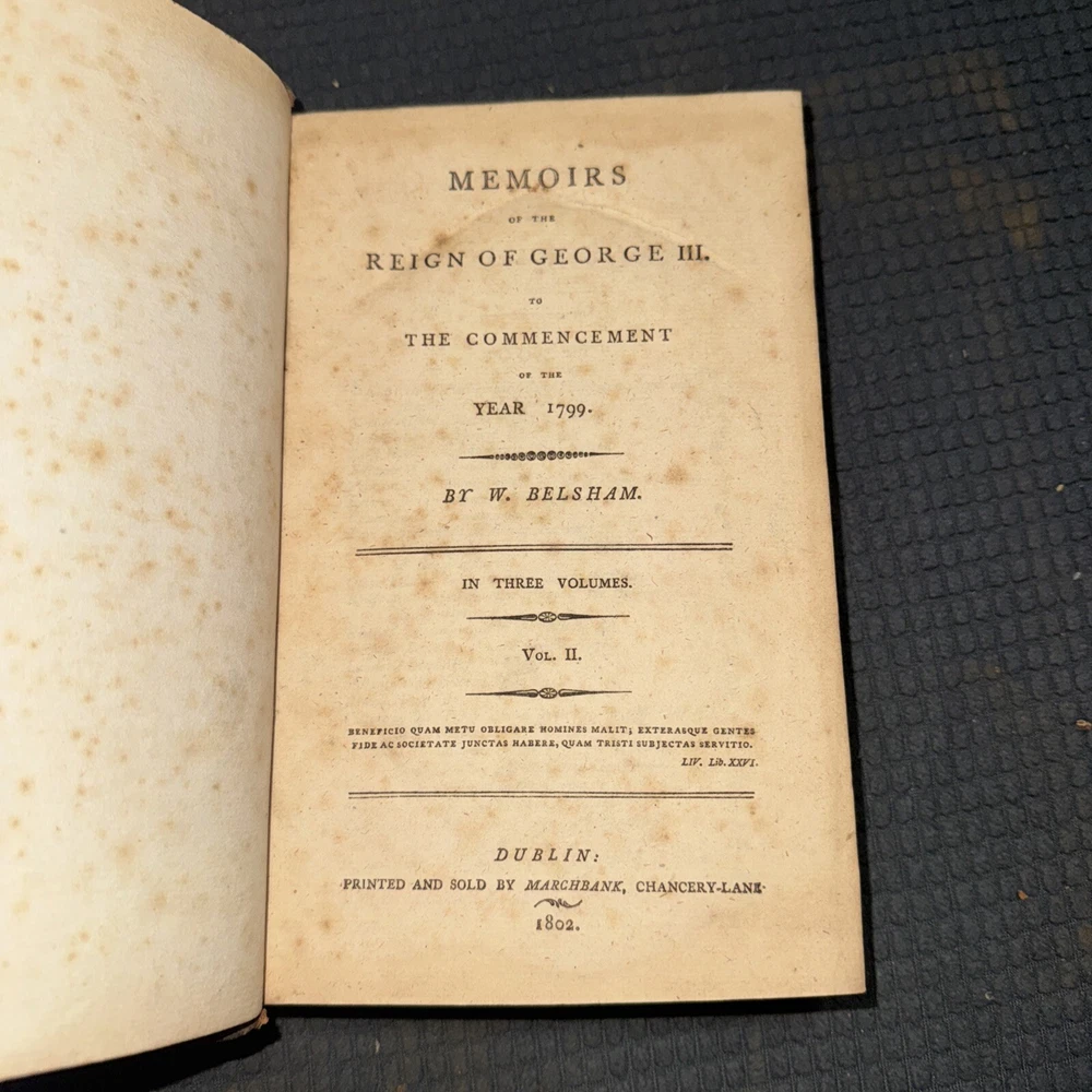 I combine shipping and post new items daily! Please look at all pictures and ask any questions before purchasing. I do my best to show and describe all flaws, so you know exactly what you are buying. Follow my store for many more great books and deals. Thanks for looking and supporting my business! Inventory#420 Description: Memoirs of The Reign of George iii by W. Belsham Complete in 3 Volumes 1802. Worn leather covers and cracked leather with some loss on spines. Spines have mislabeled numbering. Vol 1 marked 3, tight covers with 496 pages. Last page has torn bottom corner. vol 2 marked 4, tight covers and 567 pages. and vol 3 marked 5, tight covers and 558 pages. Pages have staining and foxing present with old book smell. 8 1/4x5 1/4x 1 1/2”.