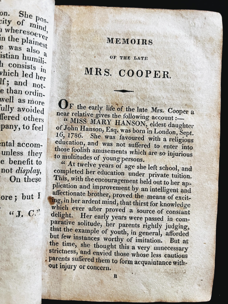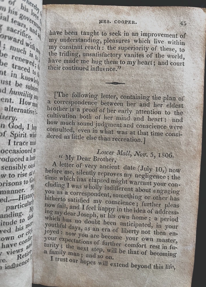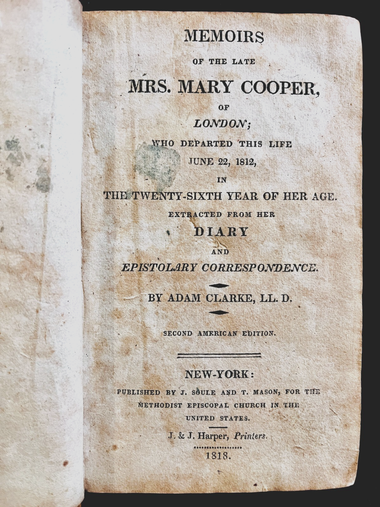 Copious extracts from Mrs. Mary Cooper's diary during the period of 1806-1812. Second American Edition published in 1818. A small book, measuring only 5 1/2 x 3 1/2 inches, full calf leather binding with a red leather label on the spine. Covers are scuffed and moderately worn, text is age-tanned and otherwise clean, owner's name and numbers on front free endpaper, a faint spot on title page, binding is sound and tight. 245 pages.