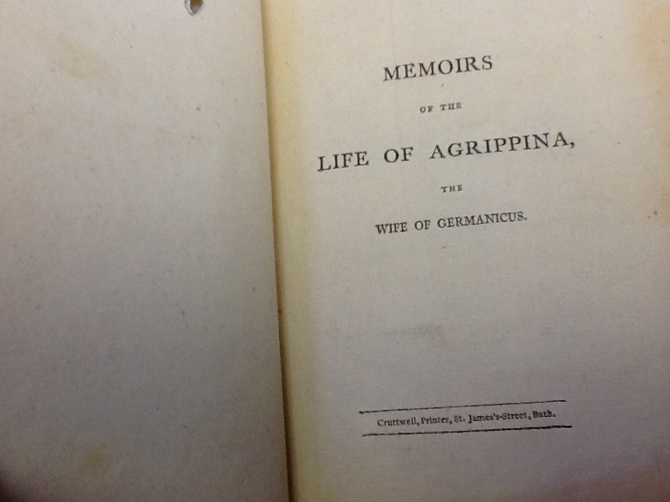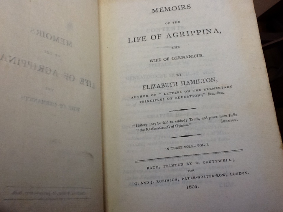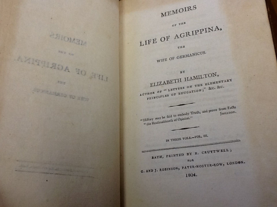 Memoirs of the Life of Agrippina, the Wife of Germanicus Elizabeth Hamilton Book Description: Bath: Printed by R. Cruttwell; for G. & J. Robinson, London, 1804, 1804. Fair to Good Condition. 1 & 3 only of a (3) volume set. Ex-Libre. Could possibly be 1st edition.
