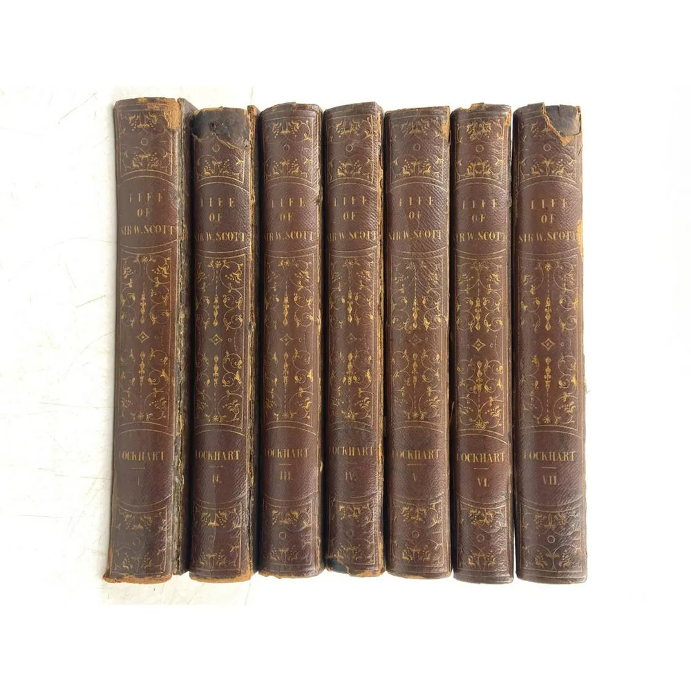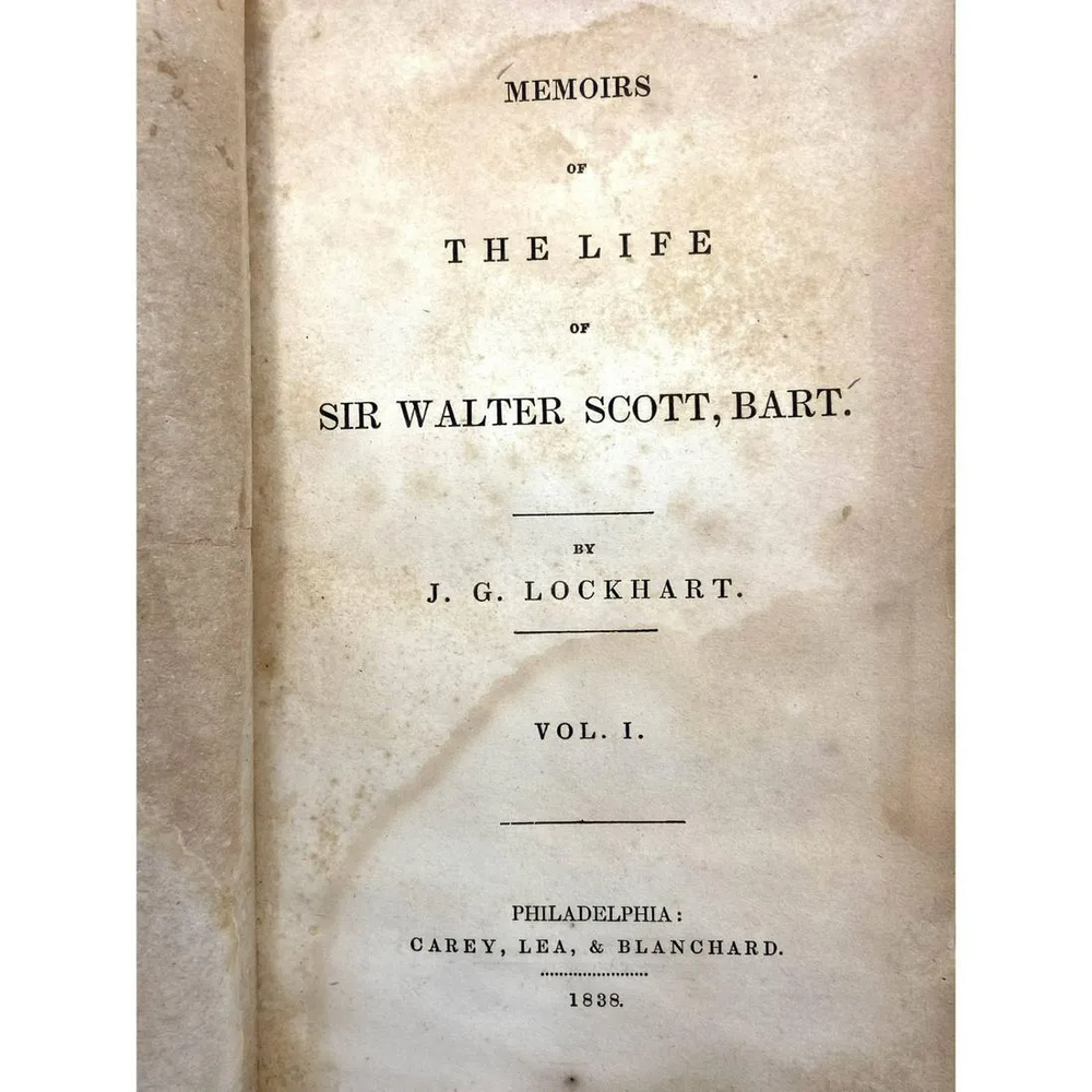 HGG Books presents ... Memoirs of the Life of Sir Walter Scott 8 volumes fine leather binding Author: John G Lockhart Publisher: Carey, Lea, and Blanchard Release Date: 1838 Seller Category: Antiquarian Qty Available: 1 Condition: Collectible: Good Sku: scottlockhart Notes: 8 volume set of the Memoirs of the Life of Sir Walter Scott by J G Lockhart published in 1838. Finely printed in 3/4 leather over marble boards. Measures 7.5 x 5, large for volumes printed in this time period.Pages show light foxing throughout, bindings solid, wear at hinges with 2 volumes having separated, marble cloth is clean with 3/4 leather showing bumping and edge wear Don't forget to check out other great deals in our eBay Store!!