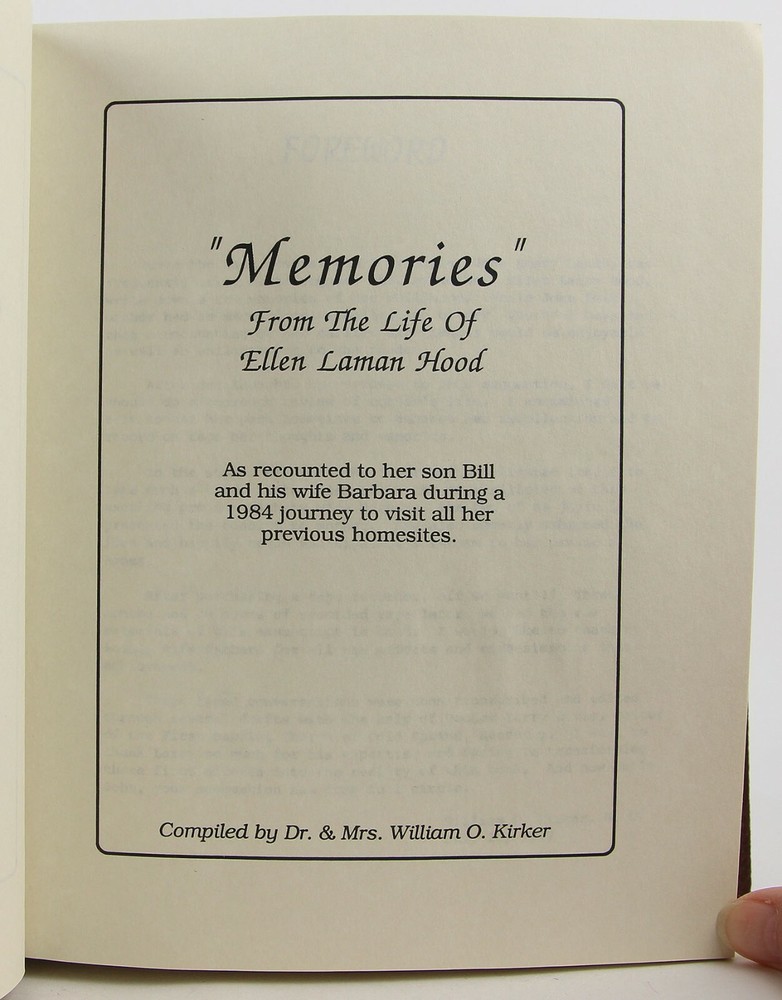 "Memories": From the life of Ellen Laman Hood By Ellen Laman Hood [1987] signed and inscribed first edition, W.O. Kirker (Cold Spring, Kentucky), 8 3/8 x 9 3/4 inches tall brown faux leather hardcover, no dust jacket (as issued), gilt lettering to front cover and spine, [14], 478, [4] pp. Very slight rubbing to covers, with slight bumping to the lower edge of the front cover, and both the upper and lower edges of the rear cover. Nicely inscribed and signed by the author on the half title page. Otherwise, a very good copy - clean, bright and unmarked - of this scarce memoir and family history. The memoirs of Ellen Laman Hood (1900-1995), 'as recounted to her son Bill and his wife Barbara during a 1984 journey to visit all her previous homesites.' Contents: Coal Valley, Illinois, 1900-1904 Braddock, North Dakota, 1904-1909 Walnut Valley, Kansas, 1909-1911 Fulton, Kansas, 1911-1914 Grand Haven, Michigan: The Laman Family Relations Tustin, Michigan, 1914-1916 McBain, Michigan, 1916-1926 Alma, Michigan, 1916-1923 Grand Ledge, Michigan, 1923-1926 Detroit, Michigan, 1926-1931 Marlette, Michigan Snover, Michigan, 1931-1936 Sandusky, Michigan, 1936-1953 Lexington, Michigan, 1940-1941 Mount Clemens, Michigan, 1953-1954 Dexter, Michigan, 1954-1955 Ypsilanti, Michigan, 1955-1984