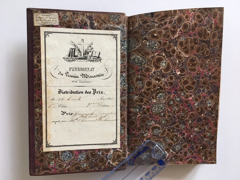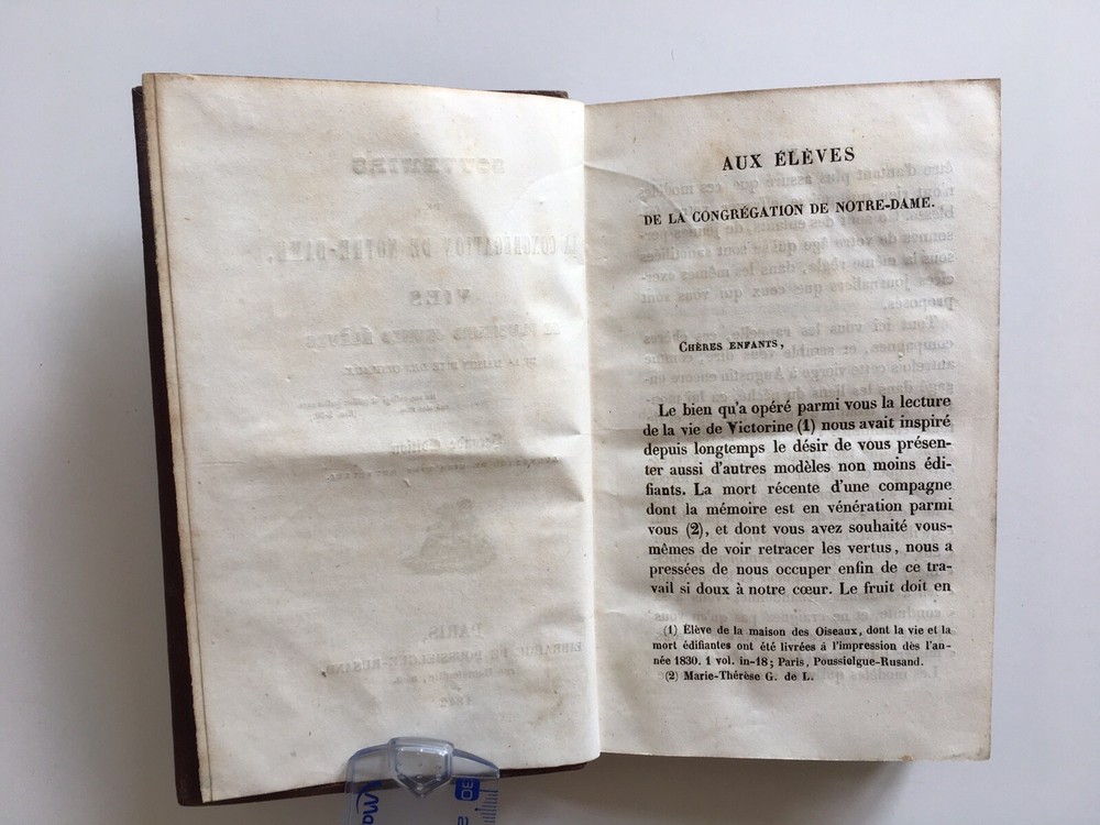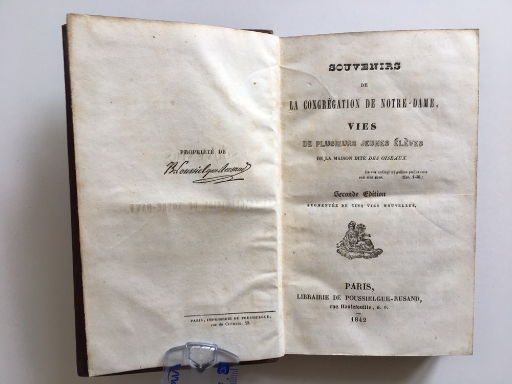 Memories of the Congregation of Notre-Dame. Lives of several young students from the Maison des Oiseaux. 2nd edition, increased by 5 new lives. In Paris, Librairie de Poussielgue-Russand, 1842. Price vignette awarded in 1842 by the boarding school of the first monastery of the Visitation. 316 pp. ; Memoirs of the spiritual life of 19 young children. Full leather binding ornate, dishes faded struck by the 1st monastery of the Visitation de Rouen. 17.7 x 10.4 cm. In good condition: solid work. Good hold. freckles. Memories of the Congregation of Notre-Dame. Lives of several young students from the Maison des Oiseaux. 2nd edition, increased by 5 new lives. In Paris, Librairie de Poussielgue-Russand, 1842. Price vignette awarded in 1842 by the boarding school of the first monastery of the Visitation. 316 pp. ; Memoirs of the spiritual life of 19 young children. Full leather binding ornate, dishes faded struck by the 1st monastery of the Visitation de Rouen. 17.7 x 10.4 cm. In good condition: solid work. Good hold. freckles.