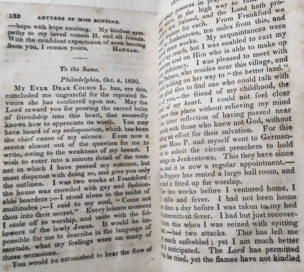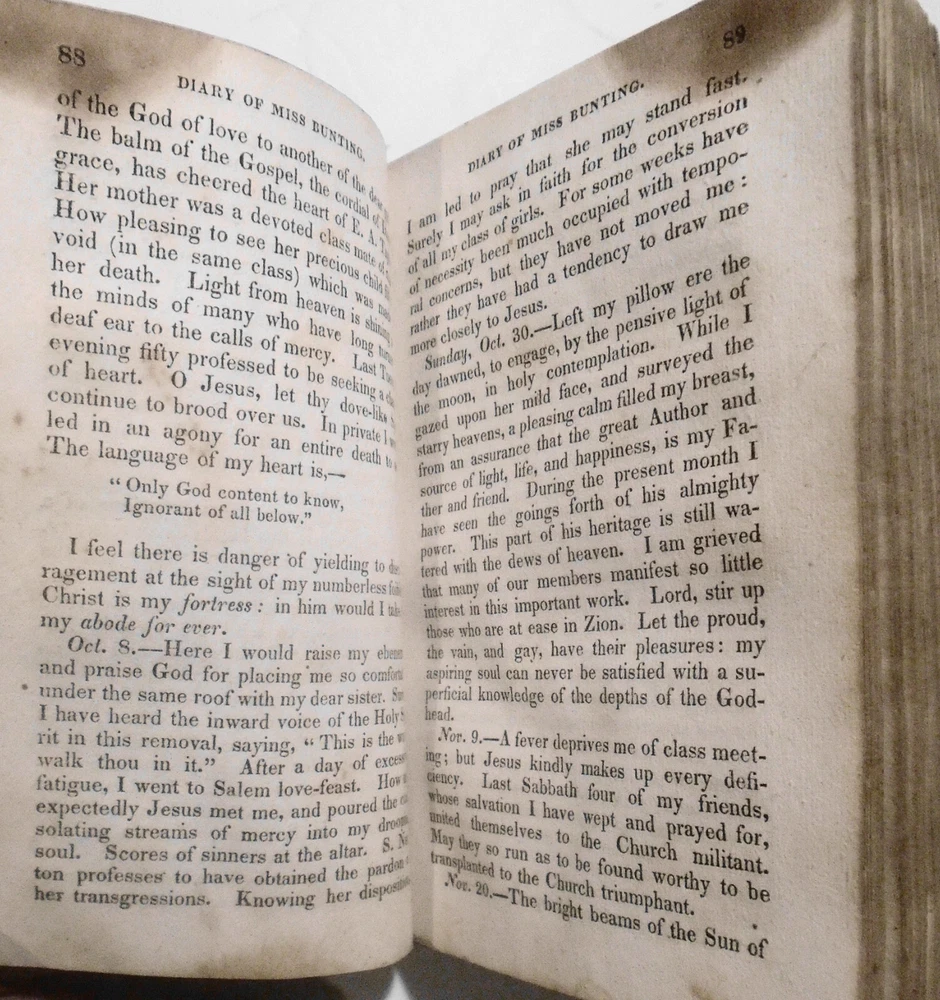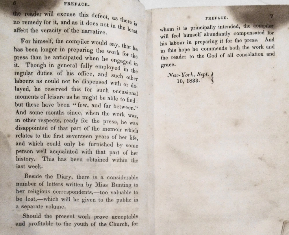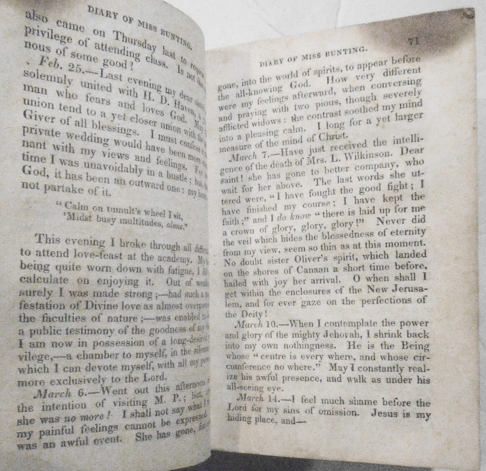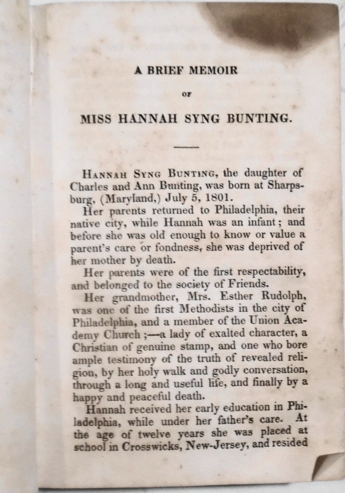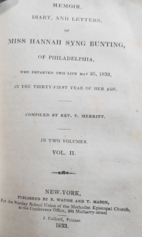Memoir, diary and letters of Miss Hannah Syng Bunting, of Philadelphia, who departed this life May 25, 1832, in the thirty-first year of her age - by Reverend Timothy Merritt. Publisher: B. Waugh and T. Mason, NY, 1833. 2 volumes bound in one. EXTREMELY RARE 1833 first edition. Not in OCLC, which only records editions from 1837 on.