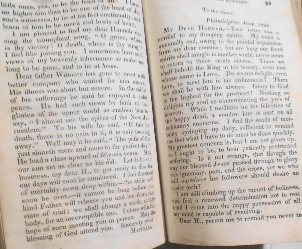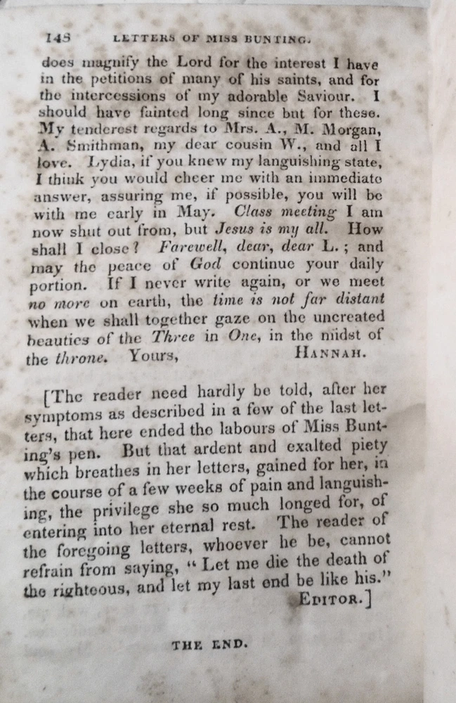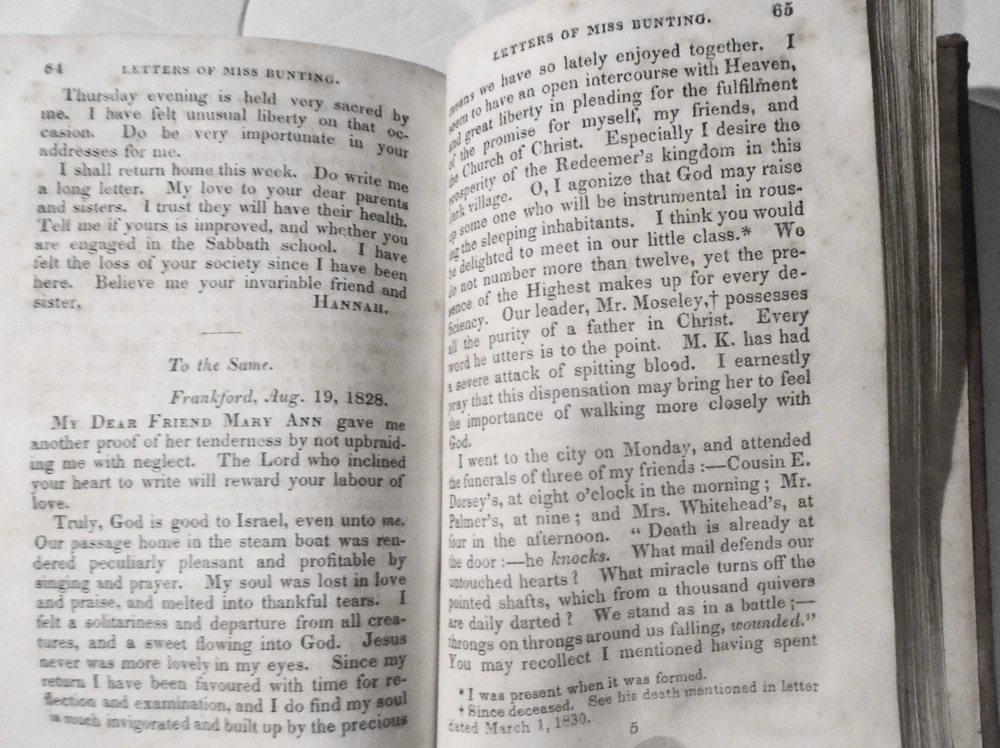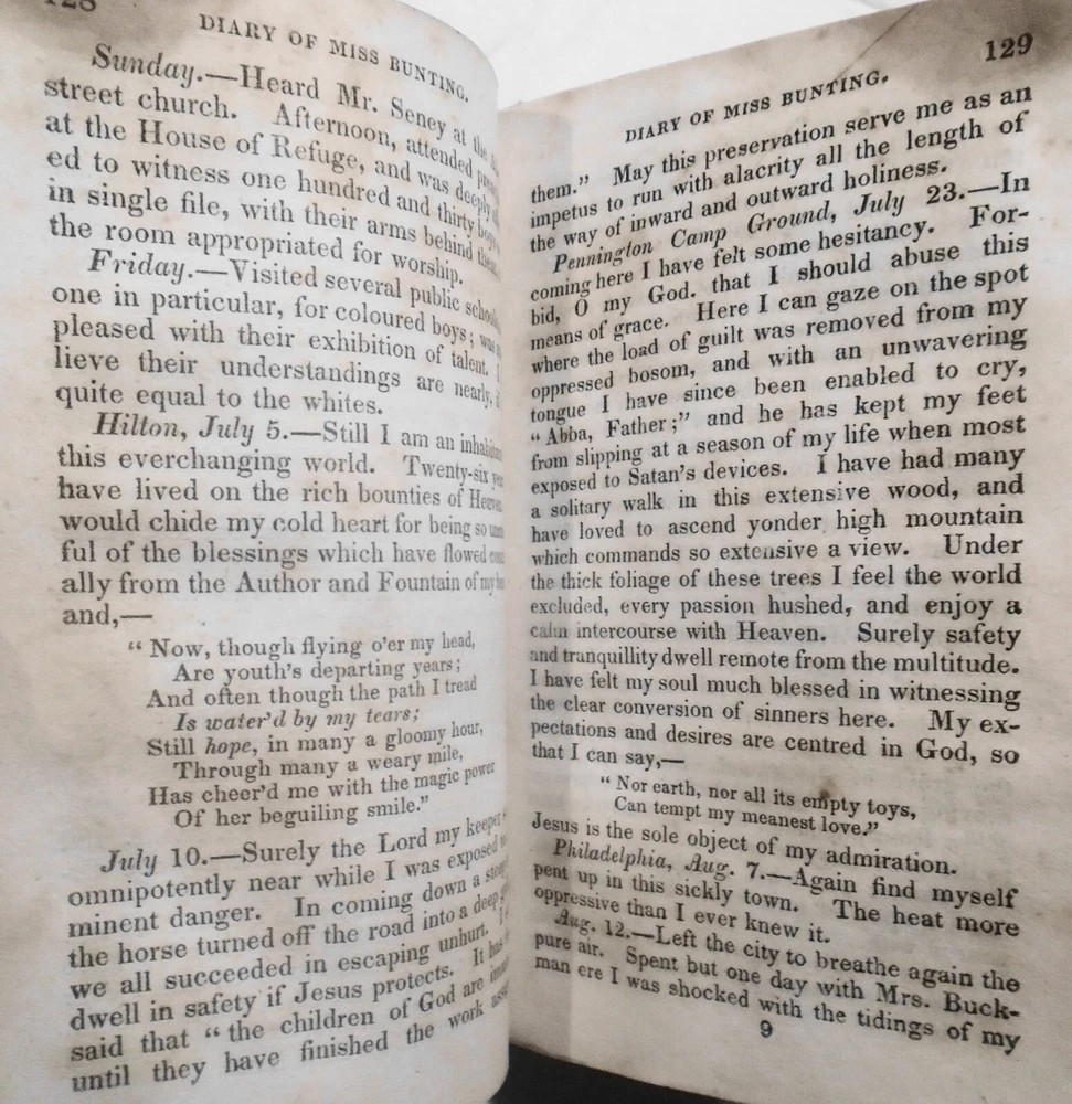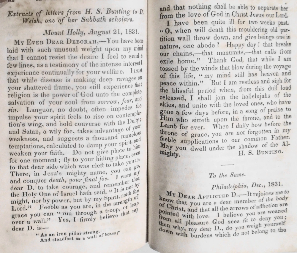 Memoir, diary and letters of Miss Hannah Syng Bunting, of Philadelphia, who departed this life May 25, 1832, in the thirty-first year of her age - by Reverend Timothy Merritt. Publisher: B. Waugh and T. Mason, NY, 1833. 2 volumes bound in one. EXTREMELY RARE 1833 first edition. Not in OCLC, which only records editions from 1837 on.