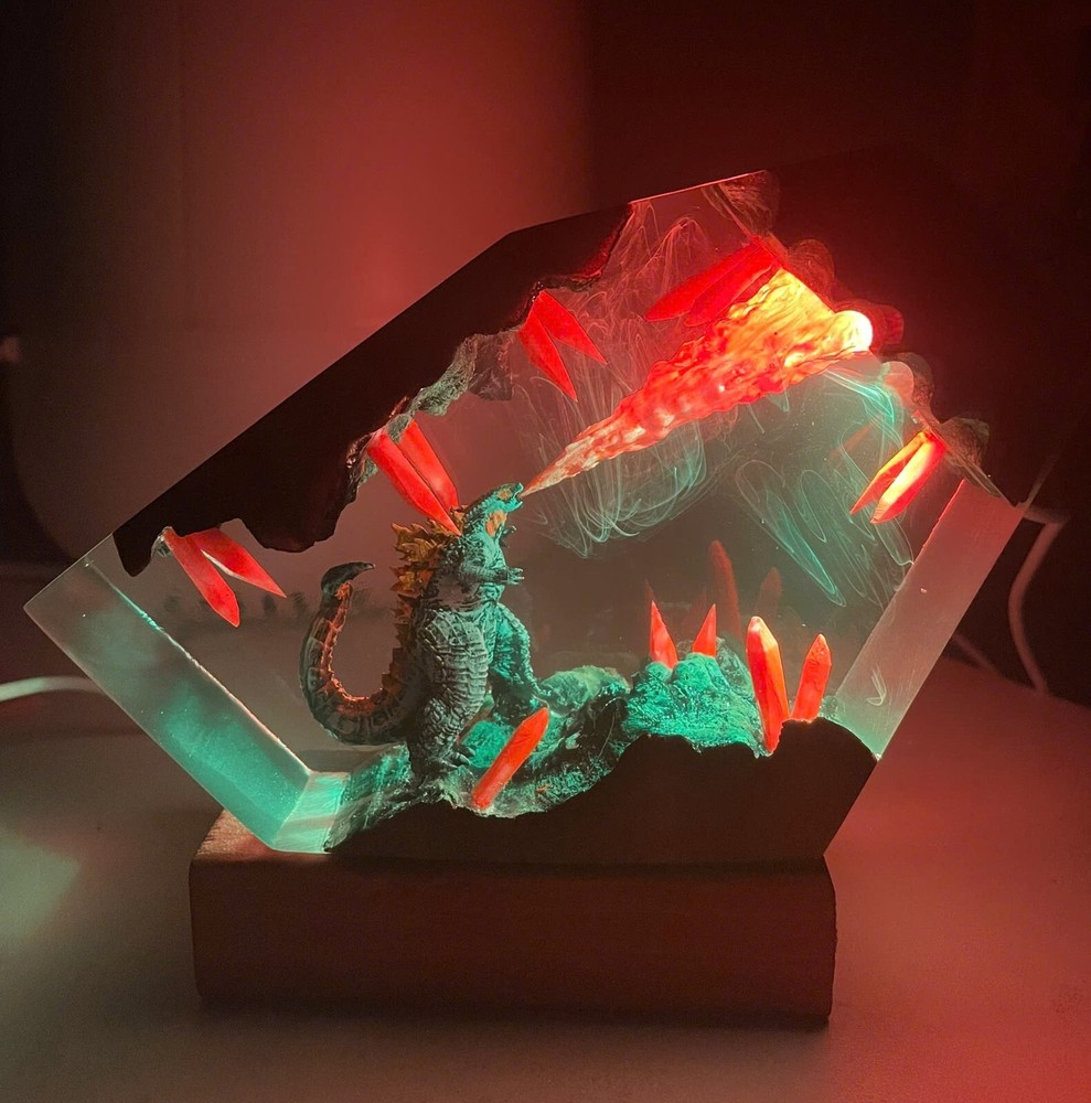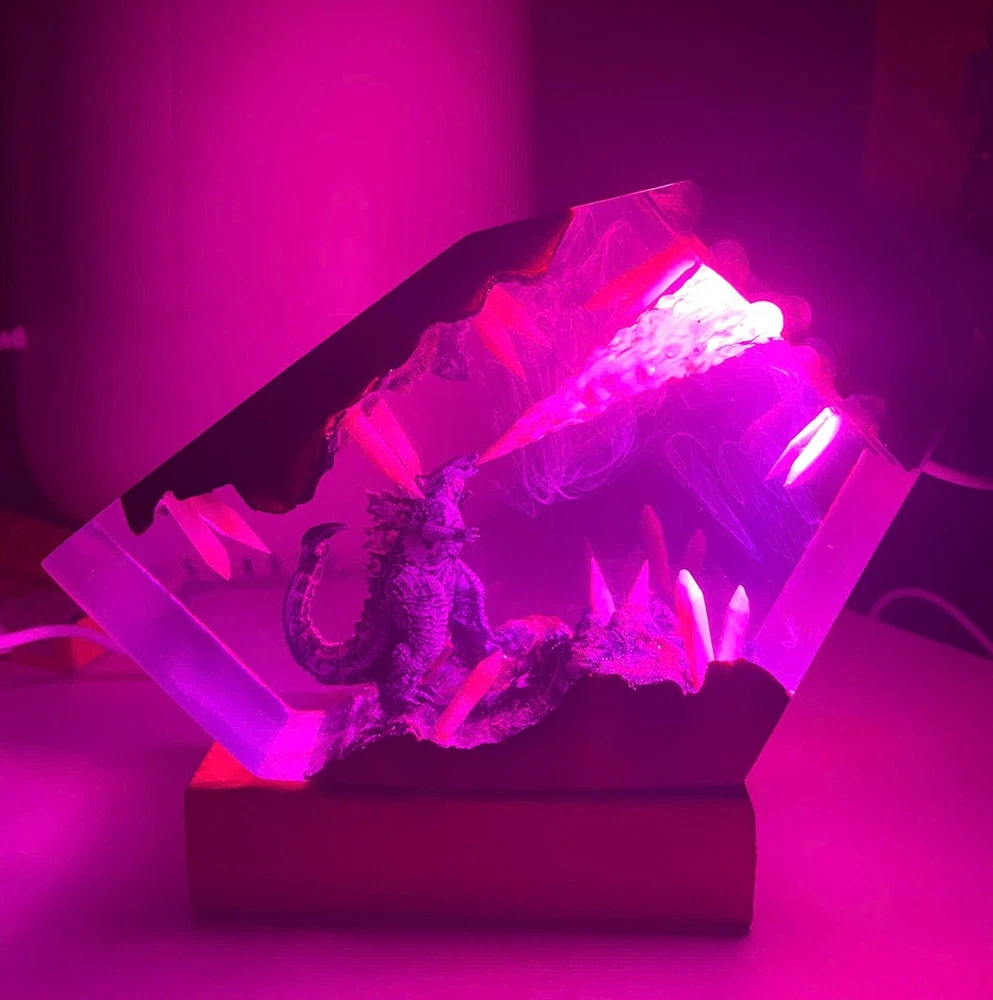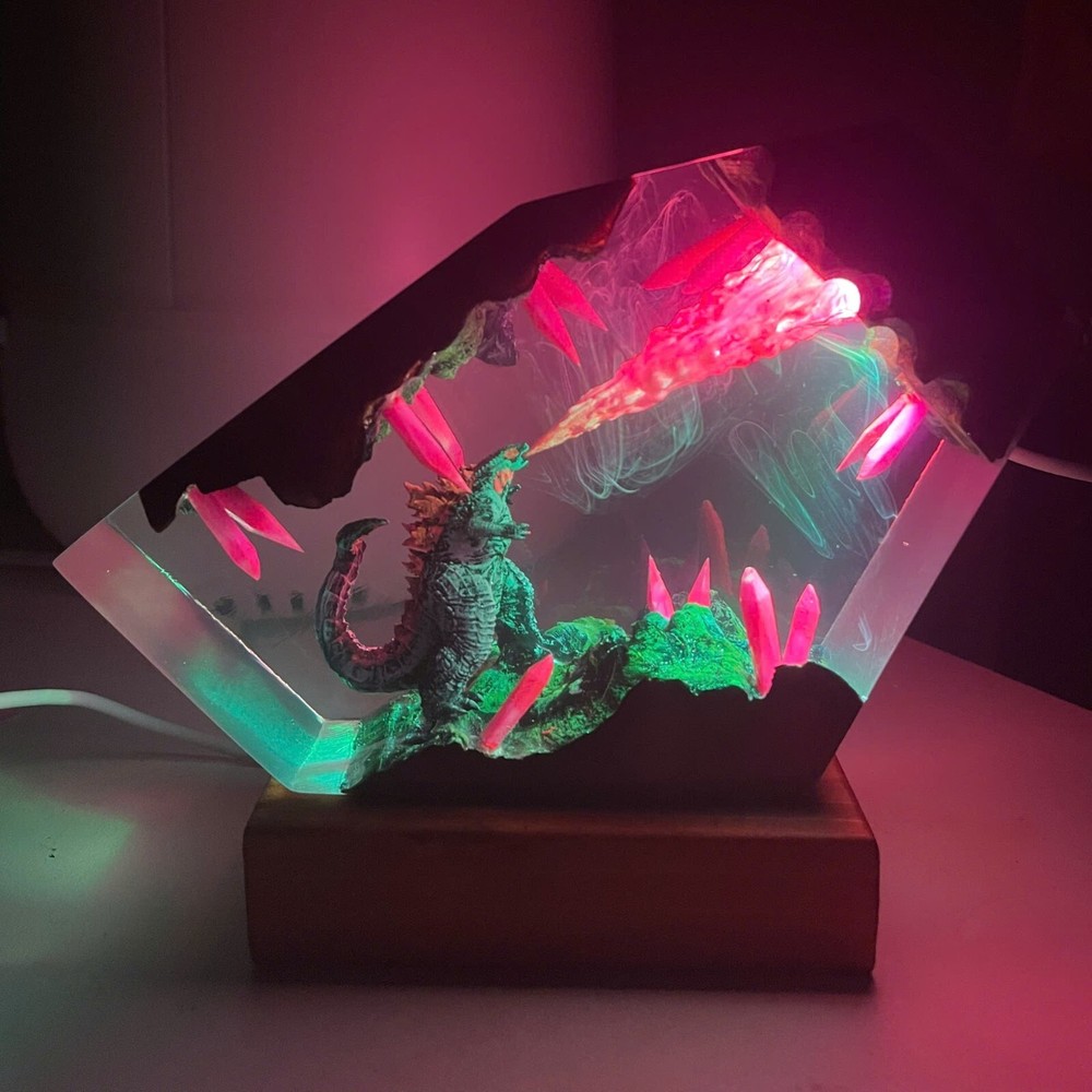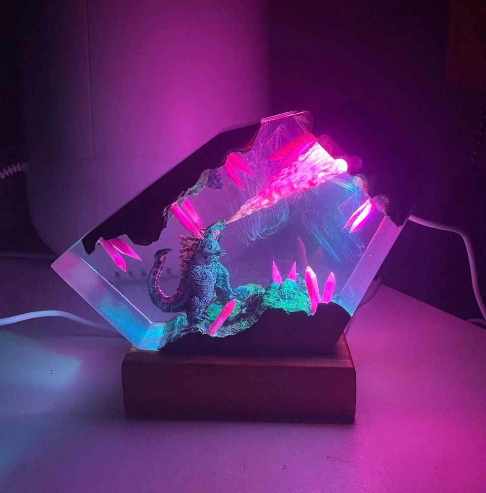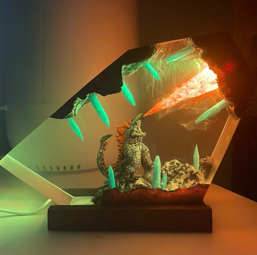 Godzilla Resin Lamp, Godzilla Handmade decor Epoxy Lamp, Unique Handmade Godzilla Gift for Room Decor, Resin Night light gift for Christmas Add a touch of magic to your nighttime routine with this custom night light featuring a stunning epoxy dragon design. With a range of light colors to choose from including red, clear white, blue, yellow, warm white, and green, you can pick the perfect hue to set the mood in your room. The lamp is USB powered and comes with a remote control, making it easy to adjust the brightness and color settings. This night light is perfect for indoor and outdoor use, whether you want to add a cozy touch to your bedroom, living room, or workspace. It's a great gift for any occasion, including Christmas, weddings, birthdays, and more. The lamp is made from high-quality materials including resin, LED lamp, epoxy, and wood, ensuring a durable and long-lasting use. The output voltage is 3V, and the lamp weighs 2lb. Bring a touch of supernatural beauty to your home with this stunning dragon night light. As you gaze upon this exquisite resin creation, you will be transported to the realm of Westeros, where the Fire Dragon and Ice Dragon clash in a breathtaking display of power and might. Crafted from a combination of wood and epoxy resin, this night light showcases intricate details and a captivating design. The Fire Dragon, with its fiery red scales and blazing breath, confronts the Ice Dragon, adorned with shimmering white fur and icy breath. The clash of their elemental forces creates a scene of intense drama and suspense. Flames and frost intertwine, illuminating the room with a kaleidoscope of colors, bringing the battle to life before your very eyes. Our night light products are very suitable as gifts for important holidays. Father's Day, Mother's Day, Birthday, New Home Gift, Wedding Gift, Graduation Gift, Baby Gift, Halloween Gift, Christmas Day, Holiday Gift thanksgiving, day to celebrate the 3 saints...... 1. Lamp size - Size M: 6.8''x5.2'' Suitable for baby's bedroom. - Size L: 8.8"x6.7" Suitable for adult bedrooms. - Size XL: 10"x8" Suitable for adult bedrooms, living room, office, hallway and home decoration. 2. Color of the light. - The main color of plastic we often use is ocean blue so it is most similar to the color of the ocean. In addition, if the customer wants to change the color of the plastic, we can change it according to the customer's preferences. Because the product is 100% handmade, it can be customized right from the production stage. - The LED light color we use is a 5V LED light that can change 16 colors at will and adjust the light intensity to your liking. 3. Production and shipping time. Our production time after you place your order will average 5 - 7 business days. Normal shipping will take 10-15 days. In addition, if you require fast shipping, we use a super fast shipping service that takes 3-5 days to reach the customer. 4. Product goals The product is completely handmade by skilled workers from Vietnam. Your order will contribute a small part to feed struggling families in a still poor country like Vietnam. Thank you for your interest and order. Note: The product delivered to the customer will have a slight change in the shape of the piece of wood in the lamp because it is impossible to find similar pieces of wood that are 100% identical to the sample photo, but it does not differ too much from the sample photo and may reaching 95% similarity.