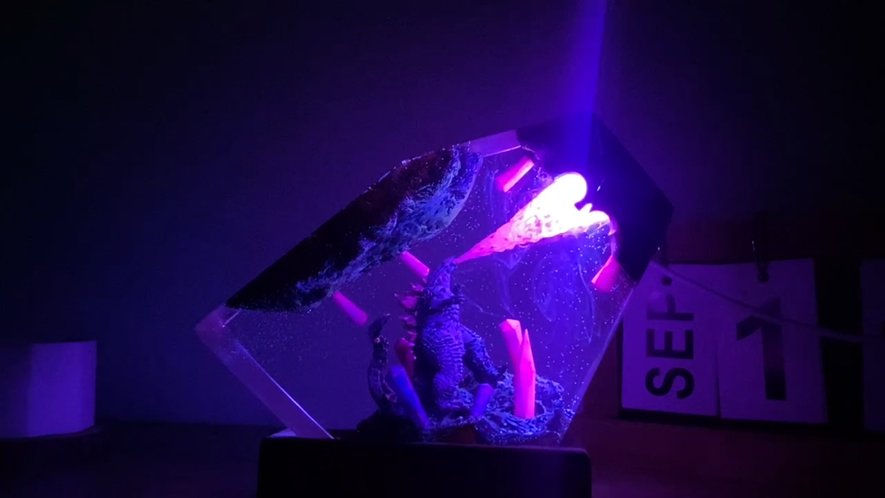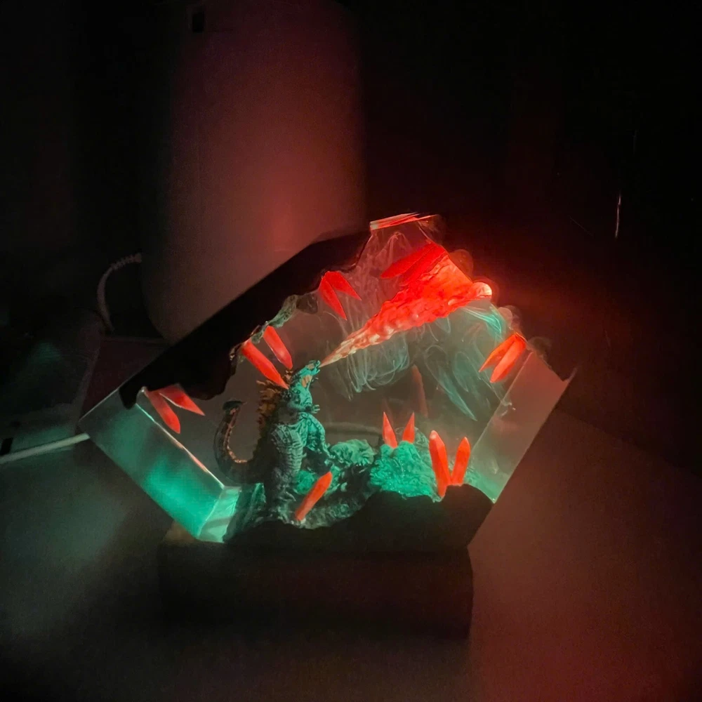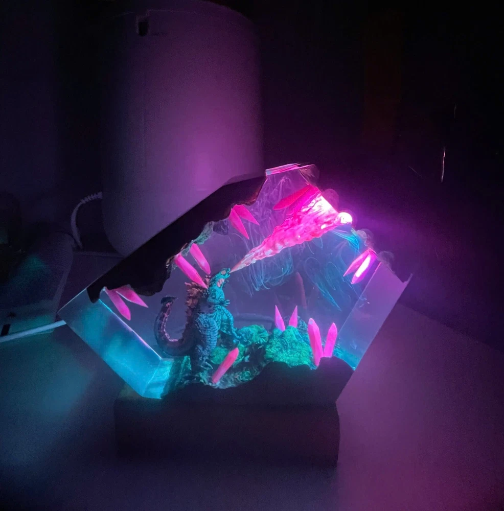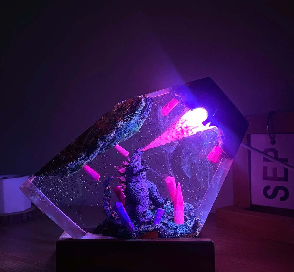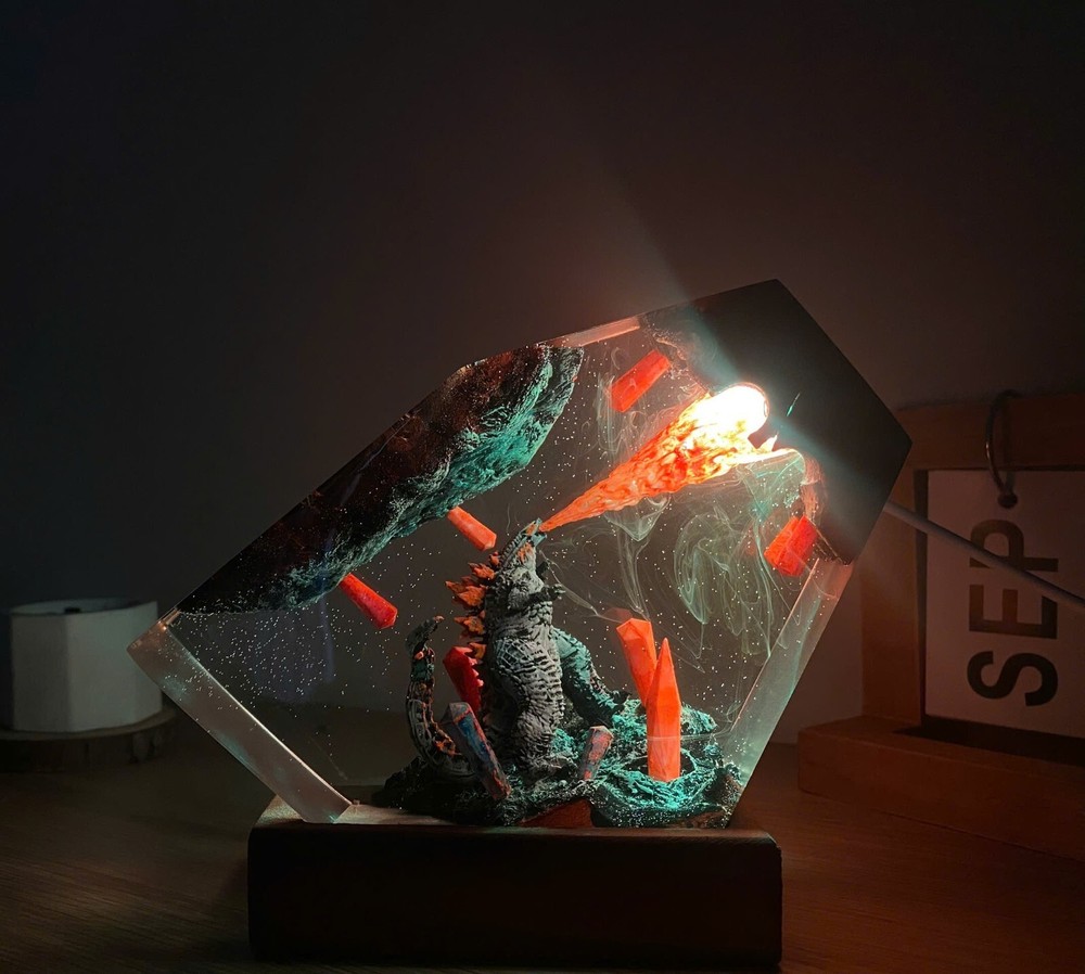 Godzilla Resin Lamp, Godzilla Handmade decor Epoxy Lamp, Unique Handmade Godzilla Gift for Room Decor, Resin Night light gift for Christmas Add a touch of magic to your nighttime routine with this custom night light featuring a stunning epoxy dragon design. With a range of light colors to choose from including red, clear white, blue, yellow, warm white, and green, you can pick the perfect hue to set the mood in your room. The lamp is USB powered and comes with a remote control, making it easy to adjust the brightness and color settings. This night light is perfect for indoor and outdoor use, whether you want to add a cozy touch to your bedroom, living room, or workspace. It's a great gift for any occasion, including Christmas, weddings, birthdays, and more. The lamp is made from high-quality materials including resin, LED lamp, epoxy, and wood, ensuring a durable and long-lasting use. The output voltage is 3V, and the lamp weighs 2lb. Bring a touch of supernatural beauty to your home with this stunning dragon night light. As you gaze upon this exquisite resin creation, you will be transported to the realm of Westeros, where the Fire Dragon and Ice Dragon clash in a breathtaking display of power and might. Crafted from a combination of wood and epoxy resin, this night light showcases intricate details and a captivating design. The Fire Dragon, with its fiery red scales and blazing breath, confronts the Ice Dragon, adorned with shimmering white fur and icy breath. The clash of their elemental forces creates a scene of intense drama and suspense. Flames and frost intertwine, illuminating the room with a kaleidoscope of colors, bringing the battle to life before your very eyes. Our night light products are very suitable as gifts for important holidays. Father's Day, Mother's Day, Birthday, New Home Gift, Wedding Gift, Graduation Gift, Baby Gift, Halloween Gift, Christmas Day, Holiday Gift thanksgiving, day to celebrate the 3 saints...... 1. Lamp size - Size M: 6.8''x5.2'' Suitable for baby's bedroom. - Size L: 8.8"x6.7" Suitable for adult bedrooms. - Size XL: 10"x8" Suitable for adult bedrooms, living room, office, hallway and home decoration. 2. Color of the light. - The main color of plastic we often use is ocean blue so it is most similar to the color of the ocean. In addition, if the customer wants to change the color of the plastic, we can change it according to the customer's preferences. Because the product is 100% handmade, it can be customized right from the production stage. - The LED light color we use is a 5V LED light that can change 16 colors at will and adjust the light intensity to your liking. 3. Production and shipping time. Our production time after you place your order will average 5 - 7 business days. Normal shipping will take 10-15 days. In addition, if you require fast shipping, we use a super fast shipping service that takes 3-5 days to reach the customer. 4. Product goals The product is completely handmade by skilled workers from Vietnam. Your order will contribute a small part to feed struggling families in a still poor country like Vietnam. Thank you for your interest and order. Note: The product delivered to the customer will have a slight change in the shape of the piece of wood in the lamp because it is impossible to find similar pieces of wood that are 100% identical to the sample photo, but it does not differ too much from the sample photo and may reaching 95% similarity.