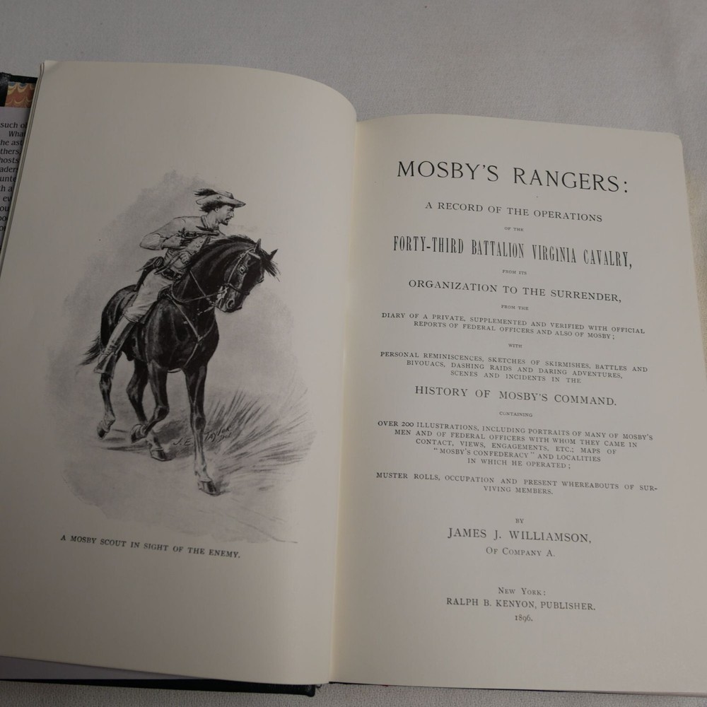 Mosbys Rangers By James J. Williamson 1982 Time-Life Books Leather Collectors Library Of The Civil War Book Dive into the Civil War with this collector's edition of "Mosby's Rangers." Perfect for history buffs who prefer their books like their leather: bound and serious, but not too serious. • Hardbound leather cover • Published by Time-Life Books • Reprinted in 1982 • 511 pages • Embossed cover illustration • Gold lettering • Historical account of Mosby's Rangers Slight wear on cover edges. Cover has cracks between cover and pages on back page.