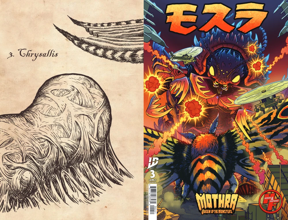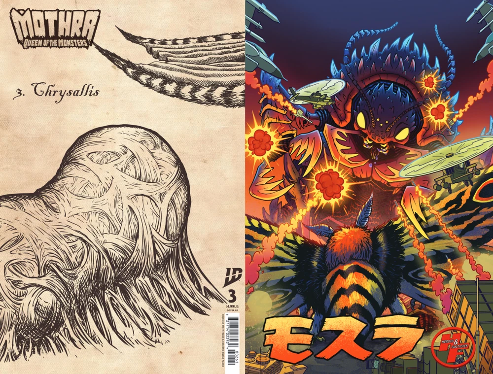 Pre order your Heroes & Fantasies Matt Frank exclusive cover of Mothra Queen of the Monsters #3 Cover artists: Matt "The Kaiju King" Frank & Samantha Wright -Regular Cover -- $12.00 -Virgin Foil Cover --$30.00 - Set of both Regular + Foil Cover --$42 Issues #1-5 have a connecting cover on the back and will also be available for preorder on our website. Heroes & Fantasies- The Largest Comic Shop in Texas