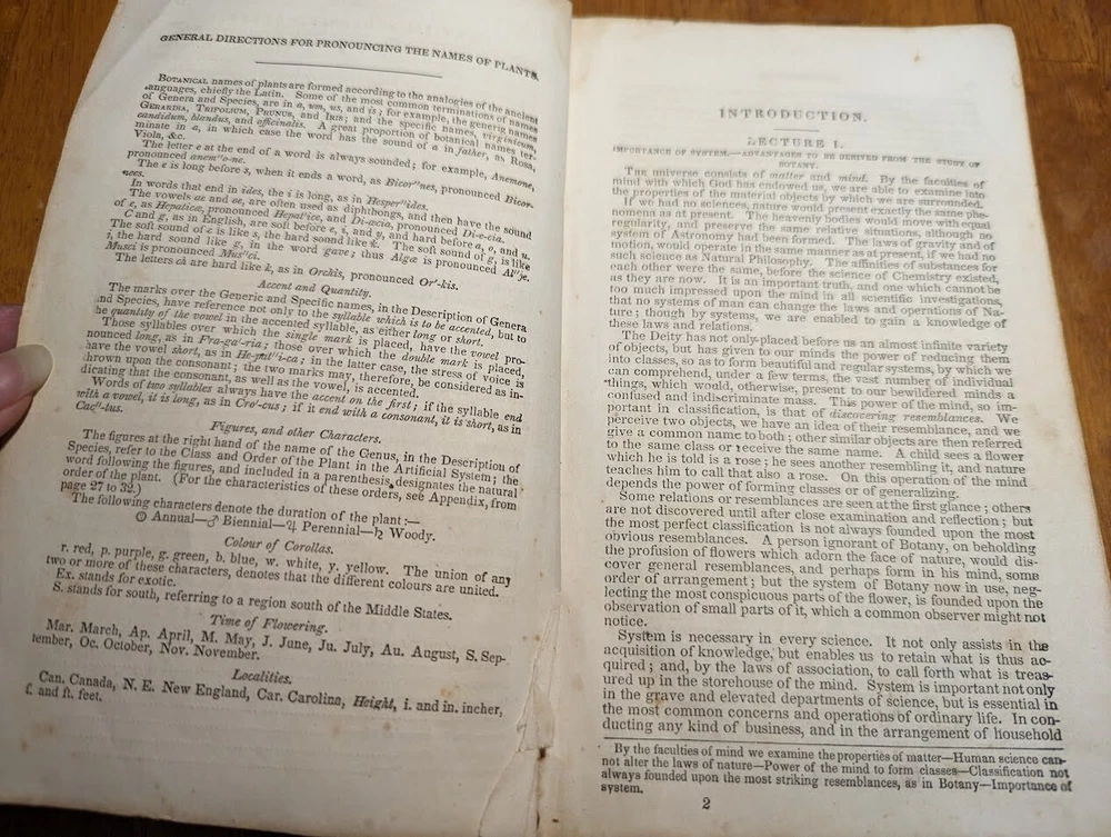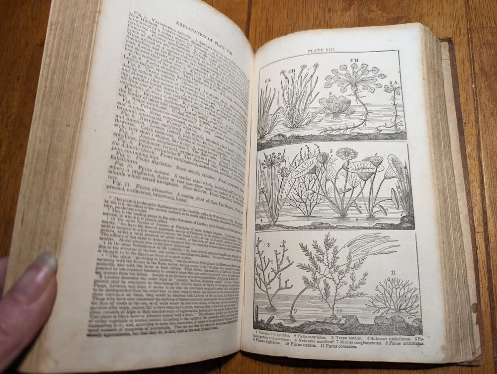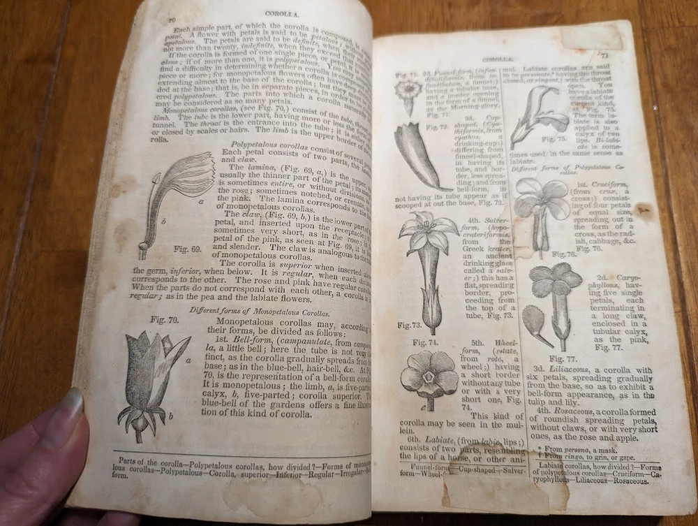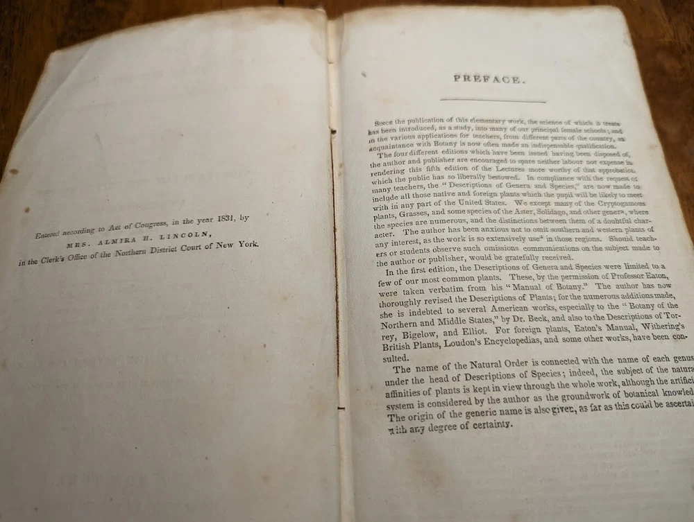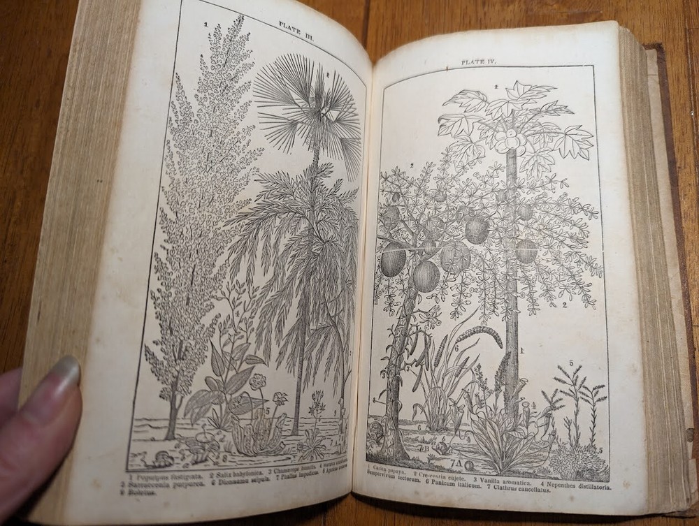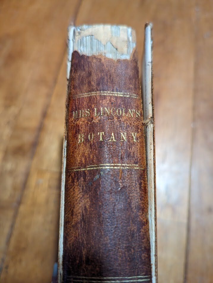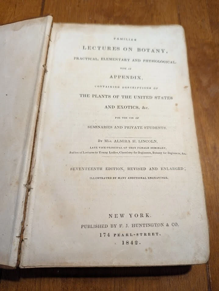 "FAMILIAR LECTURES ON BOTANY, Practical, Elementary and Physiological, with an APPENDIX, containing descriptions of THE PLANTS OF THE UNITED STATES AND EXOTICS, &c. for the use of seminaries and private students. By Mrs. Almira H. Lincoln, late vice-principal of Troy Female Seminary, Author of Lectures to Young Ladies, Chemistry for Beginners, Botany for Beginners, &c." 17th edition, 1842, revised and enlarged, with many additional engravings. Title says it all, its pretty much every single bit of science relating to plants; their description, anatomy, reproduction, agriculture and care, habitats, all that. several different glossaries and indexes, for easy reference. also includes the "language of flowers", which is what each flower symbolizes in art and bouquets. i took pictures of just random pages, so you can get a good idea of both what's contained in here, plus the condition. SPECS: about 8 x 5 x 1.25". 186 pages, but it is tiiiiiny font. about 150 or so illustrations. full leather cover. CONDITION: poor. leather at top of spine is missing, front and back boards are literally hanging on by a thread. leather worn all over, with another chunk missing at back side. the first few pages are detached but still included. pages yellowed, with foxing and stains throughout. it's clearly been read a lot. several owners names, some math equations, and a review or something written in pencil (too light to make out), in the last few pages. i oiled and waxed the leather a few years ago, to keep the condition from getting worse, so it will probably need another treatment in another year or two. please see pics. Please check out my eBay store for more old and rare books from my personal collection, including several other illustrated books on plants and natural sciences.