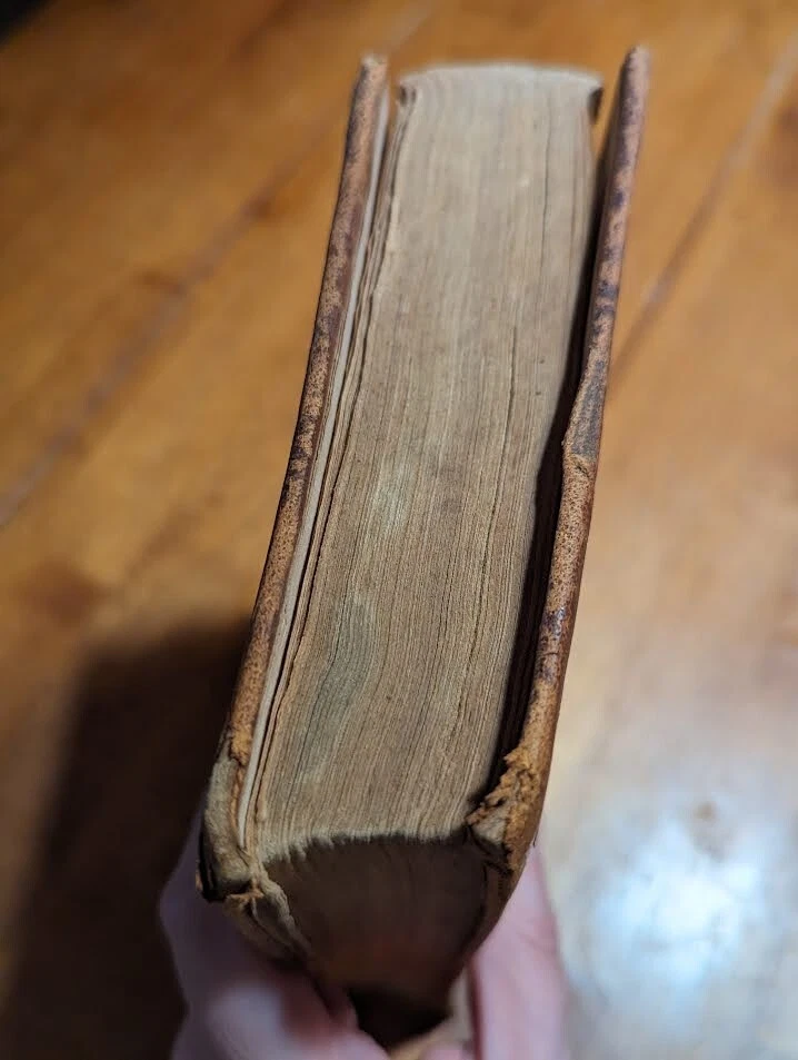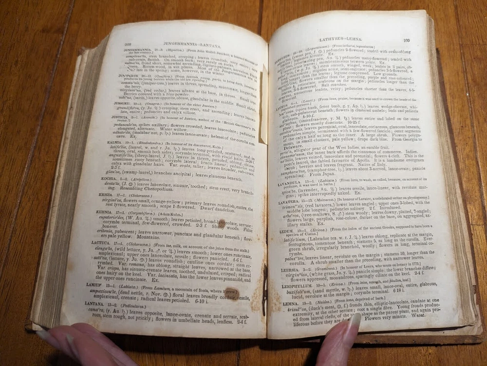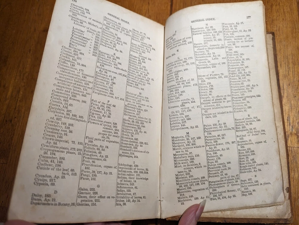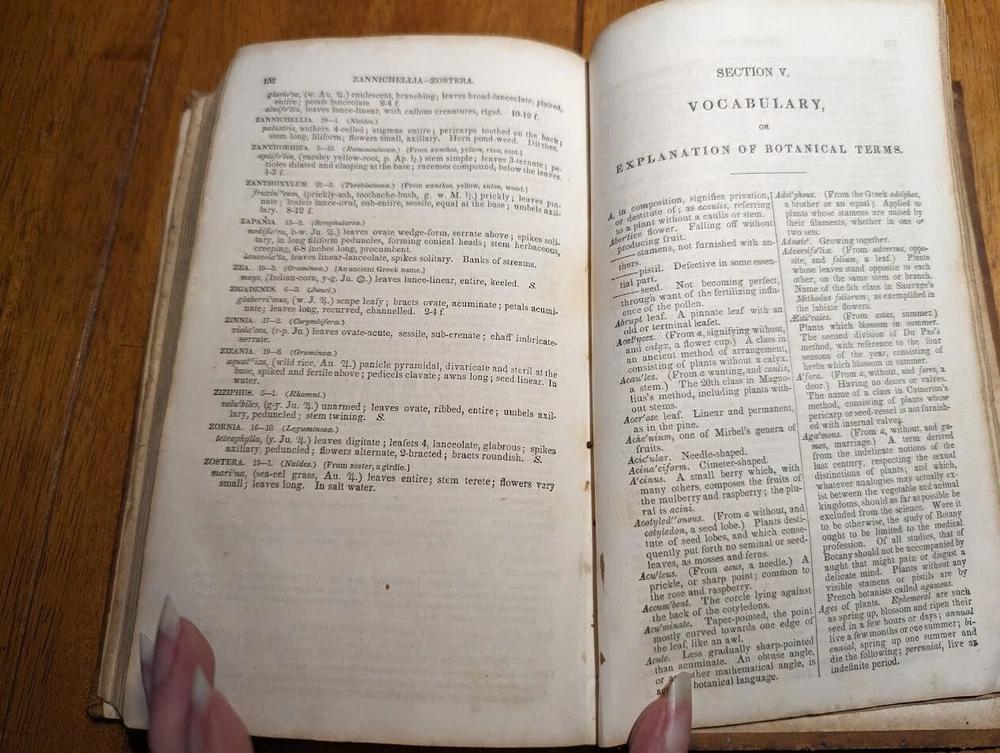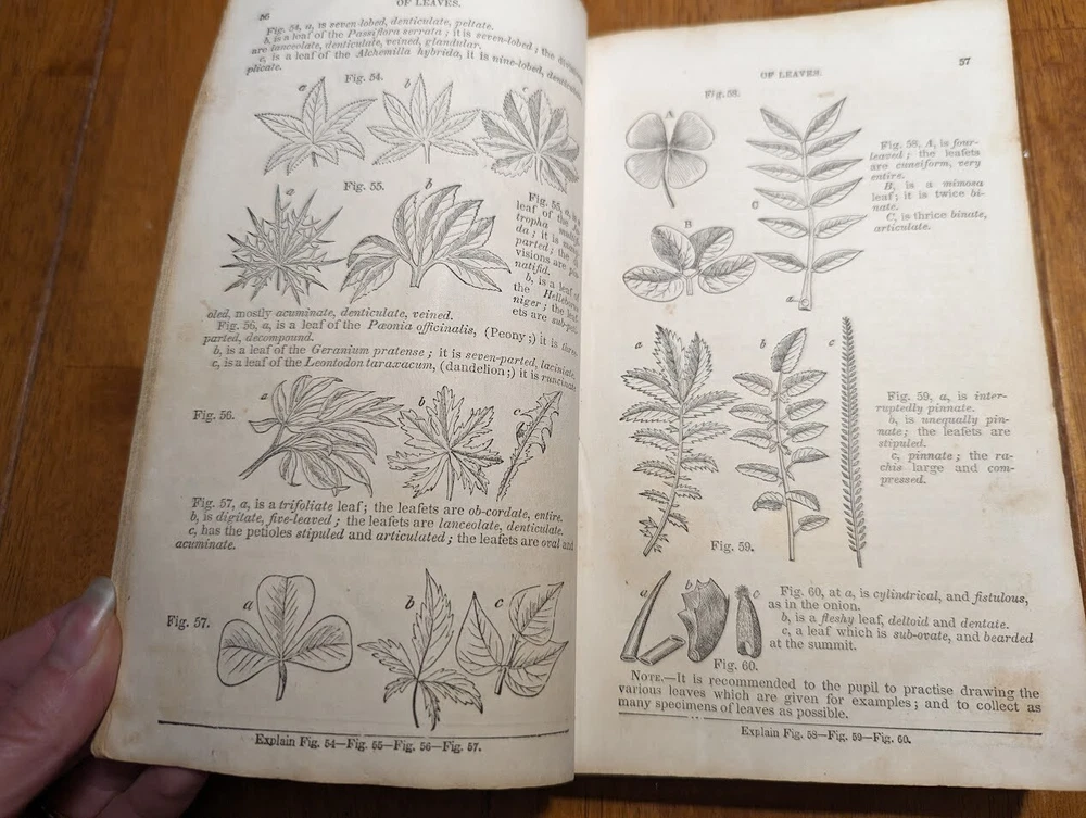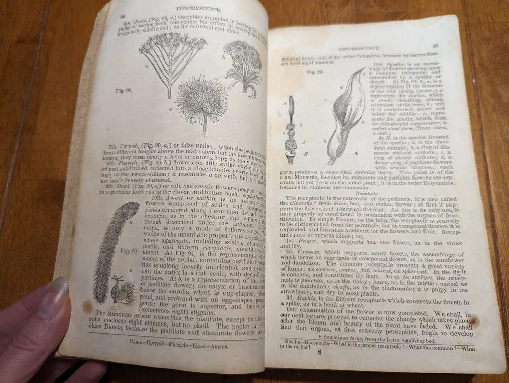 "FAMILIAR LECTURES ON BOTANY, Practical, Elementary and Physiological, with an APPENDIX, containing descriptions of THE PLANTS OF THE UNITED STATES AND EXOTICS, &c. for the use of seminaries and private students. By Mrs. Almira H. Lincoln, late vice-principal of Troy Female Seminary, Author of Lectures to Young Ladies, Chemistry for Beginners, Botany for Beginners, &c." 17th edition, 1842, revised and enlarged, with many additional engravings. Title says it all, its pretty much every single bit of science relating to plants; their description, anatomy, reproduction, agriculture and care, habitats, all that. several different glossaries and indexes, for easy reference. also includes the "language of flowers", which is what each flower symbolizes in art and bouquets. i took pictures of just random pages, so you can get a good idea of both what's contained in here, plus the condition. SPECS: about 8 x 5 x 1.25". 186 pages, but it is tiiiiiny font. about 150 or so illustrations. full leather cover. CONDITION: poor. leather at top of spine is missing, front and back boards are literally hanging on by a thread. leather worn all over, with another chunk missing at back side. the first few pages are detached but still included. pages yellowed, with foxing and stains throughout. it's clearly been read a lot. several owners names, some math equations, and a review or something written in pencil (too light to make out), in the last few pages. i oiled and waxed the leather a few years ago, to keep the condition from getting worse, so it will probably need another treatment in another year or two. please see pics. Please check out my eBay store for more old and rare books from my personal collection, including several other illustrated books on plants and natural sciences.