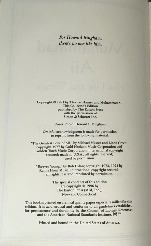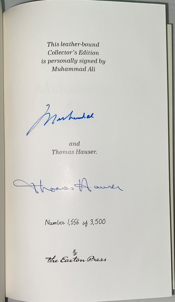 Muhammad Ali His Life and Times by Thomas Hauser - Signed by Muhammad Ali and Thomas Hauser! Number 1556 of 3500 Part of the Signed Collector's Edition collection of The Easton Press, Norwalk, Connecticut, 1996. This book is in excellent, unread condition. The Easton Press books are bound in genuine leather binding, with 22kt gold accents and hubbed spines, gilded page ends, acid-neutral paper, Moire fabric endsheets, and evocative illustrations and decorations. We will be happy to combine shipping, wherever possible. Some items cannot be combined because of their size, weight or because they are fragile. Please ask if you have any questions. Your order will ship by the next business day after receiving payment. All items are from a smoke-free environment. Thank you, and Happy Reading!