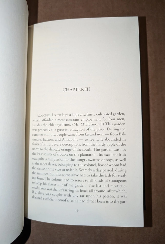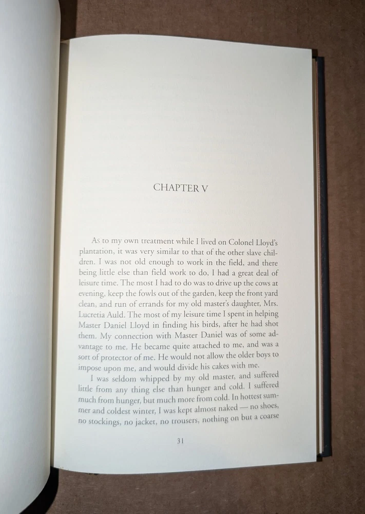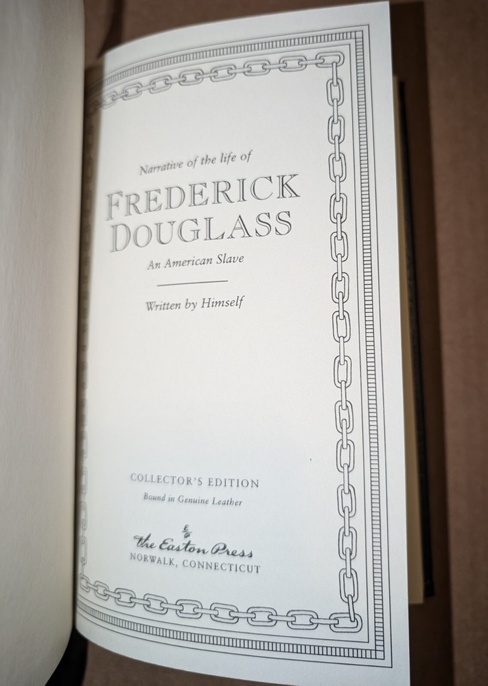 Narrative of the Life of Frederick Douglass, an American Slave. Written by himself. Norwalk, CT: The Easton Press, 1998. Bound in the usual Easton manner: full leather, gilt titles and decorations, all edges gilt, silk moire endpapers. Facsimile of the 1845 Boston title page. Minimal shelfwear, a bit of dust soiling to top of textblock, else near fine. Free Media Mail shipping in the US. Shipped outside the US at cost via eBay's International Shipping. Please contact me with questions.