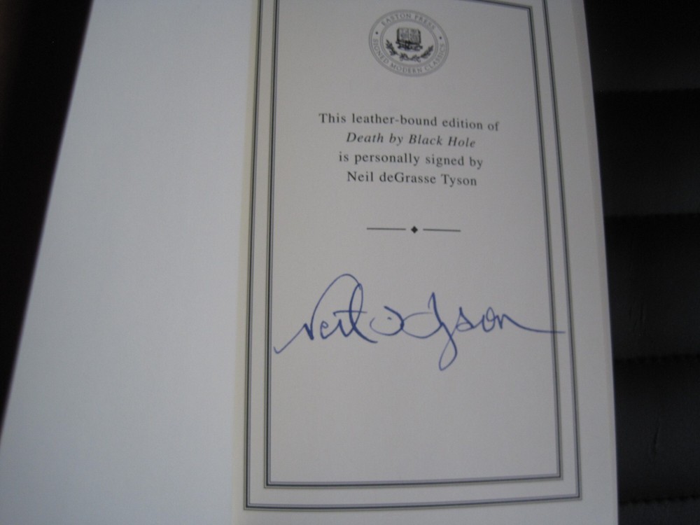 This is a leather bound signed collector's edition of Dr. Neil DeGrasse Tyson's best-seller - "Death By Black Hole", a fascinating new book by the brilliant astrophysicist and TV personality. The book is unread and in great condition, and it is beautifully signed by the author on the limitation page. Easton Press books are the golden standard in the publishing industry, highly collectible and lasting generations. Easton Press Full Genuine Leather Dubbed Spine Accented Wit 22 kt. Real Gold Satin Ribbon Page Marker Distinctive Cover Design Gilded Page Edges To Protect Against Humidity High Quality Acid - Free paper Smyth-Sewn Pages Silk-Moire Endleaves I combine multiple items for savings on shipping charges. I ship worldwide. Please ask about international shipping charges and/or different shipping options. Please check out my other auctions for several rare signed books for sale. Thank you!