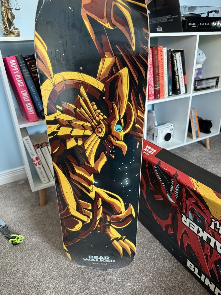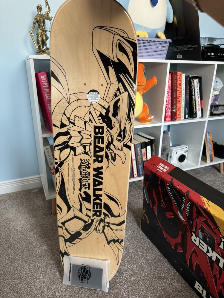Brandish your passion for Yu-Gi-Oh with the limited edition Bear Walker X The Winged Dragon of RA skateboard. This rare piece, numbered #806 out of 2500, is a must-have for any collector or skater looking to showcase their love for the iconic trading card game. Crafted by Bear Walker, this skateboard deck combines artistry with functionality, making it a unique addition to your skateboarding gear. Get ready to hit the streets in style and make a statement with this exclusive collaboration.