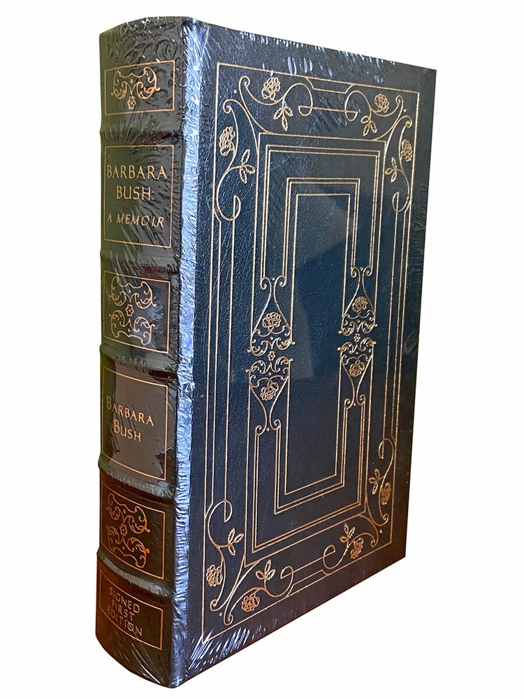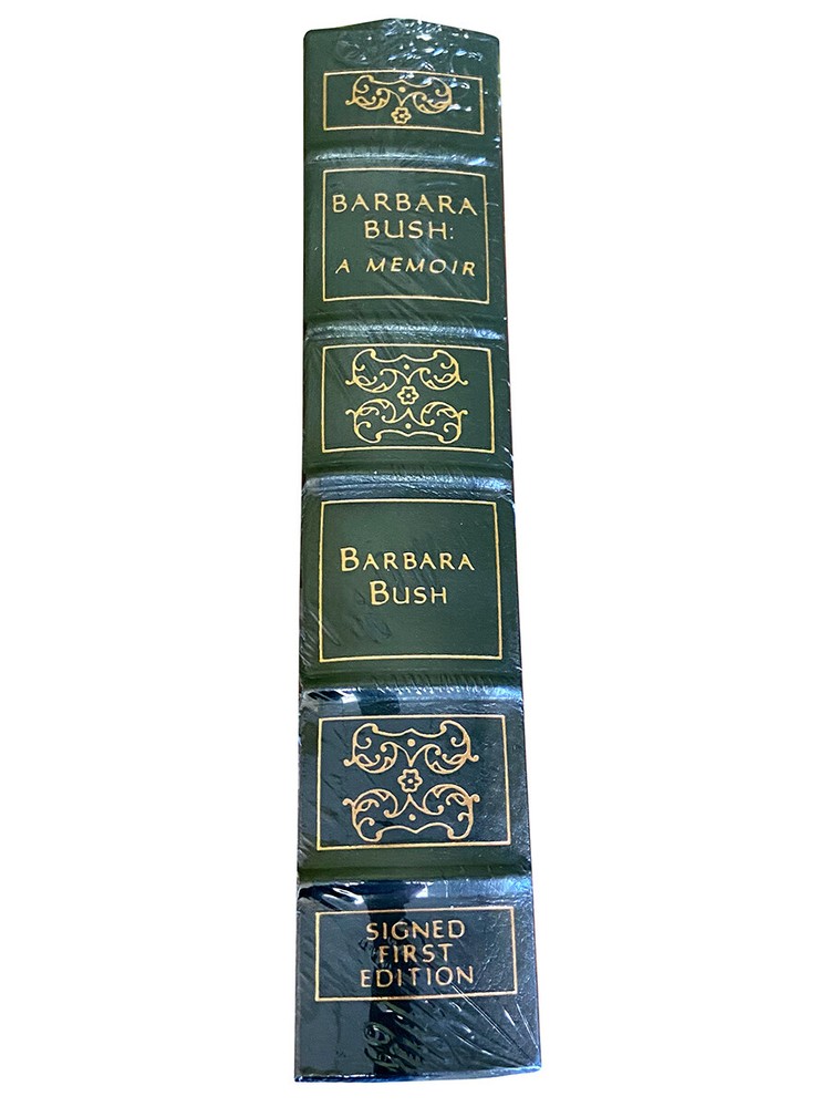 This Signed First Edition Has Been Personally Signed By Barbara Bush Easton Press 1994. Barbara Bush "Barbara Bush: A Memoir". A magnificent leather bound heirloom for your presidential library. A must for the Presidential and First Lady rare book collector! Signed First Edition, personally signed by Barbara Bush on the special title page. Luxuriously bound in full genuine leather. 575 pages. Sealed without any flaws. "A MEMOIR" is Barbara Bush's first bestselling autobiography. It is an inspiring memoir from Barbara Bush, First Lady. A wonderful account of her life from childhood through being the wife of President George Herbert Walker Bush, and First Lady of the United States. The classic #1 New York Times bestselling memoir, celebrating the life and legacy of First Lady Barbara Bush—now updated with new forewords from her five children, including reflections from George W. and Jeb, as featured on A&E’s Biography. Barbara Bush endures as one of America’s most popular First Ladies. She has won worldwide acclaim for her wit, compassion, and candor as both a presidential wife and mother. In this fascinating memoir, Mrs. Bush offers a heartfelt portrait of her life in and out of the White House, from her small-town schoolgirl days in Rye, New York, to her fateful union with George H.W. Bush, to her role as First Lady of the United States. Here, she writes candidly about her early years with George Bush in West Texas and the tragic death of their young daughter, Pauline. She also discusses the world of Washington politics and the famous figures she’s met, as well as the disappointment of the 1992 presidential campaign—and the mixed blessing of regaining her private life, including her role as the nation’s leading literacy champion. Filled with entertaining anecdotes, thirty-two pages of personal photographs, and a healthy dose of introspection, this memoir is “a book of good grace and humor—written in a style that, like the author herself, is straightforward, unembellished, generous, good-hearted, and wise…A pleasure” (The Washington Times). Features Includes the classic Easton Press qualities: * Premium Leather * Silk Moire Endleaves * Distinctive Cover Design * Hubbed Spine, Accented in Real 22KT Gold * Satin Ribbon Page Marker * Gilded Page Edges * Long-lasting, High Quality Acid-neutral Paper * Smyth-sewn Pages for Strength and Durability * Beautiful Illustrations About Barbara Bush Barbara Bush (June 8, 1925 – April 17, 2018) was the first lady of the United States from 1989 to 1993 as the wife of George H. W. Bush, who served as the 41st president of the United States, and founder of the Barbara Bush Foundation for Family Literacy.[1] She previously was the second lady of the United States from 1981 to 1989. Among her six children are George W. Bush, the 43rd president of the United States, and Jeb Bush, the 43rd governor of Florida. She and Abigail Adams are the only two women to be married to one U.S. president and the mother of another. Barbara Pierce was born in Booth Memorial Hospital in New York City. She met George Herbert Walker Bush at the age of sixteen, and the two married in Rye, New York in 1945, while he was on leave during his deployment as a Naval officer in World War II. They moved to Texas in 1948, where George later began his political career.