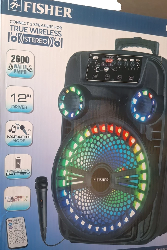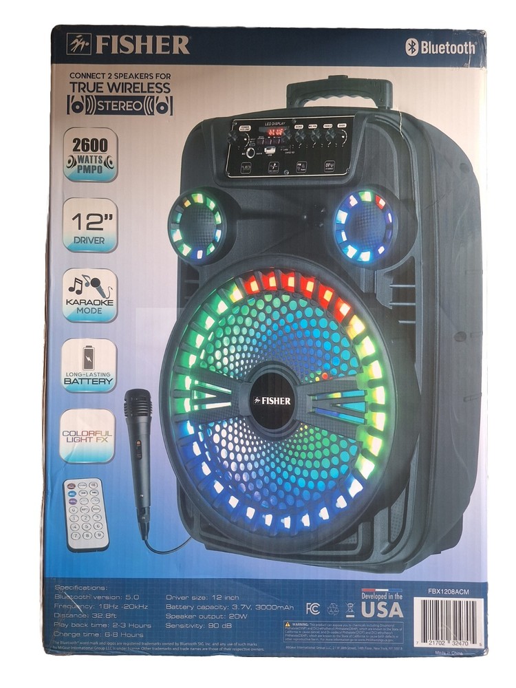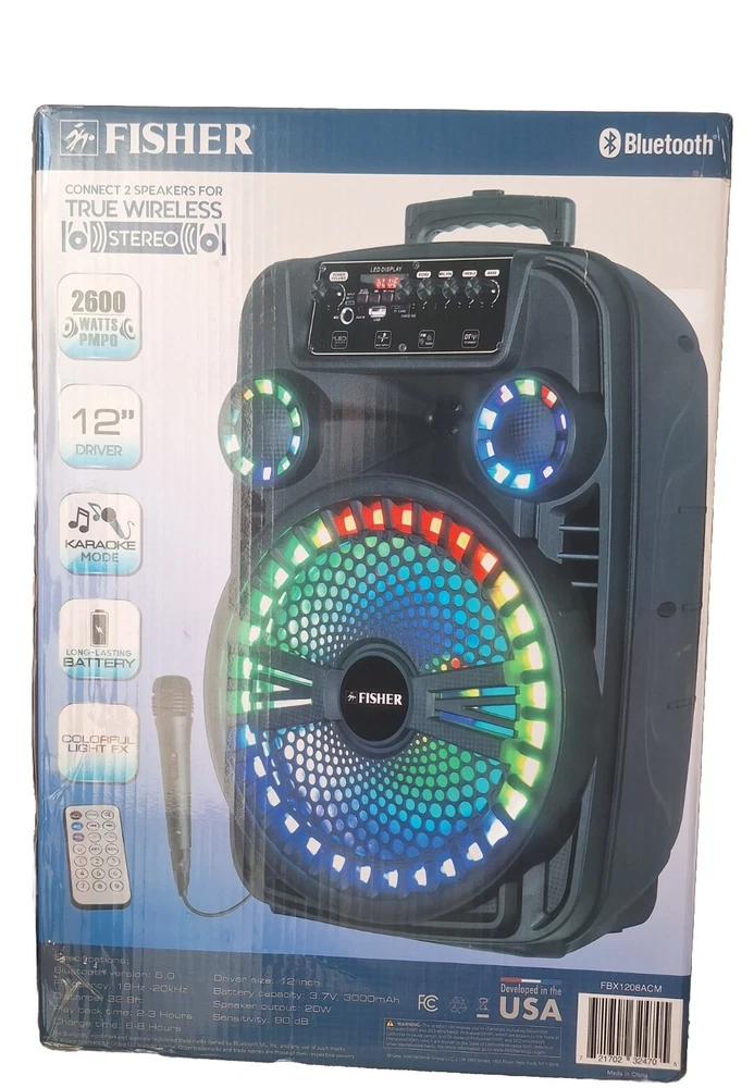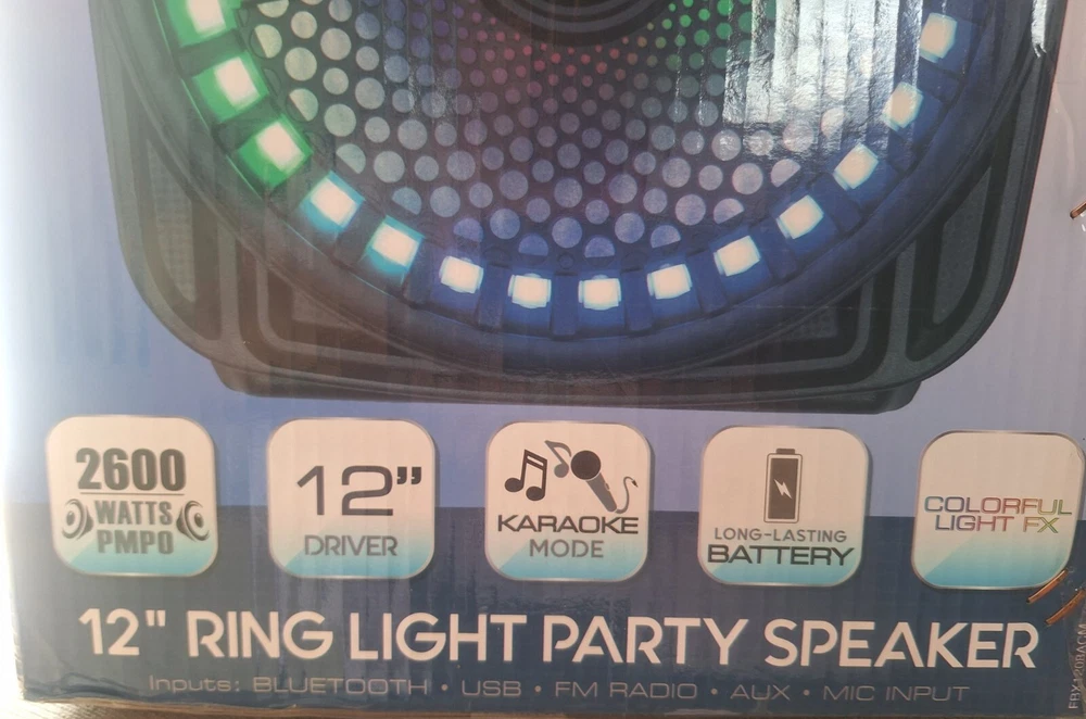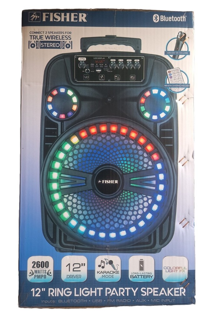 Get ready to elevate your party experience with the Fisher 12" Ring Light Party Speaker. This speaker is the perfect addition to any gathering, offering a powerful 2600 watts of sound that will keep the party going all night long. With its sleek black design and colorful light FX, this speaker is as stylish as it is functional. Connect your device via Bluetooth, AUX, or USB to play your favorite tunes, or use the built-in FM radio to discover new ones. The LED flame light adds an extra touch of ambiance to any setting, while the mic input lets you take center stage and karaoke the night away. This speaker is compatible with universal systems, and is made from durable plastic materials. Free Shipping!!!