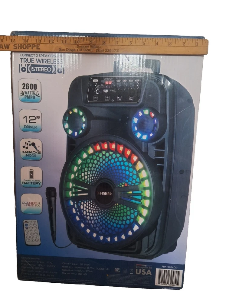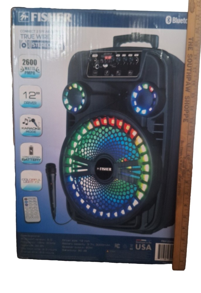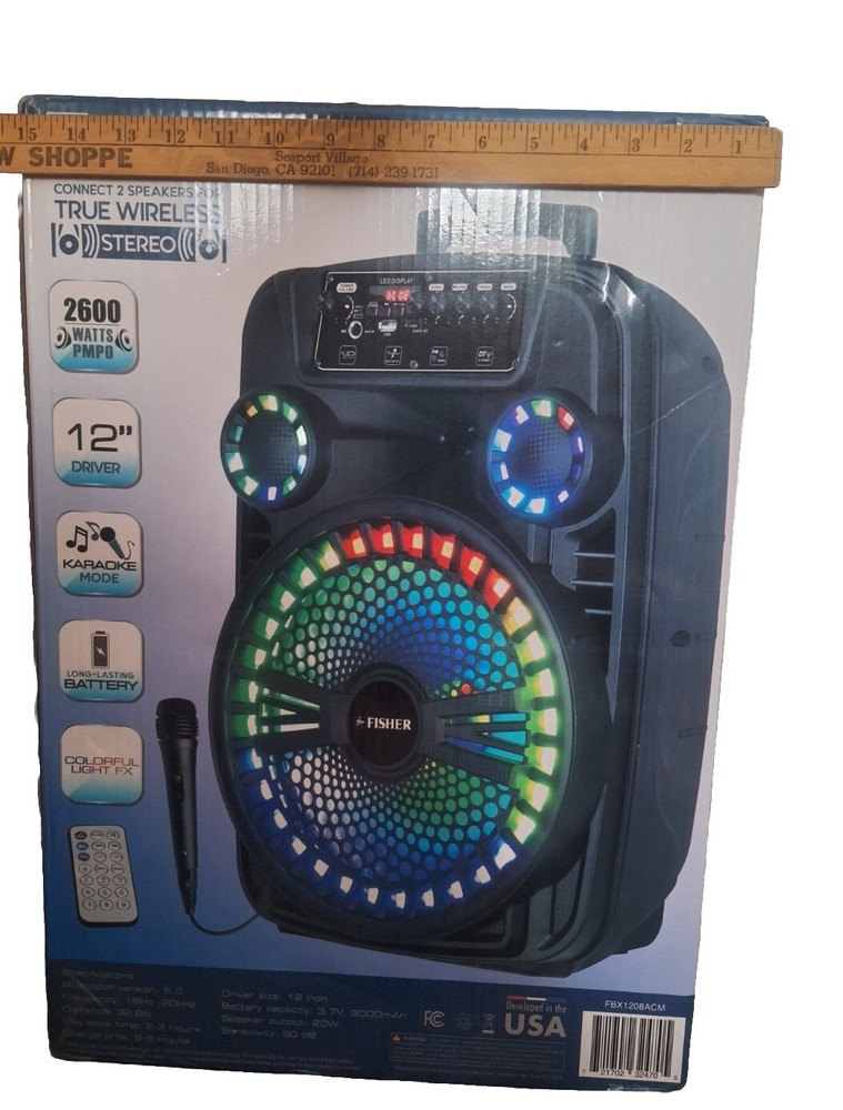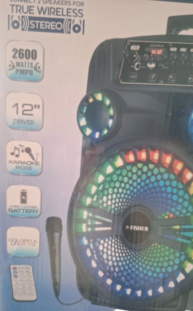 Get ready to elevate your party experience with the Fisher 12" Ring Light Party Speaker. This speaker is the perfect addition to any gathering, offering a powerful 2600 watts of sound that will keep the party going all night long. With its sleek black design and colorful light FX, this speaker is as stylish as it is functional. Connect your device via Bluetooth, AUX, or USB to play your favorite tunes, or use the built-in FM radio to discover new ones. The LED flame light adds an extra touch of ambiance to any setting, while the mic input lets you take center stage and karaoke the night away. This speaker is compatible with universal systems, and is made from durable plastic materials. Free Shipping!!!