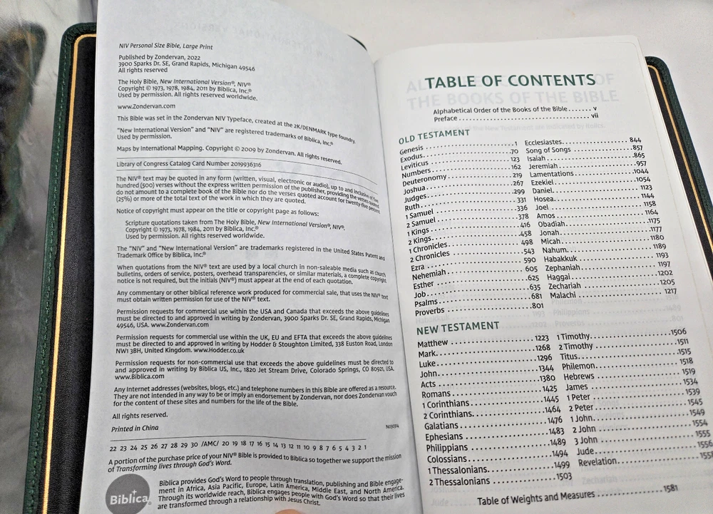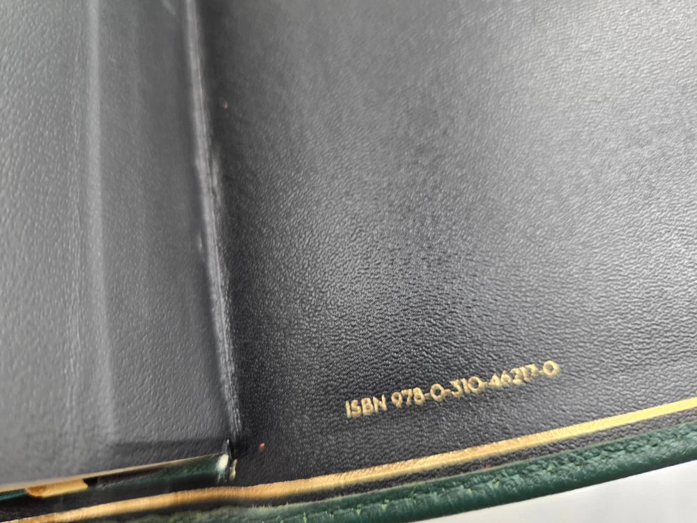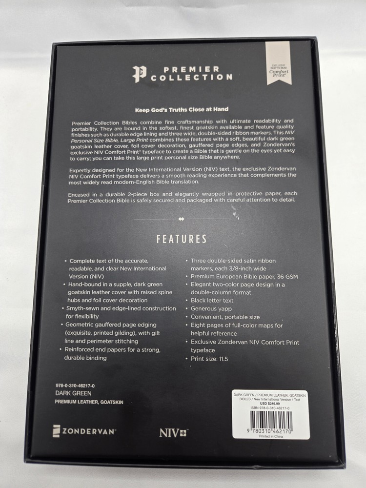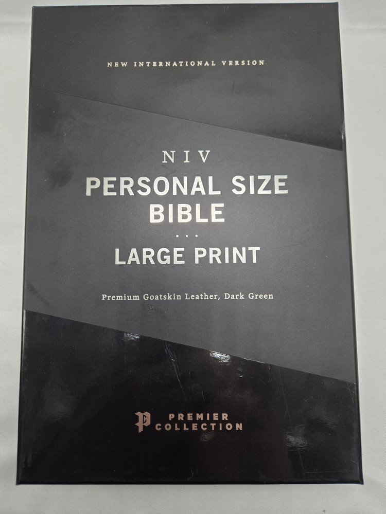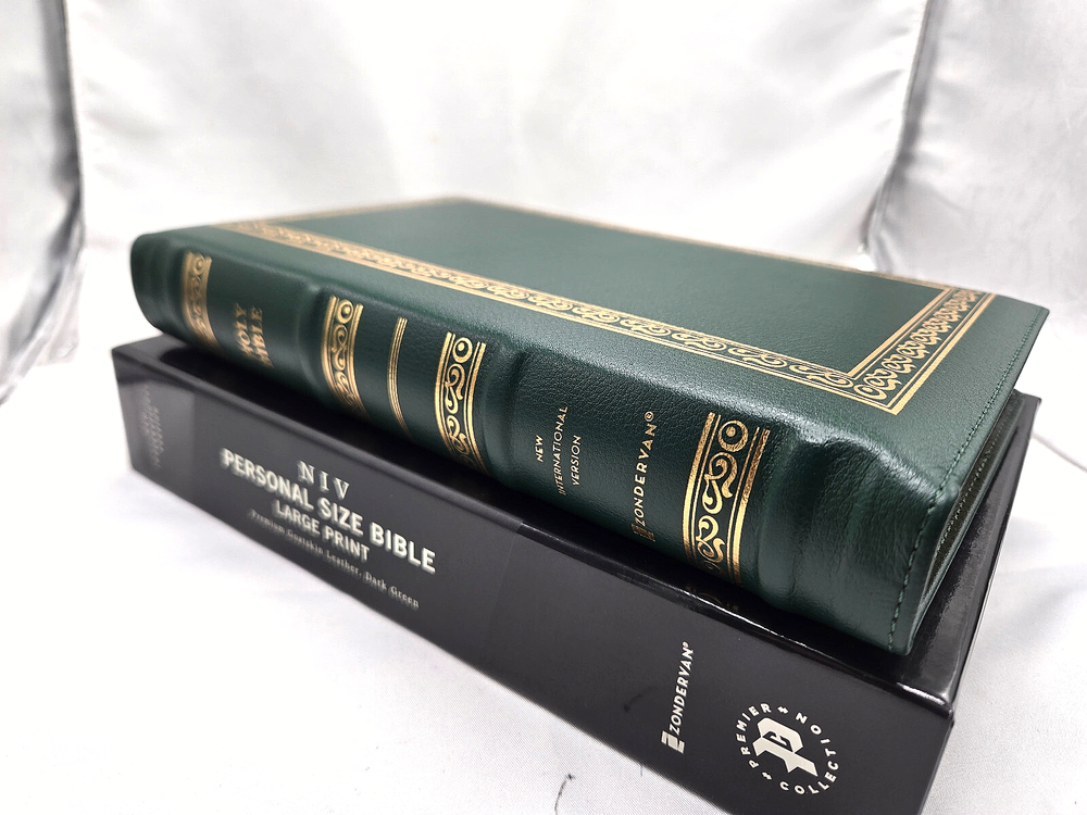 NIV, Personal Size Bible, Large Print, Premium Goatskin Leather, Green, Premier Collection, Black Letter, Gauffered Edges, Comfort Print Leather Bound – Large Print, October 11, 2022 Features: Complete text of the accurate, readable, and clear New International Version (NIV) Hand-bound in a supple, dark green goatskin leather cover with raised spine hubs and foil cover decoration Smyth-sewn and edge-lined construction for flexibility Geometric gauffered page edging (exquisite, printed gilding), with gilt line and perimeter stitching Reinforced end papers for a strong, durable binding Three double-sided satin ribbon markers, each 3/8-inch wide Premium European Bible paper, 36 GSM Elegant two-color page design in a double-column format Black-letter text Generous yapp Convenient, portable size Eight pages of full-color maps for helpful reference Exclusive Zondervan NIV Comfort Print typeface Print size: 11.5