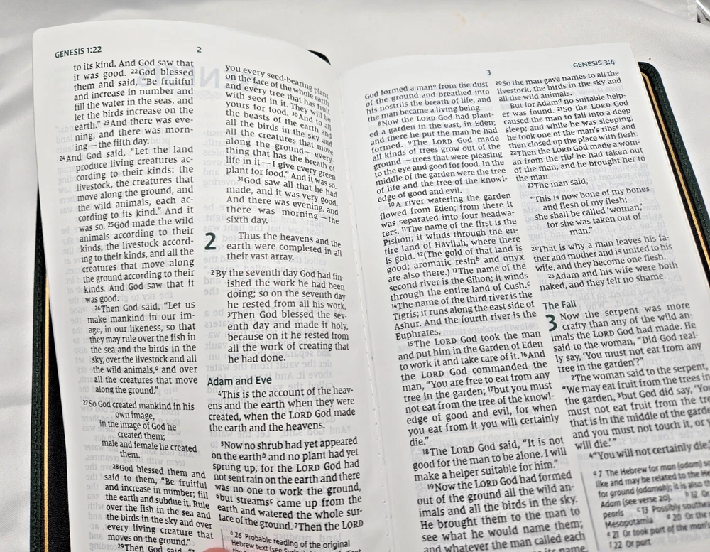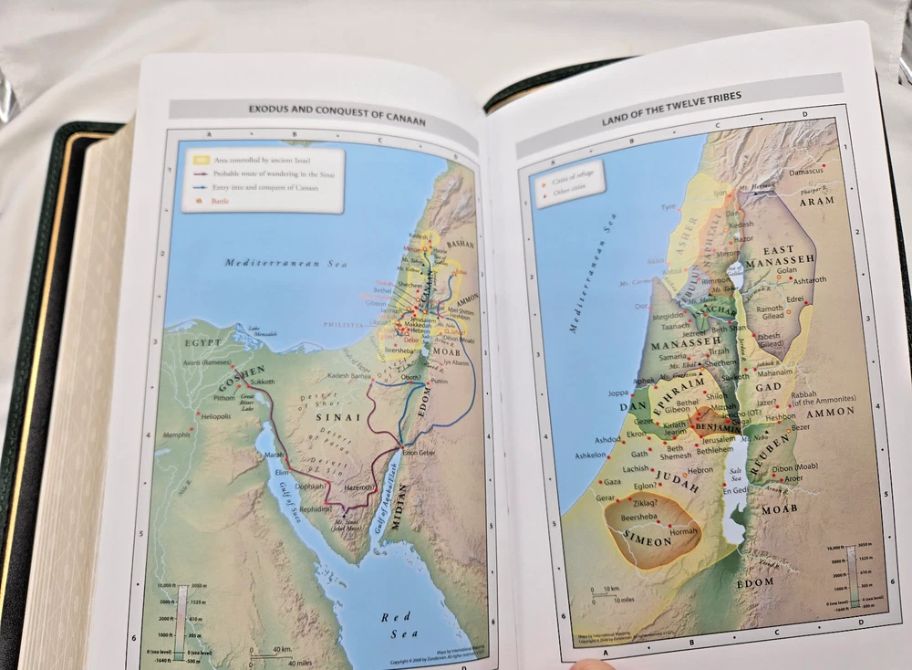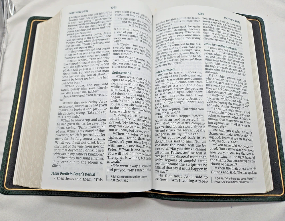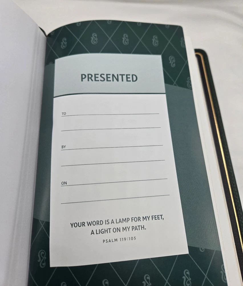 NIV, Personal Size Bible, Large Print, Premium Goatskin Leather, Green, Premier Collection, Black Letter, Gauffered Edges, Comfort Print Leather Bound – Large Print, October 11, 2022 Features: Complete text of the accurate, readable, and clear New International Version (NIV) Hand-bound in a supple, dark green goatskin leather cover with raised spine hubs and foil cover decoration Smyth-sewn and edge-lined construction for flexibility Geometric gauffered page edging (exquisite, printed gilding), with gilt line and perimeter stitching Reinforced end papers for a strong, durable binding Three double-sided satin ribbon markers, each 3/8-inch wide Premium European Bible paper, 36 GSM Elegant two-color page design in a double-column format Black-letter text Generous yapp Convenient, portable size Eight pages of full-color maps for helpful reference Exclusive Zondervan NIV Comfort Print typeface Print size: 11.5