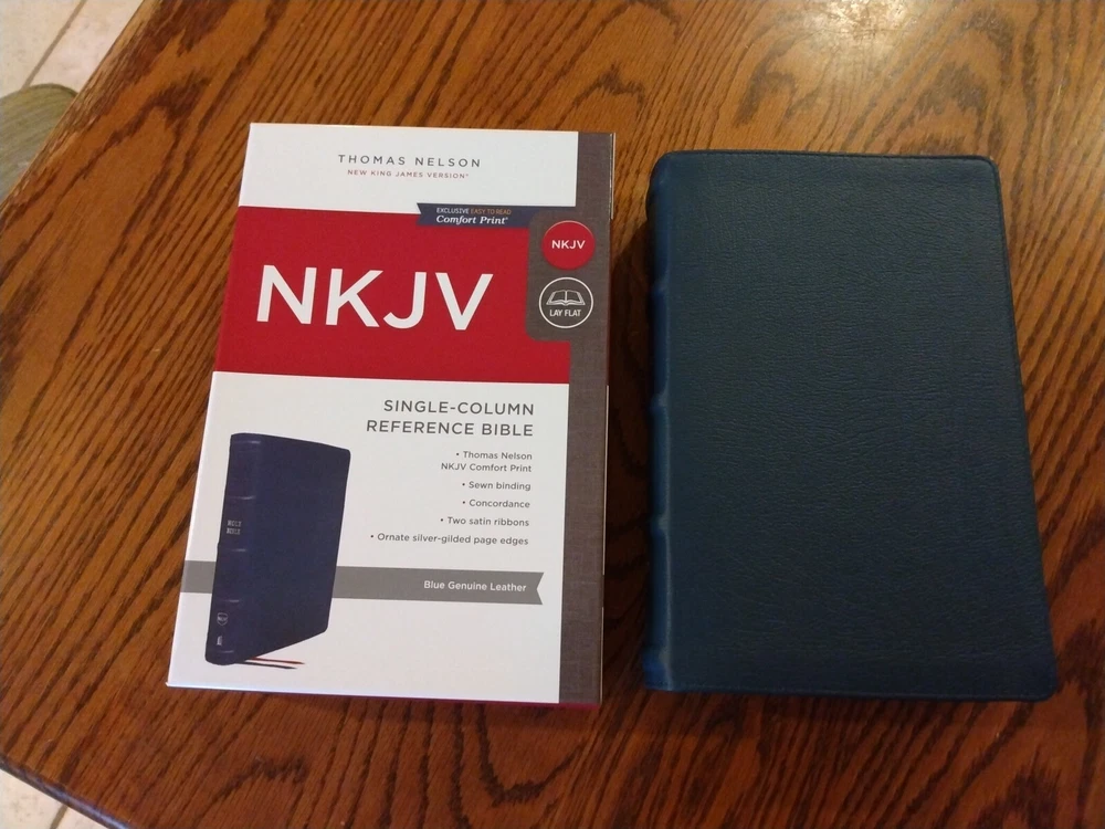 NKJV Single-Column Reference Bible Genuine Leather, Blue, Comfort Print Font/Text size is 10.5 point Dimensions: 8.75 X 5.75 X 1.75 (inches) Sewn Spine for durability Elegant single-column format Beautiful Thomas Nelson NKJV Comfort Print typeface More than 72,000 text cross-references Concordance Sewn lay-flat bindings Genuine leather cover Two satin ribbon markers 10.5-point print size Feel free to ask questions. I try to return and answer your questions in a timely manner and as soon as I am able. NO RETURNS. Please buy responsibly. Visit my eBay store at aboundingjoy66