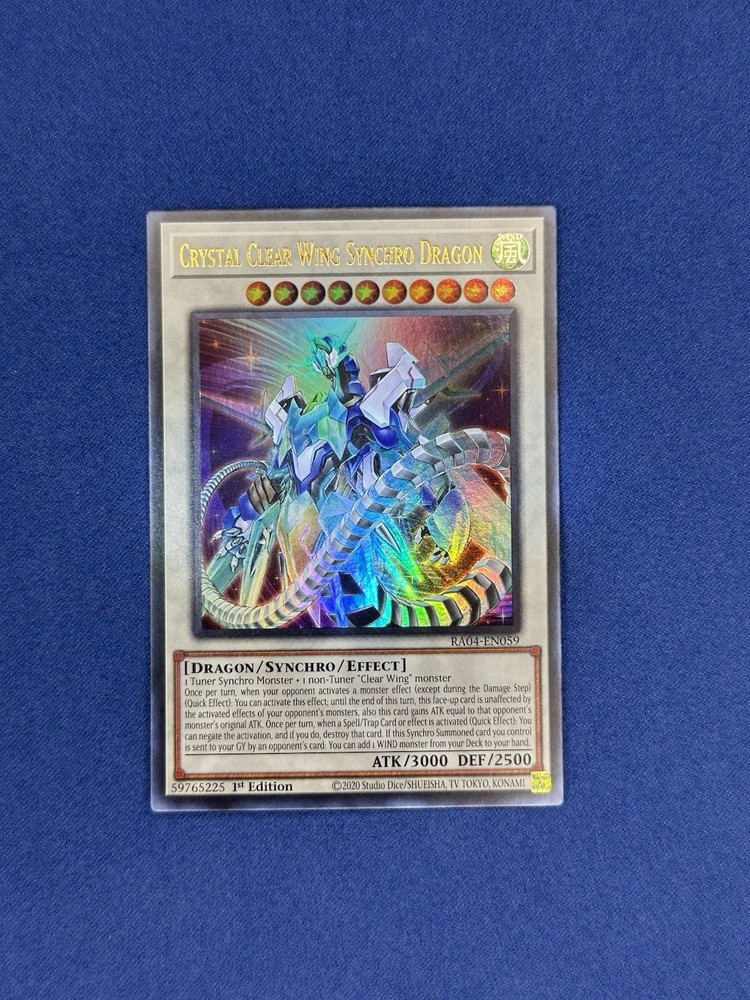 Up for sale is a 1st Edition Ultra Rare copy of CRYSTAL CLEAR WING SYNCHRO DRAGON from the Yu-Gi-Oh! Quarter Century Stampede (RA04-EN059). This powerful Synchro monster is a stunning evolution of the classic Clear Wing line, offering incredible negation and protection against spells, traps, and monster effects. Featuring a sleek Ultra Rare foil and detailed artwork, this version of Crystal Clear Wing is ideal for collectors and competitive duelists alike. Card Details: • Set: Quarter Century Stampede (RA04) • Rarity: Ultra Rare (UR) • Edition: 1st Edition • Language: English • Condition: Near Mint+ Pack fresh & sleeved immediately Why You’ll Love It: • Strong Synchro boss monster with built-in effect negation • Beautiful Ultra Rare finish with crisp detail • Perfect for Dragon, Synchro, or Clear Wing decks • A standout addition for collectors & competitive Shipping & Packaging: Card ships in a protective sleeve, top loader, and team bag with tracking included. Every order is packaged carefully to ensure safe arrival and condition preservation. Add a fan-favorite Synchro dragon to your Extra Deck or display with CRYSTAL CLEAR WING SYNCHRO DRAGON a must-have for any Yu-Gi-Oh! enthusiast!