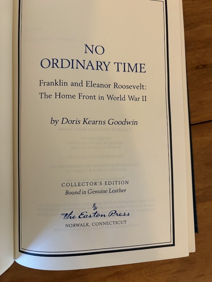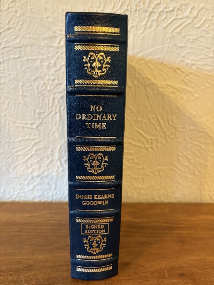 This is a rare and highly sought-after signed edition of "No Ordinary Time" by Doris Kearns Goodwin. The book is a luxury collector's edition produced by Easton Press in 1999. It features a beautiful leather binding and is a limited edition with only a certain number printed. The book is in its original form and is in English language. The book covers a political topic and was published in the United States. It is a biography and autobiography subject, with the author being Doris Kearns Goodwin. The book is not personalized and was printed in Norwalk, CT. This is a must-have for any book collector or enthusiast, and a great addition to any collection.