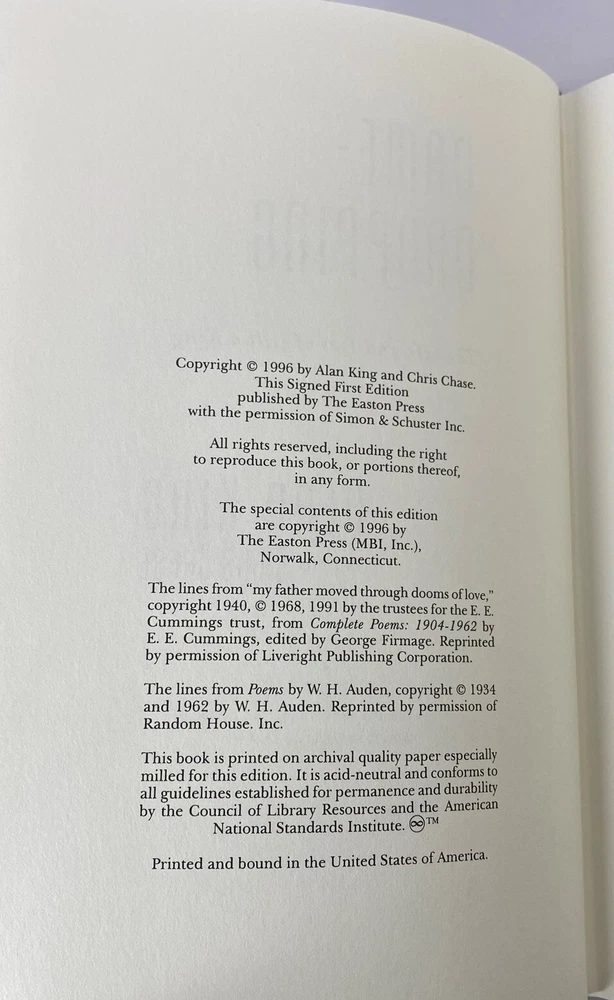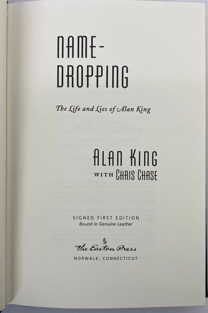 Name-Dropping : The Life and Lies of Alan King, Easton Press Signed 1st Edition Name-Dropping : The Life and Lies of Alan King, Easton Press Signed 1st Edition Name-Dropping : The Life and Lies of Alan King by Alan King # 736 of 1800 Part of the Signed First Edition collection of The Easton Press, Norwalk, Connecticut, 1996. This book is in excellent, unread condition. There is one small scratch at the bottom edge of the book. The Easton Press books are bound in genuine leather binding, with 22kt gold accents and hubbed spines, gilded page ends, acid-neutral paper, Moire fabric endsheets, and evocative illustrations and decorations. We will be happy to combine shipping, wherever possible. Some items cannot be combined because of their size, weight or because they are fragile. Please ask if you have any questions. Your order will ship by the next business day after receiving payment. All items are from a smoke-free environment. Thank you, and Happy Reading!