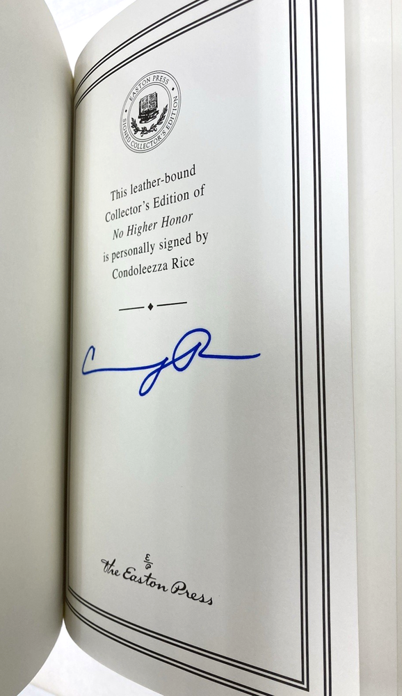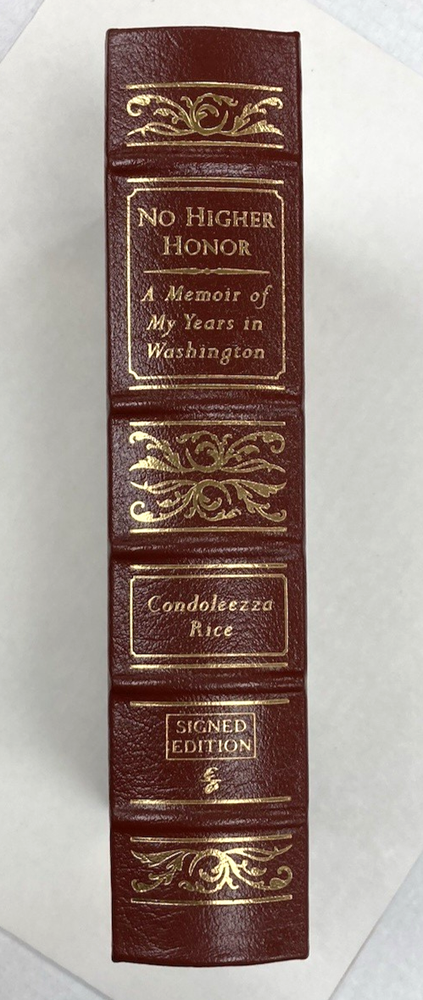 "No Higher Honor: A Memoir of My Years in Washington" by Condoleezza Rice. Easton Press, 2012, signed by Rice. COA, unused bookplate and "Note" laid in. Dark red full leather with bright gilt lettering and decoration; trace wear only. A few tiny scuffs to gilt edges. Binding sound and unread, interior clean. Brown silk moire eps and satin ribbon bookmarker. No prev owner names, stickers or stamps. Not ex-library. Measures 9 1/2'' x 6 3/8". 766 pp. From a smoke free home. Shipping on multiple items is combined whenever possible. Shipping rates are based on final weight and dimensions of packed item(s). Colors may differ slightly from reality due to differences in computer/mobile displays. Please bid with care and examine all photos and read entire description before bidding. Please pay within 3 days of auction's end. If payment is not made in a reasonable amount of time and no response is made to my messages, I will open an unpaid item case and you will be blocked from future bidding on my items.