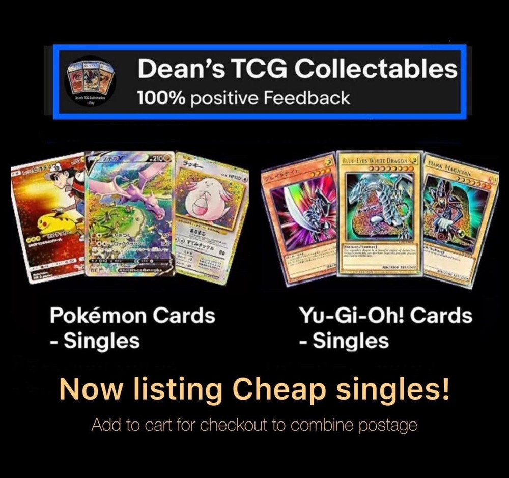 Welcome to Deans TCG Collectables Ebay! We pride ourselves in providing a wide variety of trading cards at competitive prices! Please read description to ensure you are happy with our policies. Postage We do not charge for standard domestic shipping! (Australia wide) Upgrading to express incurs an additional cost All orders will be sent with the upmost care and protection - your cards are in good hands! All orders over $15.00 AUD will be sent with a Priority Post Label - This is so you can have your cards quicker! At our discretion, higher end cards may be upgraded to a bigger / more secure box to ensure maximum protection (at our cost). Photos / Scans We have high quality scans and photos of all cards and graded cards listed - If you would like more pictures, please reach out and I will be happy to facilitate. Ungraded Cards Single Cards (Raw) - You will receive a card of similar condition & quality that the listing images show or in most cases the listed card itself. If it is not the exact card pictured, it will still reflect the condition stated in the listing. Card Conditions Ungraded cards will be carefully placed into 4 categories as reflected by ebays condition scale. Near Mint or Better (NM) - Cards in this condition will be in great condition, ranging from near mint to mint (flawless). Miniscule defects may be visible. Lightly Played (LP) - Cards in this condition may have some minor to moderate edgewear and light scratching on surface. Moderately Played (PLD) - Moderately played cards will be more visibly scuffed. you'll notice more significant signs of use, however this condition is still great for binder cards! Heavily Played/Damaged (HP) - Cards in this condition show extensive wear, including creases and heavy surface damage Returns and Refunds If you would like to return an item, please contact us first. Please note that all postage costs, packaging costs, import duty, taxes & charges incurred during the return process is to be paid for by the buyer (Unless we are at fault). Issues / Concerns If you have any issues or concerns, please make contact first. In 99% of cases will work with the buyer to make it right. Please hold off leaving feedback in these situations until the issue is resolved. Our Store and reputation is important to us. No returns are accepted for international sales. Thankyou! We enjoy engaging with all people who love this hobby and take extra care to ensure you purchase is handled safetly and swiftly. Thank you for your support. If you have any questions, requests or inquiries, please do not hesitate to get in touch with us. Happy Collecting!