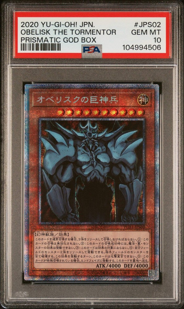 πππ OBELISK THE TORMENTOR PGB1 -JPS02 PSA 10 YU-GI-OH! HOLO 2020 JAPANESE This card is officially graded.Combined shipping is available for all items.Please enquire if you require additional information/photos about the item.Follow me on Instagram! πππ OBELISK THE TORMENTOR PGB1 -JPS02 PSA 10 YU-GI-OH! HOLO 2020 JAPANESE This card is officially graded. Combined shipping is available for all items. Please enquire if you require additional information/photos about the item. Follow me on Instagram! Γ Γ Γ Γ Γ Γ Buy now and save! Shipping info Click the Shipping & Payments tab above the listing description for more info Click the Shipping & Payments tab above the listing description for more info! Additional delivery notes PICK UP OPTION Sorry, our items are NOT available for pick-up. PAYMENT Immediate payment is required upon selecting "Buy It Now" or upon checking out through the cart. We accept payment via All Major Credit Cards (Visa, Mastercard, AMEX, Discover), Google Pay, PayPal, & Apple Pay (on mobile & eBay App). Thank you for shopping with us on eBay! Additional Information No additional information at this time Ask seller a question You might also like πππ GALAR FRIENDS 258/184 PSA 10 POKEMON VMAX CLIMAX JAPANESE FULL ART SR πππ YUGIOH - PSA 10 - CYBER DRAGON INFINITY - JP021 - PRISMATIC ALT ART JAPAN πππ YUGIOH - PSA 10 - BLUE EYES WHITE DRAGON - JP012 - PRISMATIC GOD BOX JAPA πππ YUGIOH - PSA 10 - FORTUNE LADY EVERY - JP038 - 20TH SECRET RARE JAPANESE Contact To contact our Customer Service Team, simply click the button here and our Customer Service team will be happy to assist. Ask seller a question Β© PokemonSteve Shipping & Payments Click the Shipping & Payments tab above the listing description for more info Payment Accepted Payment Methods Immediate payment is required upon selecting "Buy It Now" or upon checking out through the cart. We accept payment via All Major Credit Cards (Visa, Mastercard, AMEX, Discover), Google Pay, PayPal, & Apple Pay (on mobile & eBay App). Thank you for shopping with us on eBay! Returns Returns are accepted Items must be returned within 30 days of the auction ending Seller will pay for return shipping. eBay integration by