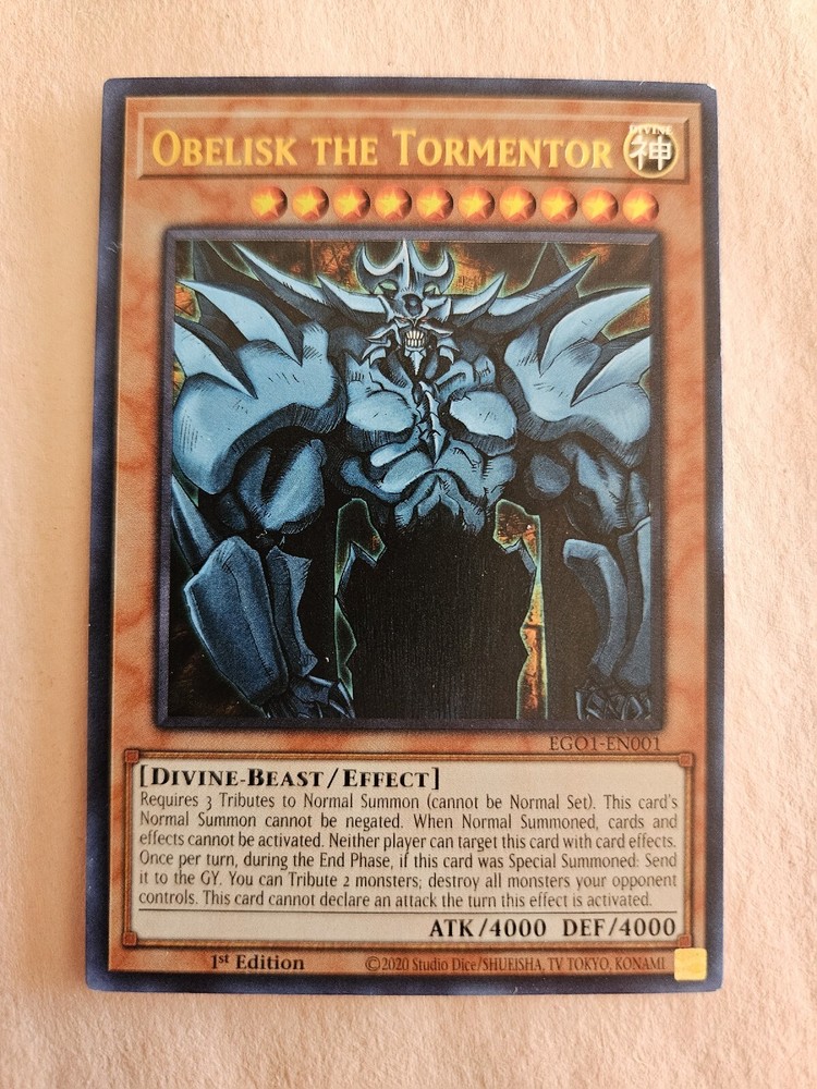 You are bidding on a OBELISK THE TORMENTOR-1ST EDITION ULTRA RARE-EGO1-EN001 These cards are not graded but in very good condition. You get the card shown in the pictures. I will ship your card in a top loader, bubble wrap then cardboard mailer. I will combine shipping. My shipping price is $2.99 for up to 9 regular thickness cards and $3.99 and up for anything over 10 cards in Canada. $15.49 for USA. Payment must be made within 3 days of purchase. I will ship no later than 2 business days after receiving payment. I don't ship on Saturday or Sundays. To ALL my customers, please be patient as the mail has slowed down due to the VIRUS. THANK YOU for your patience and understanding. Be safe!! There is a delay at customs, my US customers, please note it could take up to 60 days to receive your cards. If you have any questions, please don't hesitate to contact me. Please check out my other items at Jethro's cards and collectibles. Have a great day, cheers! J'expédierai votre carte dans un top loader, du papier bulle puis un mailer en carton. Je vais combiner l'expédition. Mon prix d'expédition est de 2,99 $ pour un maximum de 9 cartes d'épaisseur régulière et de 3,99 $ et plus pour tout ce qui dépasse 10 cartes. Le paiement doit être effectué dans les 3 jours suivant l'achat. J'expédierai 2 jours ouvrables après réception du paiement. Je ne livre pas le samedi ou le dimanche. À TOUS mes clients, veuillez être patient car le courrier a ralenti en raison du VIRUS. Merci pour votre patience et votre compréhension. Fais attention!! Si vous avez des questions, n'hésitez pas à me contacter. Veuillez consulter mes autres articles sur les cartes et objets de collection de Jethro. Bonne journée, bravo!