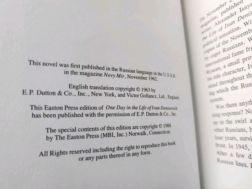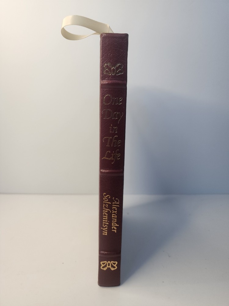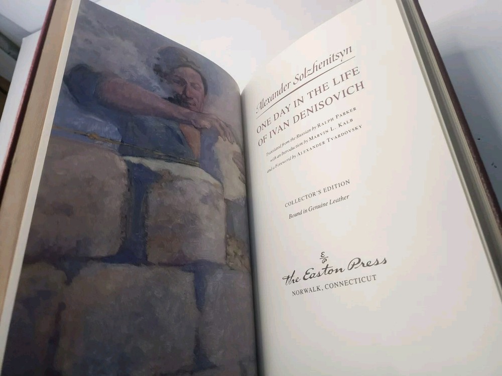 One Day in the Life of Ivan Denisovich by Alexander Solzhenitsyn Easton Press ~ Collector's Edition 1st Edition thus Beautifully bound in Leather w/ raised bands and gold gilt edges and board design Illustrated frontispiece in color Easton Press, 1988. VG+. Interior clean and tight. Light shelf wear . A classic collectible.