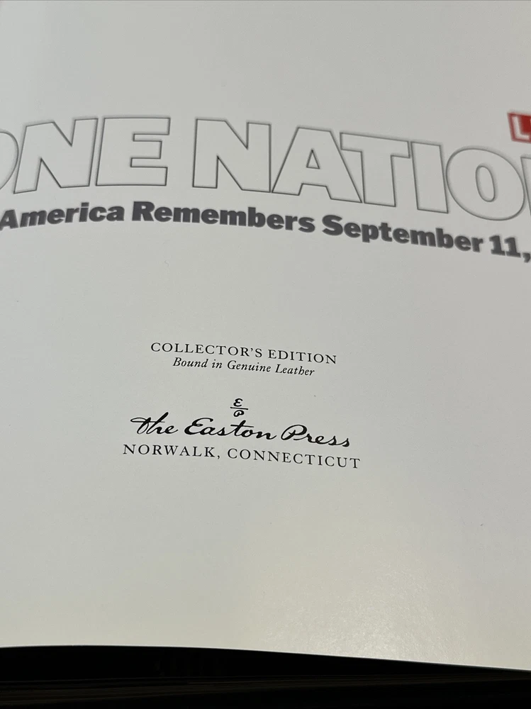 ONE NATION America Remembers 9/11 2001 First Edition Easton Press Collector's Ed. 📝Welcome to the ITEM DESCRIPTION! 📝 Here you will find additional details pertaining to your specific item. If for whatever reason you have any further questions regarding the product, feel free to do so! **** Please let us know if you would like to request for more photos or more details. Examples being watermarks, page folds, foxing, page tears, etc. 🔬Additionally, please zoom in/out of all pictures before purchasing as they are part of the description of this item/set. **** Return Policy: Your satisfaction is important to us. We accept returns!! Buyer pays for return shipping fees. Shipping: 📪📫📬📠We mainly have our domestic shipping by USPS MEDIA MAIL OR USPS PRIORITY MAIL. If you can wait for your orders to arrive a little longer, we can certainly change this to USPS RETAIL GROUND or any other shipping methods so you can save on shipping costs. Don’t hesitate to ask if you have any requests that isn’t our main shipping method or if you have any special requests in the packaging process of the product you desire. 📦 International buyers – please note: Import duties, taxes, and charges are NOT included in the item price or postage cost. These charges are the buyer's responsibility. 📦 Please check with your country's customs office to determine what these additional costs will be prior to bidding or buying.📦 **** Feedback Request: 💬 Our business will continue to thrive with your feedback. If you are unhappy with any of our products, please contact us so we can resolve any issues that may arise. **** Thank you so much for your time and interest in any of our products ! Sincerely, - The Whitewood Team