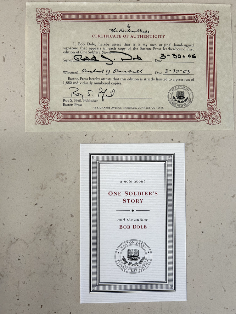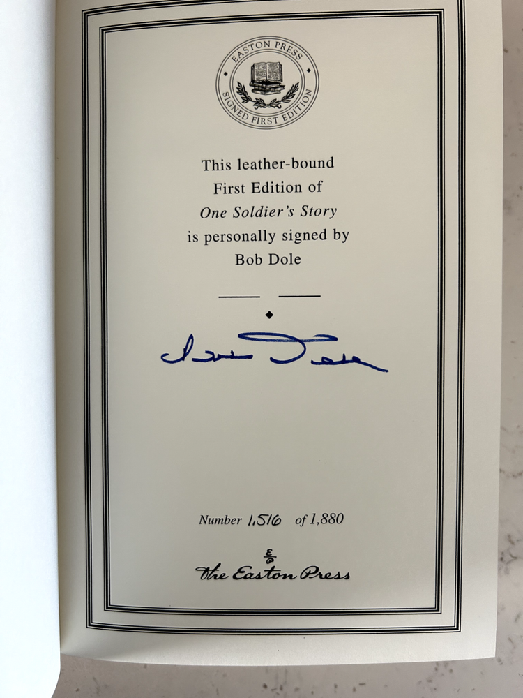 One Soldier's Story by Bob Dole Signed leather bound edition w/ COA numbered 1,516 of 1,880 Like New - book has not been read, no bent pages Easton Press "Signed First Editions" (2008) Bound in fine genuine leather with 22K gold page edges Archival quality acid-free paper Domestic shipping only Returns accepted within 30 days